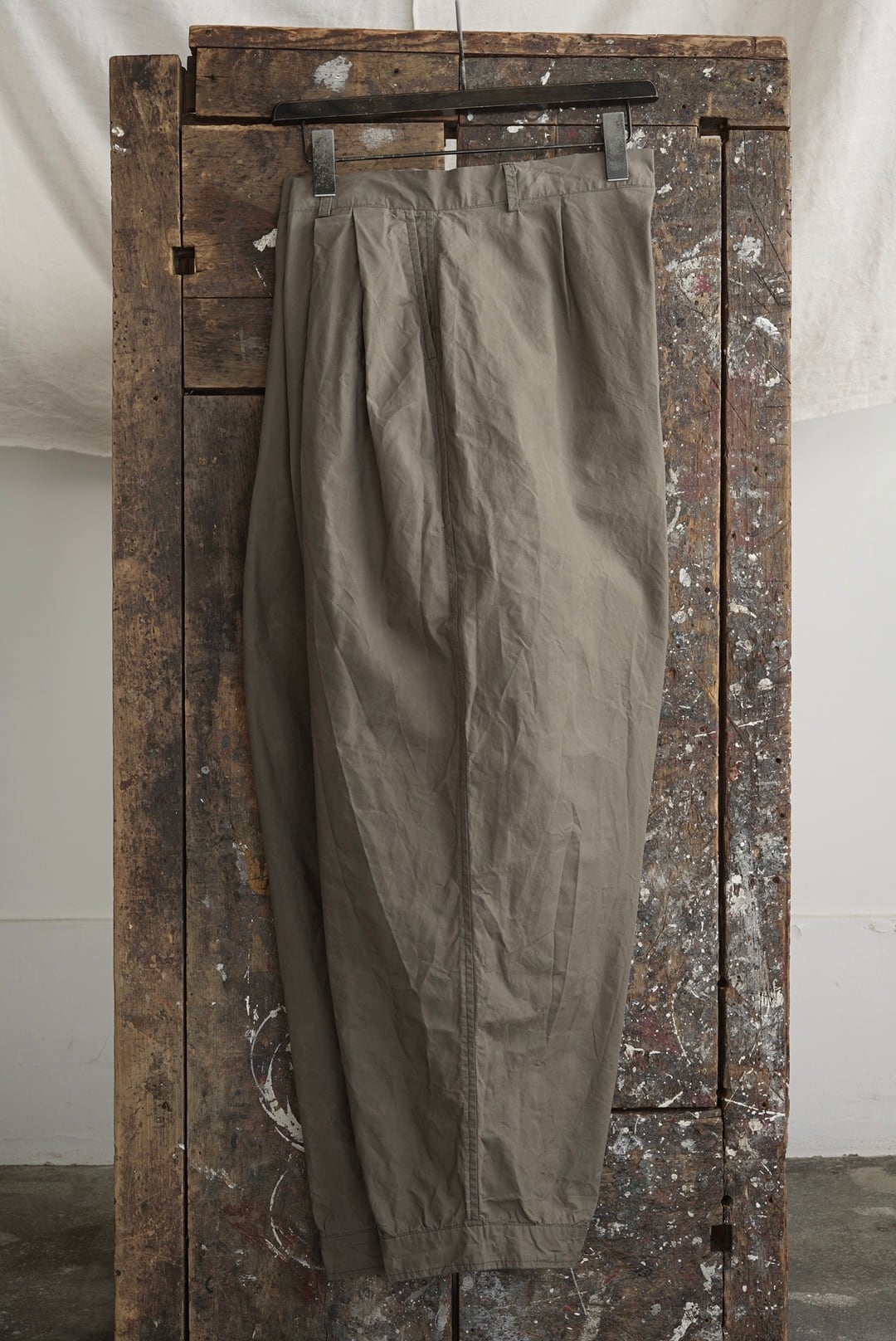 スコットランド製、ライトウェイトのワックスコットン。ベタついた感触の少ない快適な仕上げの生地は、着こむほどに身体に馴染みソフトに、そして味のある風合いへと変化するファブリック。経年変化へのエントリーとして、製品をハードウォッシュ、程よくワックスが抜けることで、光沢と掠れがシワ感と共にないまぜになり小慣れた印象。ボタンフライ&ベルトループ付き、クラシック仕様のトラウザーズ。ウエストフロントに2タック・バックに1タック、ゆとりのある股上の設計、ナチュラルな膨らみから緩やかに裾にかけて収まるテーパードレッグのシルエットは着馴染みが良く幅広いスタイルにマッチ。サイドポケットに加え、バックに1ポケットのデザインは洗練された実用的をプラス。作り手の愛着を感じる、手間暇をかけた手縫いのボタンホール。穏やかでシックな「モカ」カラー。アンサンブルスタイルに同色のコートも展開しています。