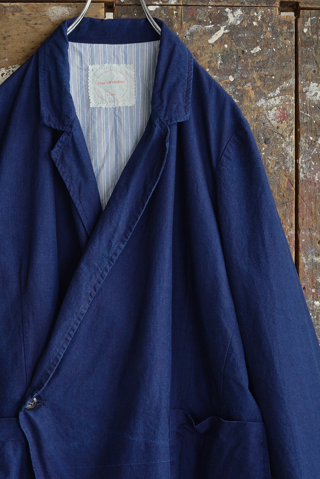 「Chez VIDALENC」のシグネチャーアイテム、「JACKET P3」のダブルブレステッドVER.「PORTO K」を、過去のアーカイブを元にリ・オーダー。フロント1ボタン/ノッチドラペル/筒袖 /ノーベント/パッチポケット仕様、硬派な印象よりもカーディガンや半纏などのカジュアルな使い勝手のデザイン。インディゴを使い染色されたコットンキャンバスファブリック。イタリアンコットンを用いたファブリックは、なめらかな肌触りに細糸ならではのシャリ気が特徴で、光沢感を持ち鮮やかな彩度を映えさせる上品な仕上がりです。それらは製品洗いの工程を経て、カラーフェードやアタリが起こり、表情が現れることで「Chez VIDALENC」らしいワークテイストとエスプリがプラス。デザインの隠し味としてジャパニーズストライプを背裏と袖裏にライニング。デザイナーフィリップからのメッセージは、これが完成ではなく、着用と洗いを繰り返し各々のインディゴエイジングを楽しむガーメント。とのことです。