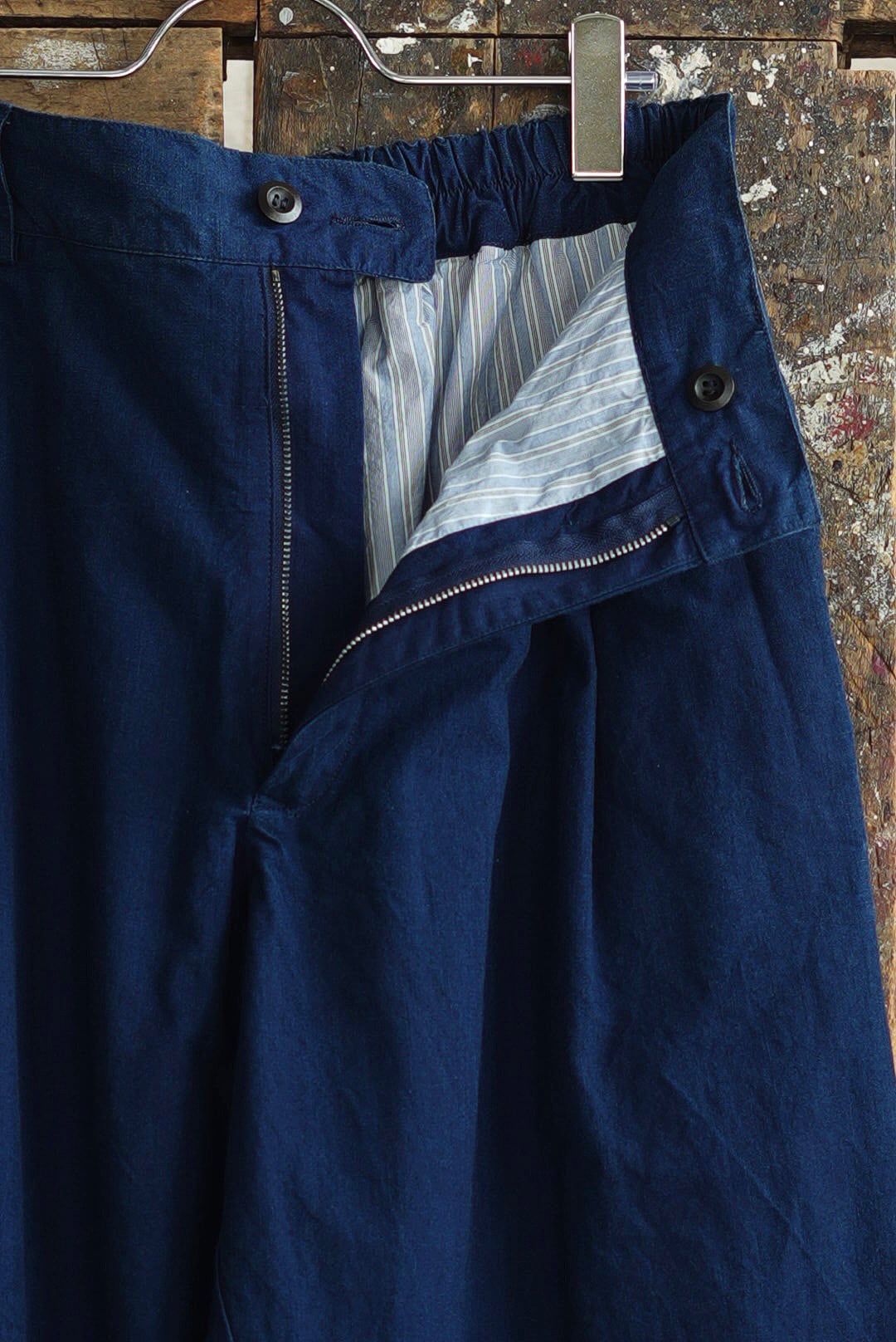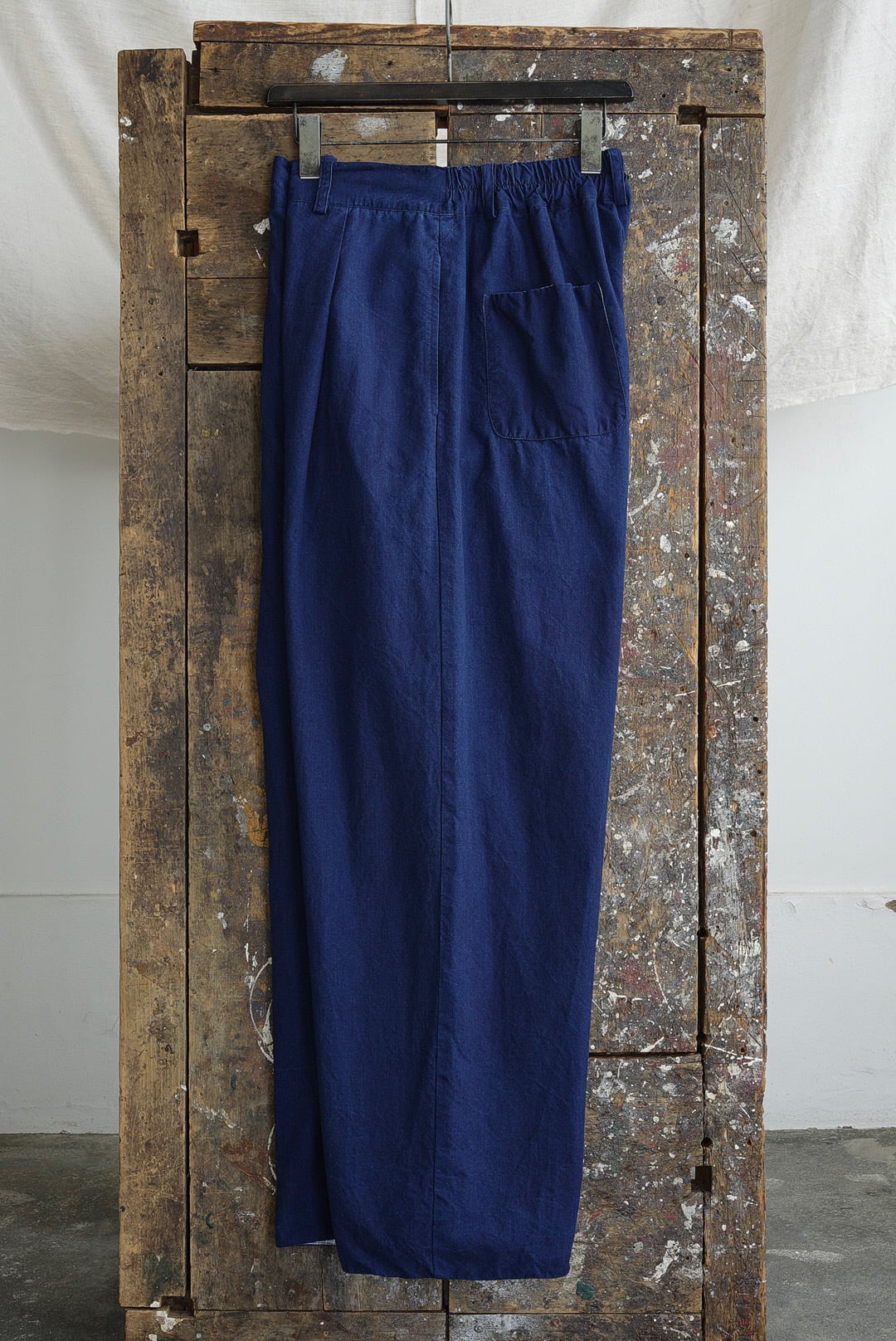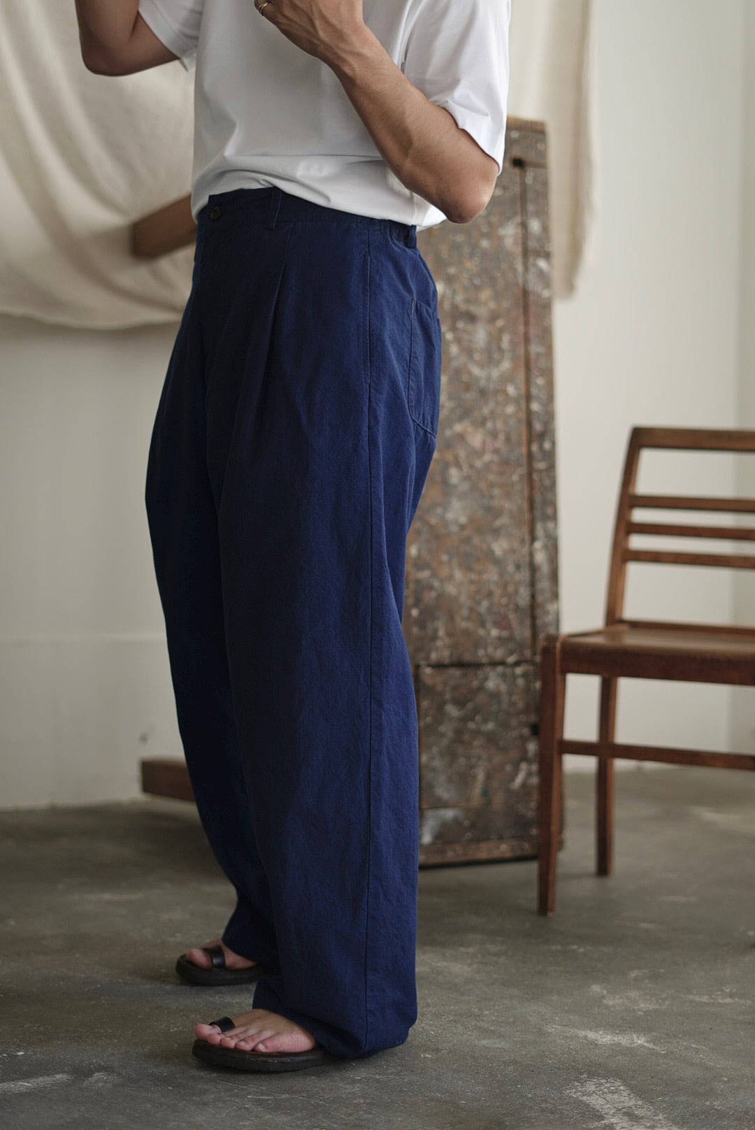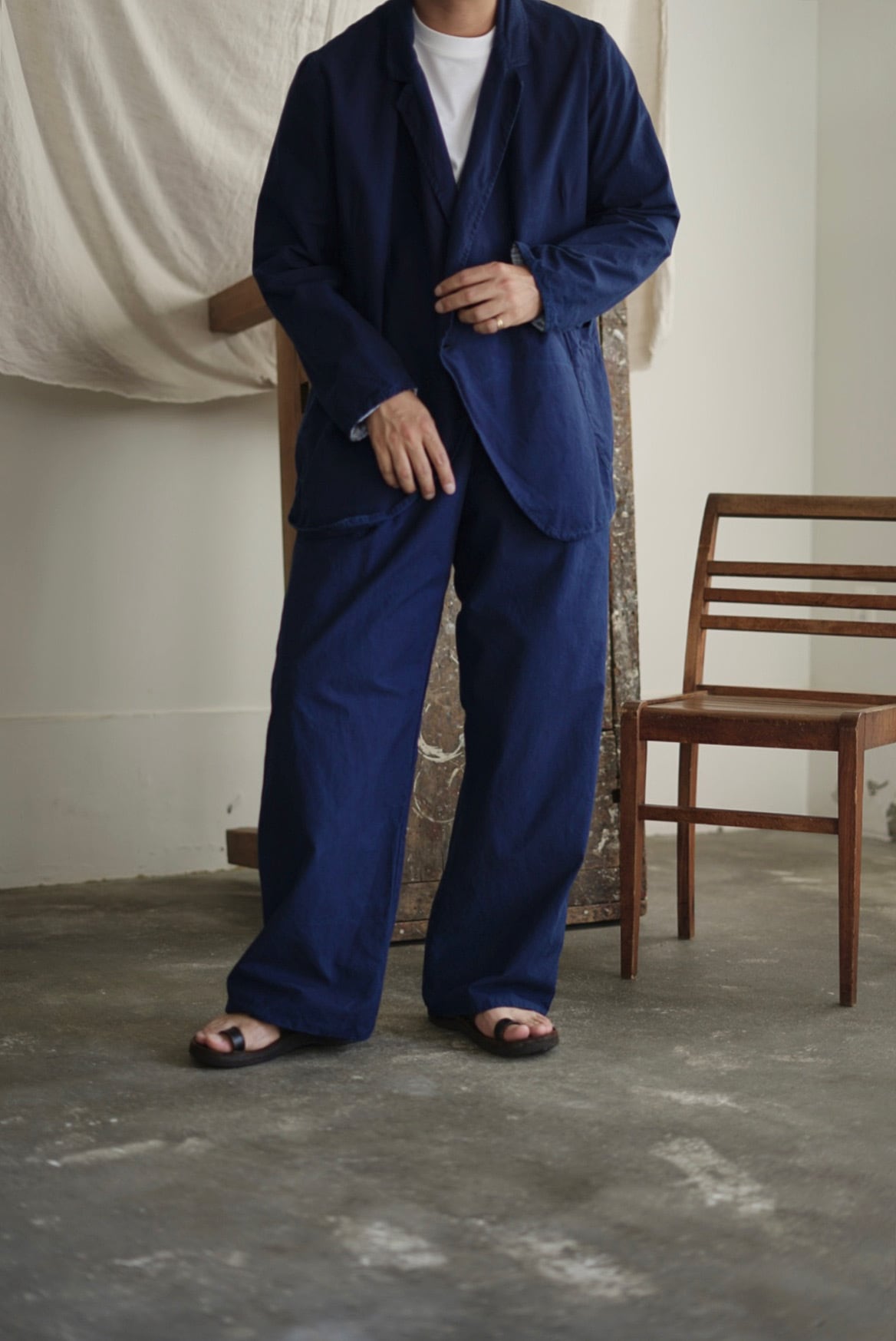 ワンタック、リラックスしたストレートシルエットの「PANTS GARY」。ベルトループ付き、バック部分はエラスティック仕様の軽快な着用感。フロントジッパーフライ。角をおとしたシングルステッチのヒップパッチポケット。使い勝手の良いカジュアルなワークパンツです。インディゴを使い染色されたコットンキャンバスファブリック。イタリアンコットンを用いたファブリックは、なめらかな肌触りに細糸ならではのシャリ気が特徴で、光沢感を持ち鮮やかな彩度を映えさせる上品な仕上がりです。それらは製品洗いの工程を経て、カラーフェードやアタリが起こり、表情が現れることで「Chez VIDALENC」らしいワークテイストとエスプリがプラス。デザインの隠し味としてジャパニーズストライプをフルライニングしています。デザイナーフィリップからのメッセージは、これが完成ではなく、着用と洗いを繰り返し各々のインディゴエイジングを楽しむガーメント。とのことです。
