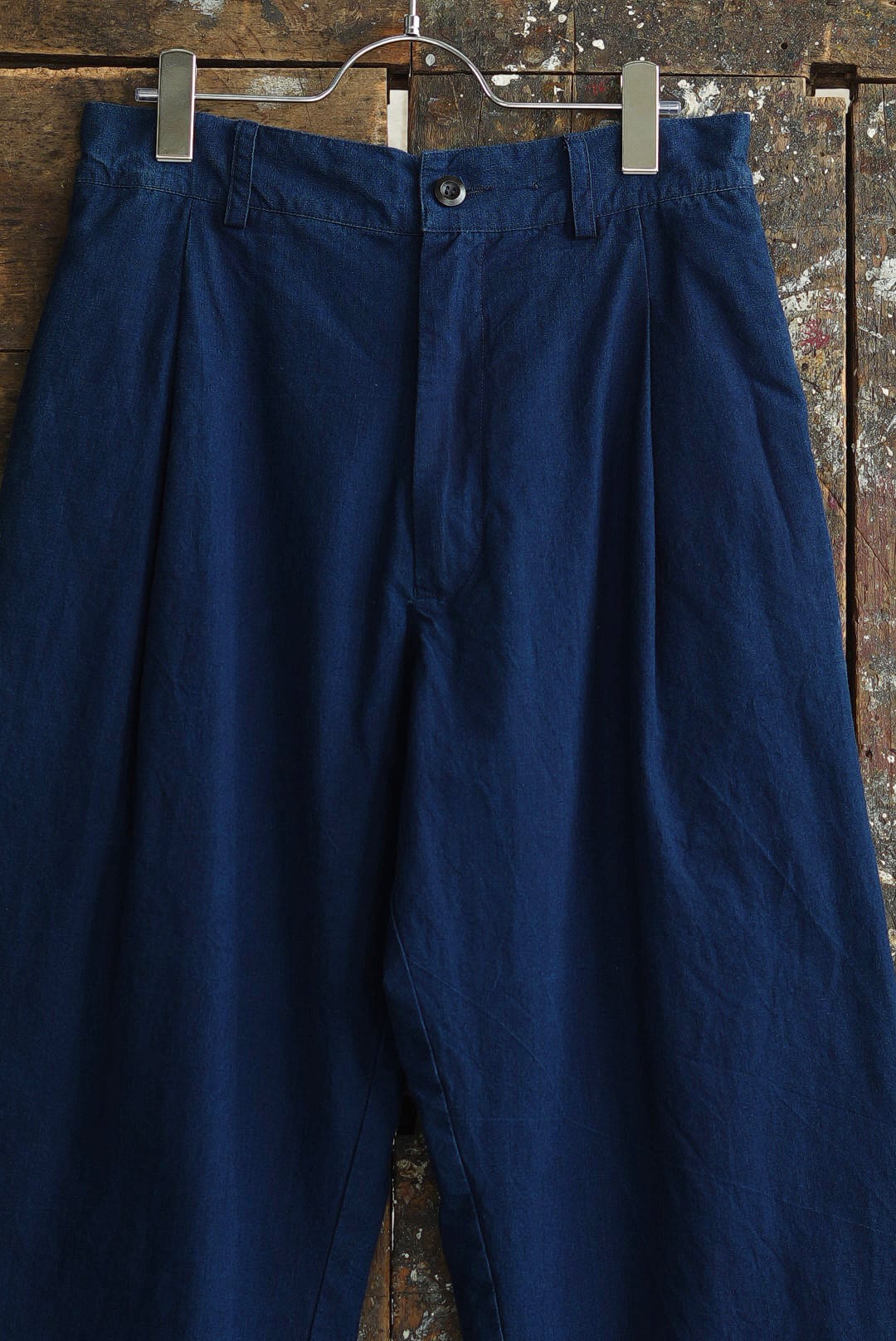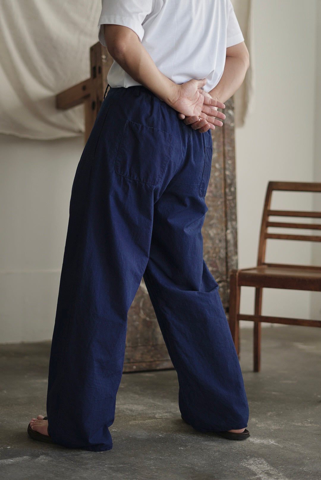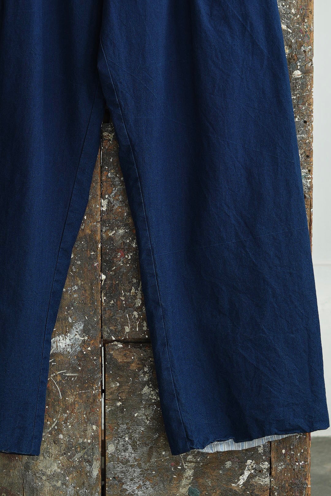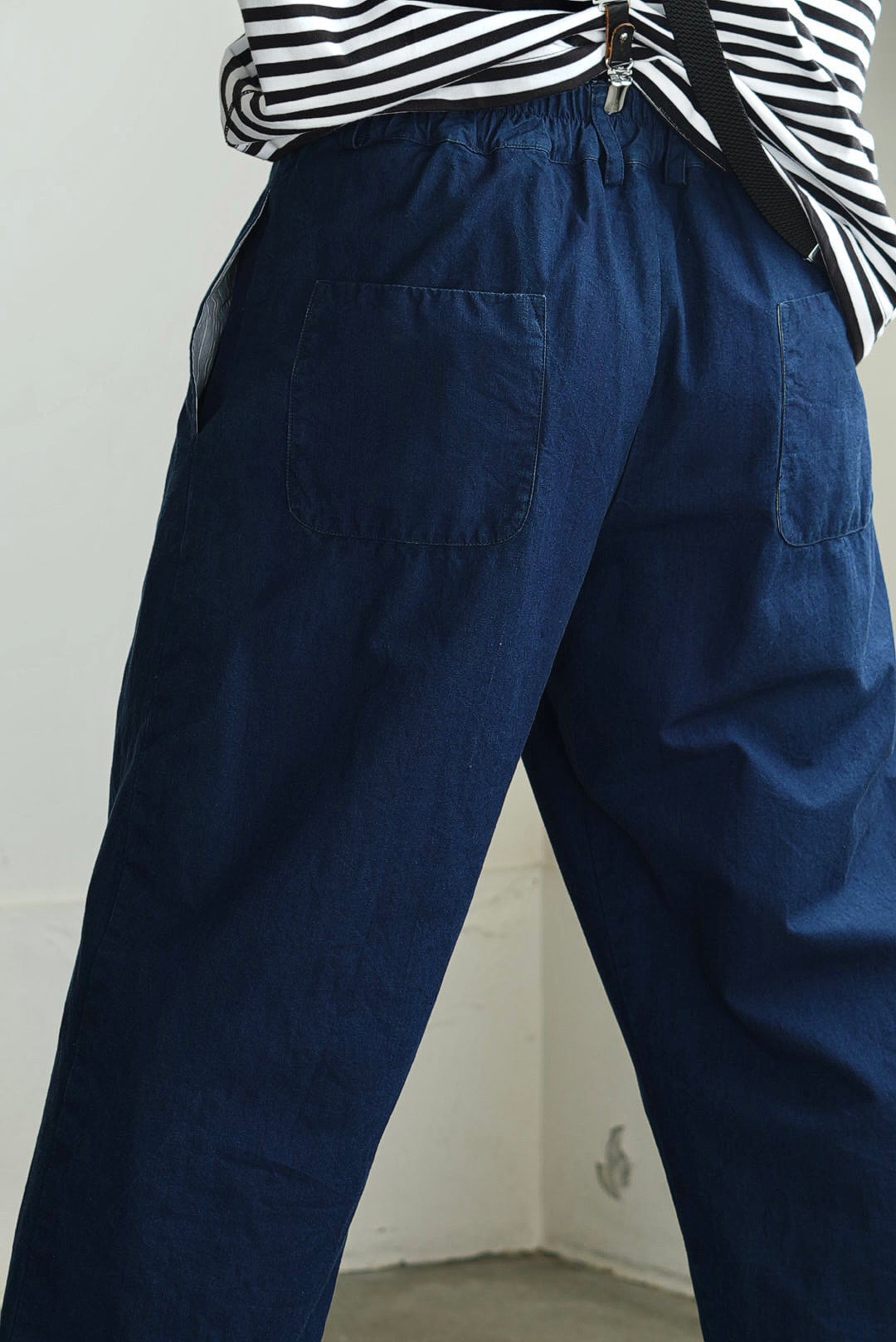 ワンタック、リラックスしたストレートシルエットの「PANTS GARY」。ベルトループ付き、バック部分はエラスティック仕様の軽快な着用感。フロントジッパーフライ。角をおとしたシングルステッチのヒップパッチポケット。使い勝手の良いカジュアルなワークパンツです。インディゴを使い染色されたコットンキャンバスファブリック。イタリアンコットンを用いたファブリックは、なめらかな肌触りに細糸ならではのシャリ気が特徴で、光沢感を持ち鮮やかな彩度を映えさせる上品な仕上がりです。それらは製品洗いの工程を経て、カラーフェードやアタリが起こり、表情が現れることで「Chez VIDALENC」らしいワークテイストとエスプリがプラス。デザインの隠し味としてジャパニーズストライプをフルライニングしています。デザイナーフィリップからのメッセージは、これが完成ではなく、着用と洗いを繰り返し各々のインディゴエイジングを楽しむガーメント。とのことです。