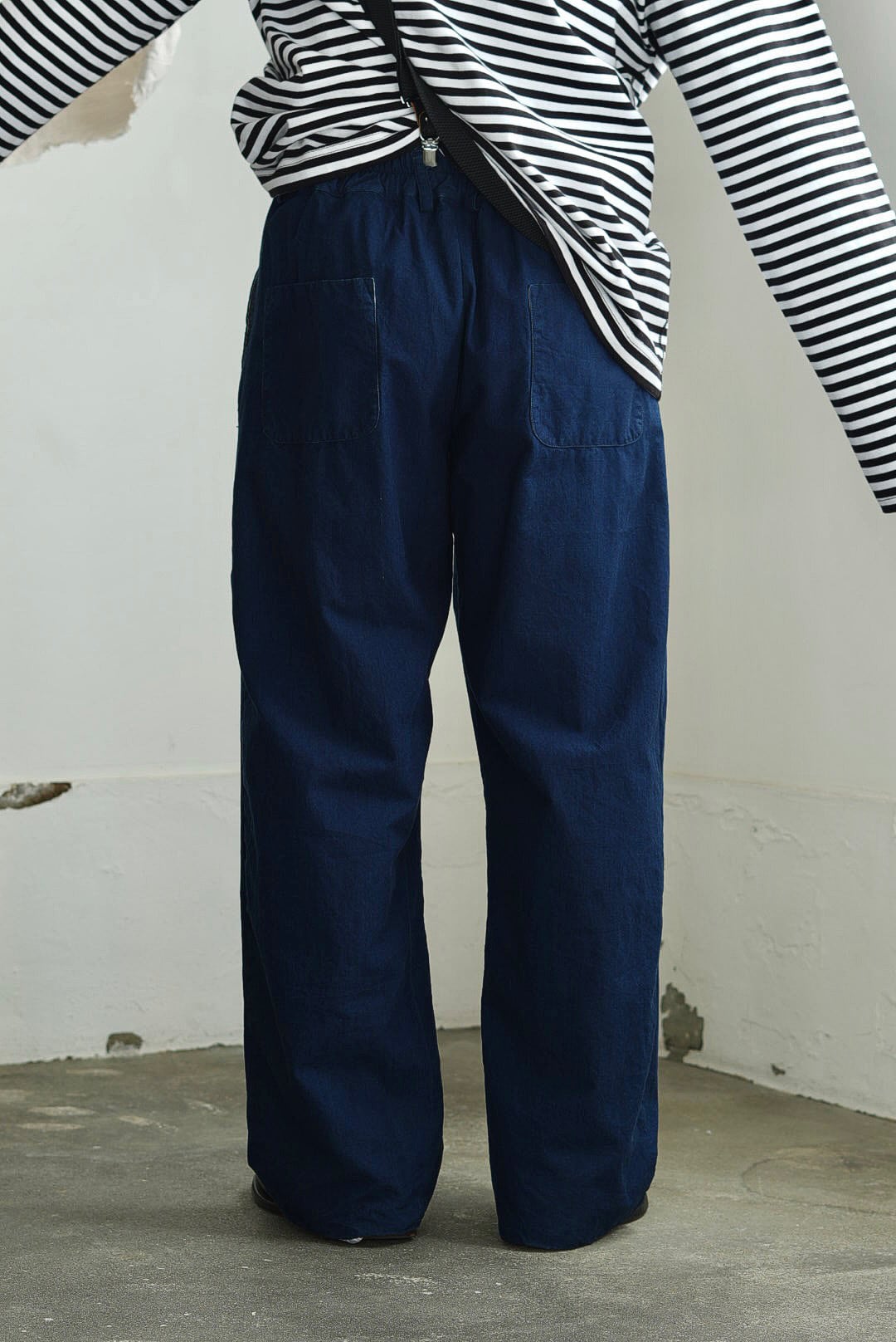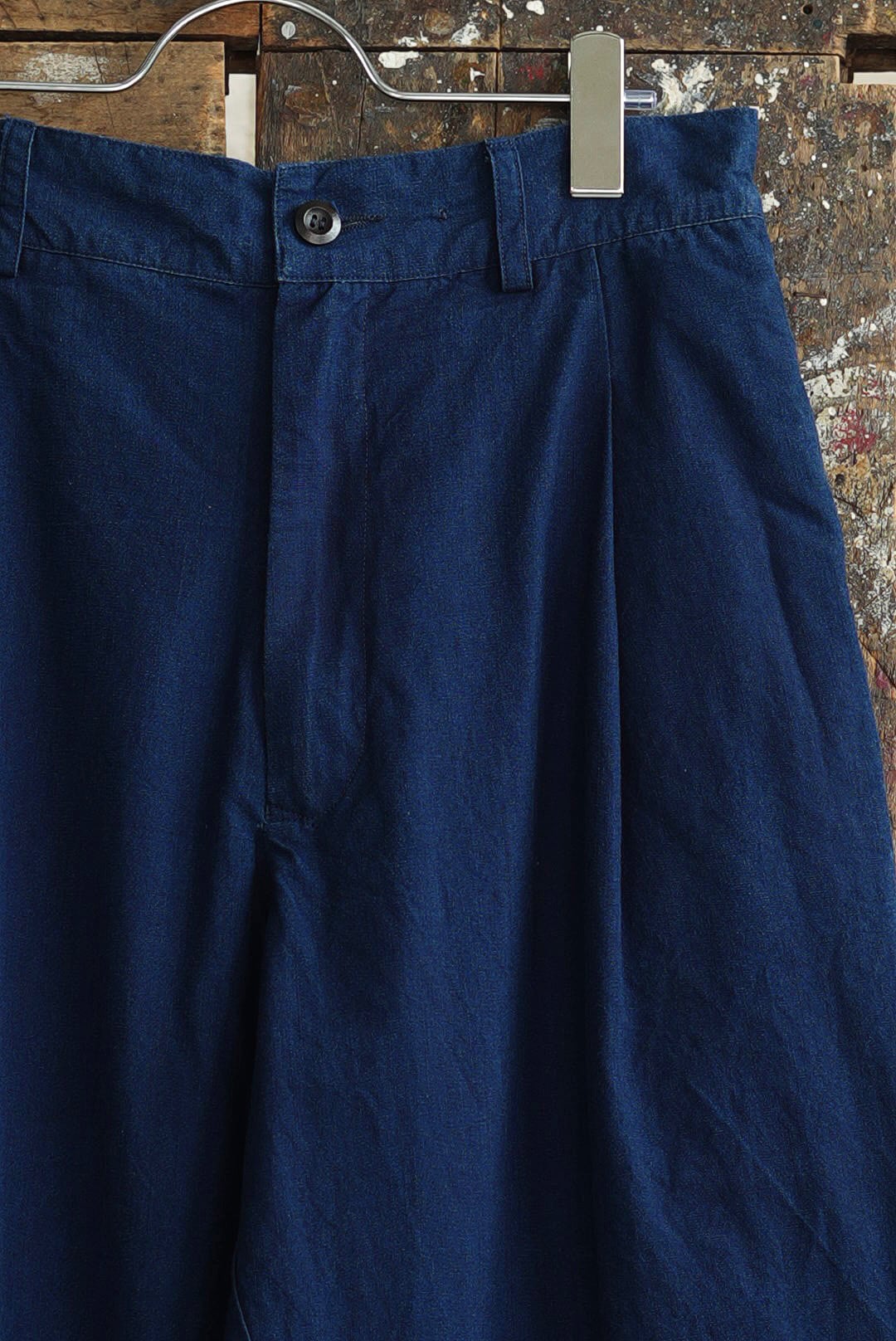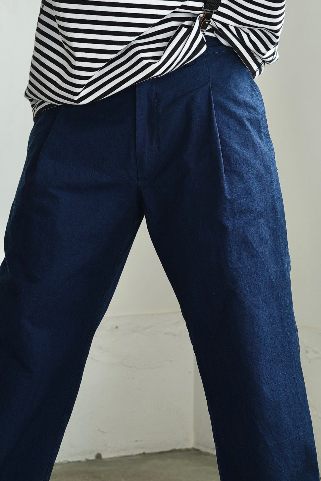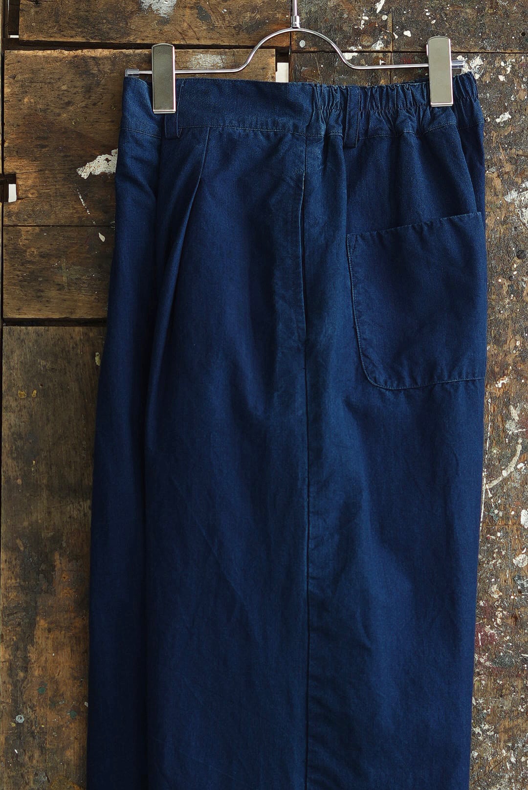 ワンタック、リラックスしたストレートシルエットの「PANTS GARY」。ベルトループ付き、バック部分はエラスティック仕様の軽快な着用感。フロントジッパーフライ。角をおとしたシングルステッチのヒップパッチポケット。使い勝手の良いカジュアルなワークパンツです。インディゴを使い染色されたコットンキャンバスファブリック。イタリアンコットンを用いたファブリックは、なめらかな肌触りに細糸ならではのシャリ気が特徴で、光沢感を持ち鮮やかな彩度を映えさせる上品な仕上がりです。それらは製品洗いの工程を経て、カラーフェードやアタリが起こり、表情が現れることで「Chez VIDALENC」らしいワークテイストとエスプリがプラス。デザインの隠し味としてジャパニーズストライプをフルライニングしています。デザイナーフィリップからのメッセージは、これが完成ではなく、着用と洗いを繰り返し各々のインディゴエイジングを楽しむガーメント。とのことです。