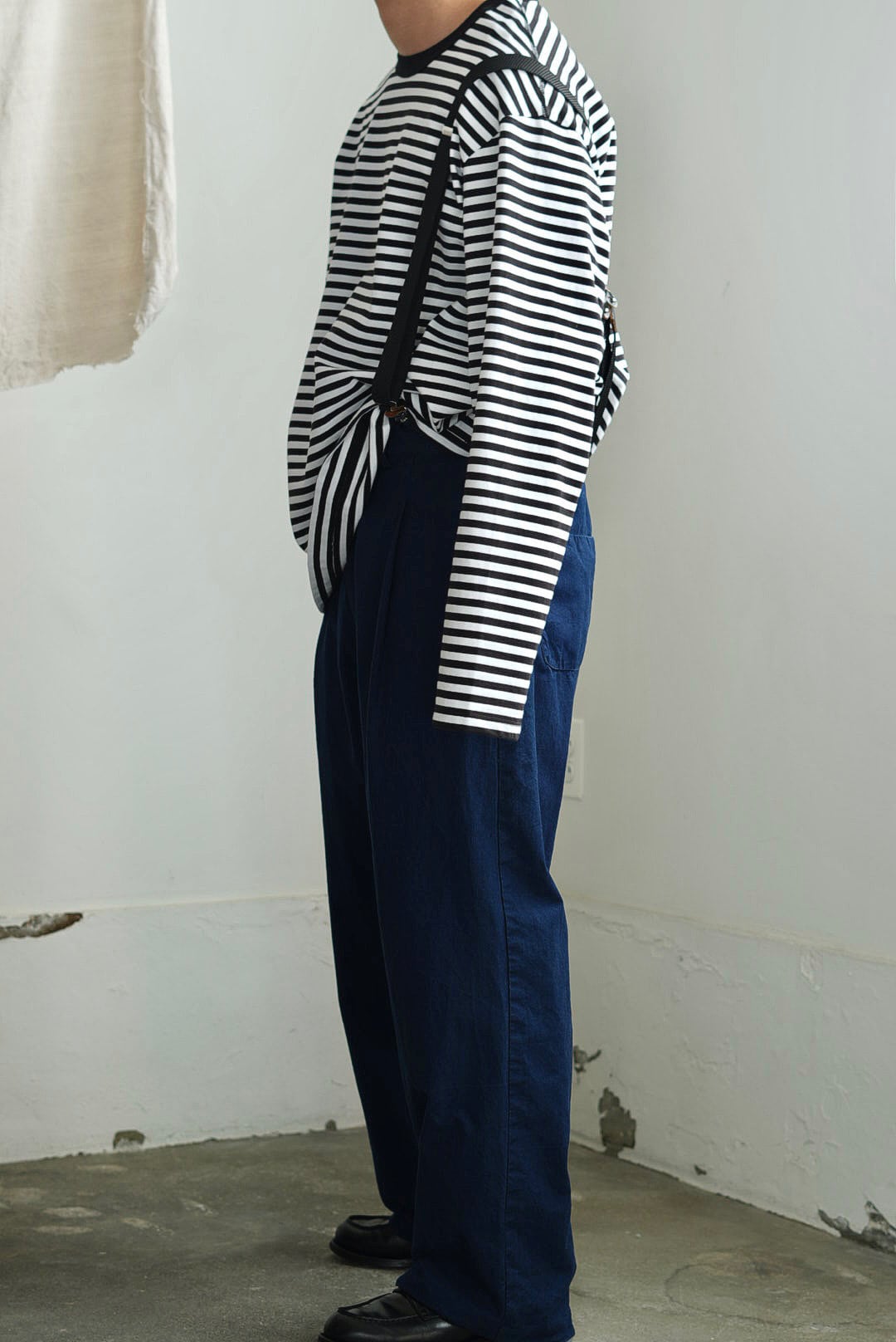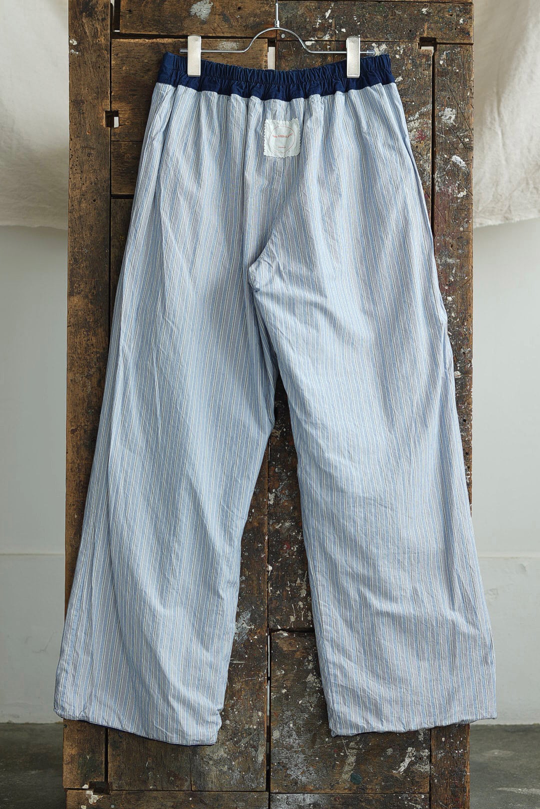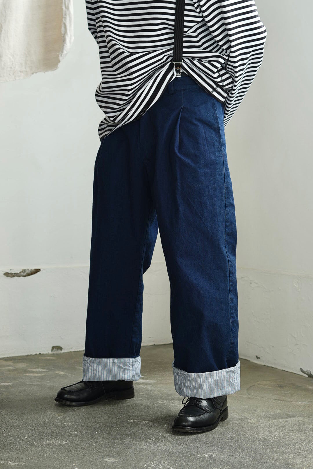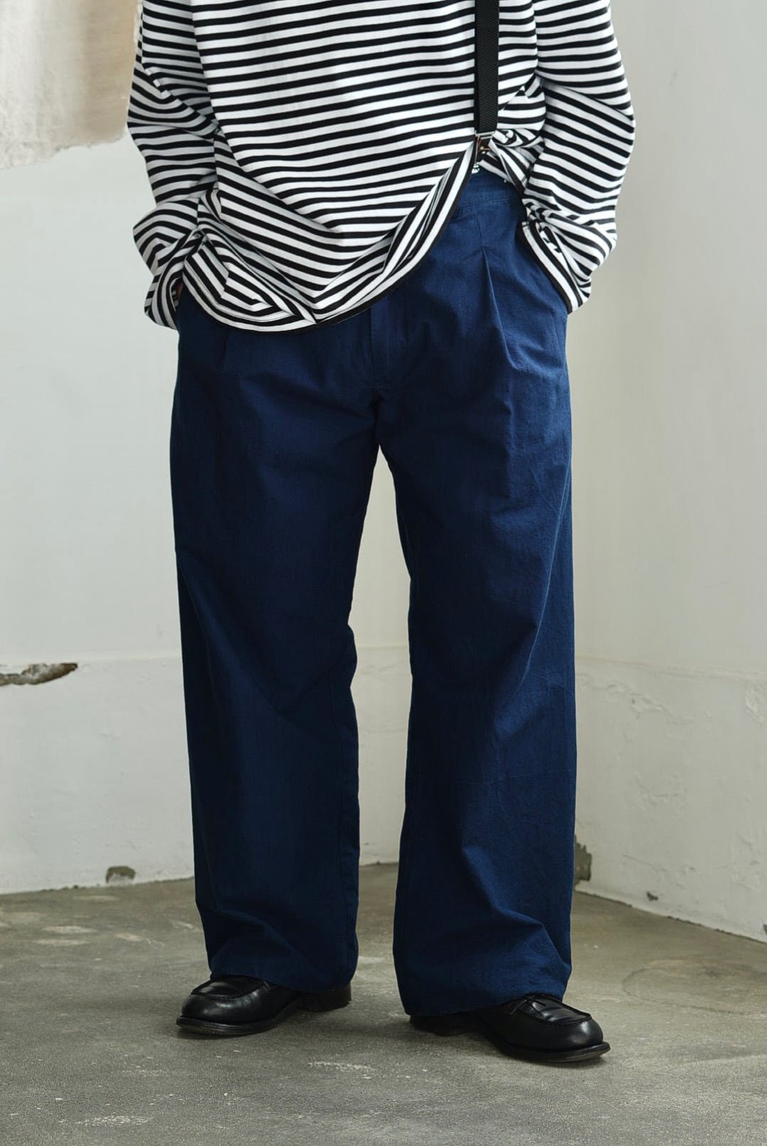 ワンタック、リラックスしたストレートシルエットの「PANTS GARY」。ベルトループ付き、バック部分はエラスティック仕様の軽快な着用感。フロントジッパーフライ。角をおとしたシングルステッチのヒップパッチポケット。使い勝手の良いカジュアルなワークパンツです。インディゴを使い染色されたコットンキャンバスファブリック。イタリアンコットンを用いたファブリックは、なめらかな肌触りに細糸ならではのシャリ気が特徴で、光沢感を持ち鮮やかな彩度を映えさせる上品な仕上がりです。それらは製品洗いの工程を経て、カラーフェードやアタリが起こり、表情が現れることで「Chez VIDALENC」らしいワークテイストとエスプリがプラス。デザインの隠し味としてジャパニーズストライプをフルライニングしています。デザイナーフィリップからのメッセージは、これが完成ではなく、着用と洗いを繰り返し各々のインディゴエイジングを楽しむガーメント。とのことです。