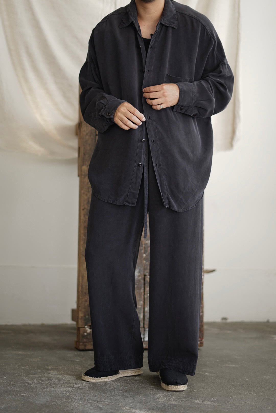「Chez VIDALENC」のシグネチャーアイテム。ドレープを生み出すワイドシルエットの「SHIRT AXL」。シャツに落ち感を経たなびきを求めて、今モデルはSILK CDCを採用。程よく厚手でシワになりにくく、滑らかな極上の肌当たりとシボのある表情豊かなシルクファブリックは"クレープデシン"と呼ばれ、60年程前からクチュールデザイナーやレッドカーペットのセレブリティに愛用される歴史のある生地です。魅力に富むテクスチャーをダイレクトに感じてもらえるアンライニング仕様。男臭くも色気のある雰囲気を醸し出す、フェード気味のブラックカラー。ガーメントダイ(製品染)の工程において、ステッチが締まり縮絨しパッカリングが細部にあらわれることで、気取りのない印象が加わります。アンティークガラスボタンのディティール。
