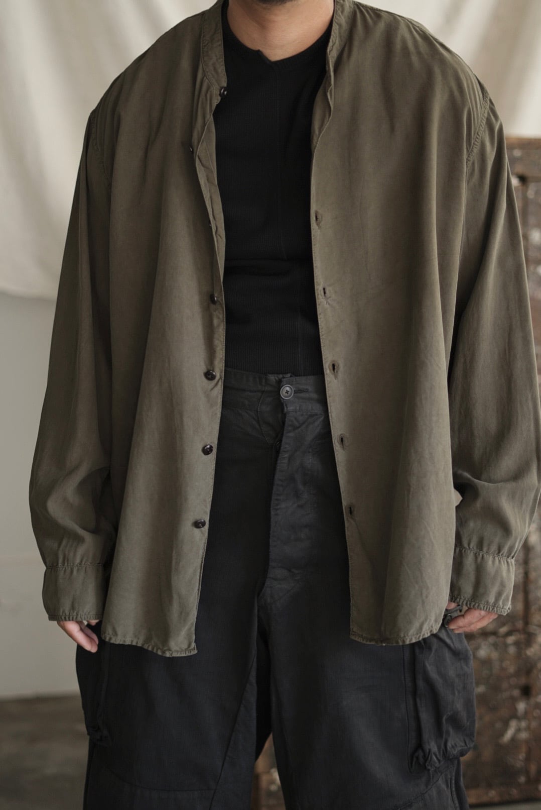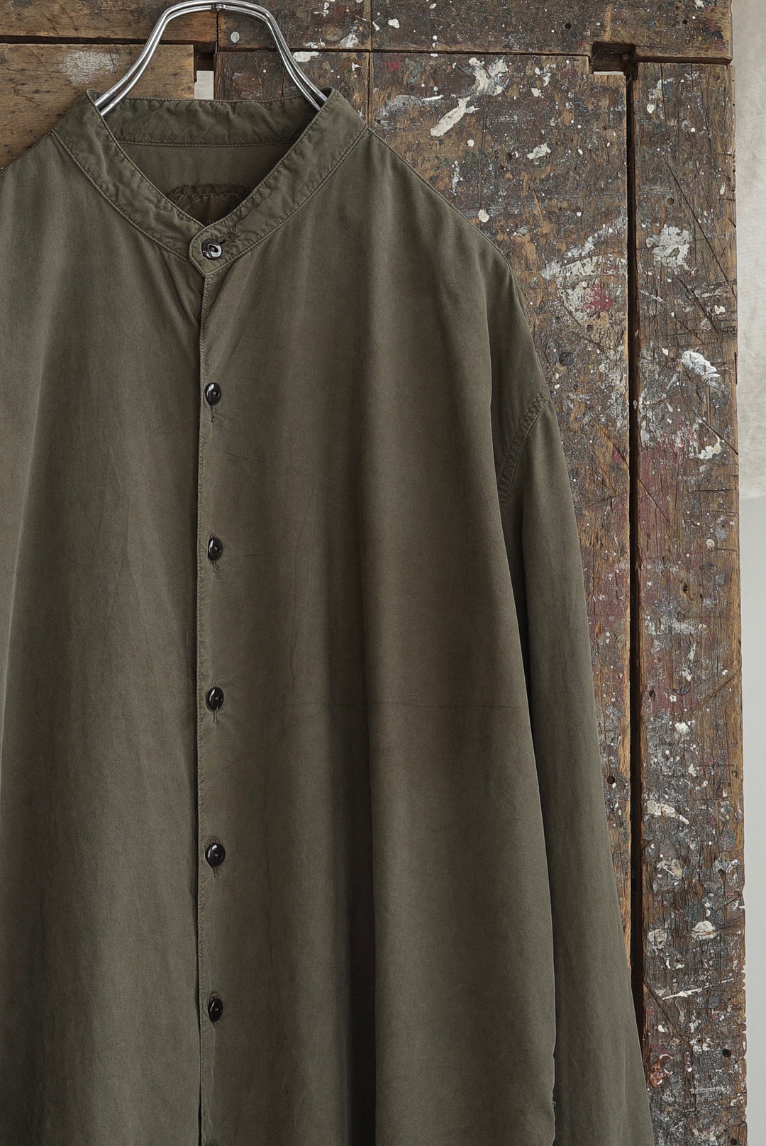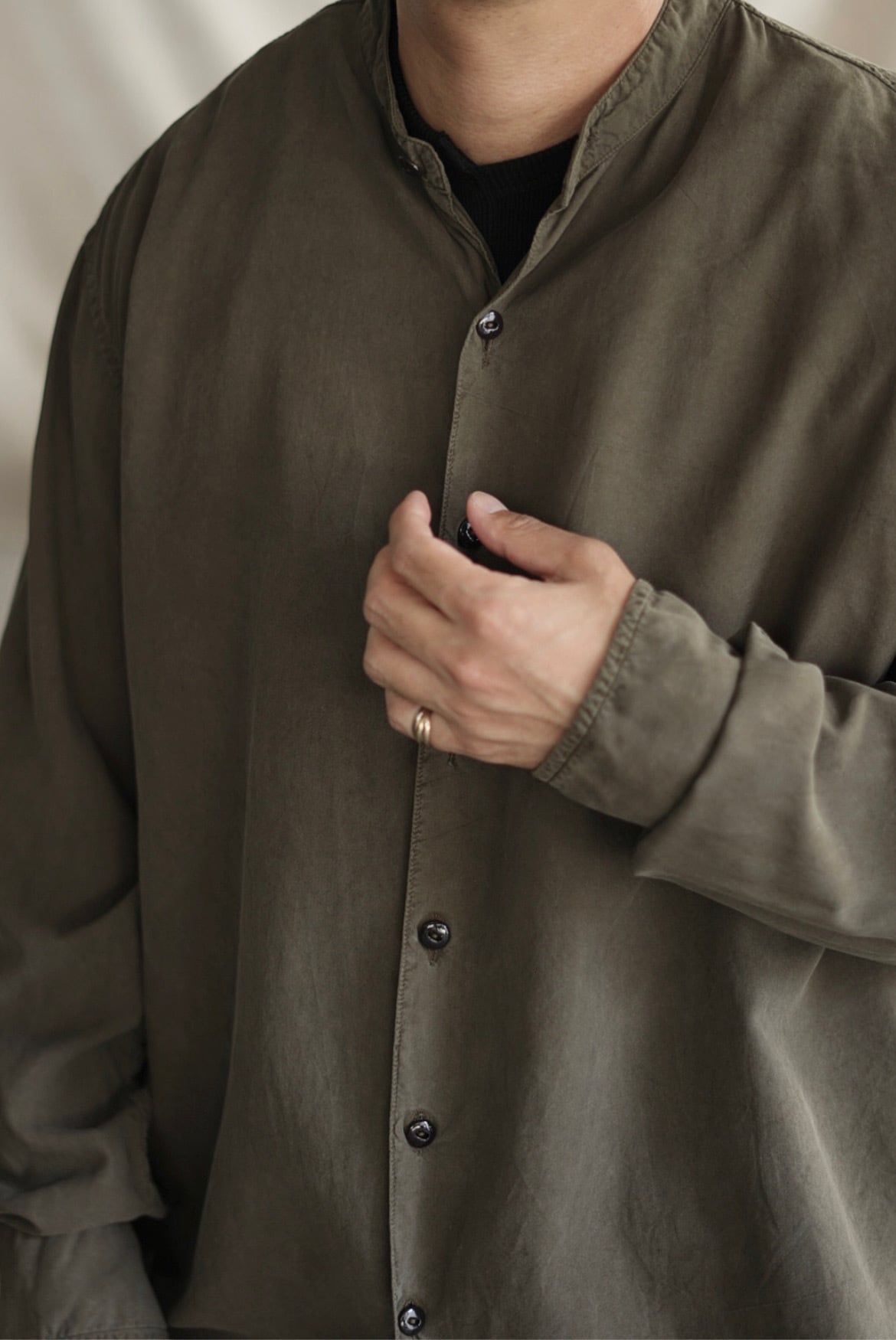 ワークスタイルベース、気取りのないデザインのカラーレスシャツ。シルクの肌当たりにコットンライクなテクスチャーのニュアンスが入り混じる、贅沢にも敢えて光沢を抑えたシルクマットファブリックを使用。カスレやムラを帯びる、ガーメントダイ(製品染め)によるオリーブカラー。クスミのある発色の不完全さに儚い色気を感じます。製品染めの工程を経た事で、細部のステッチが引き締まり縮絨、パッカリングが表情として現れています。ミニマルなアンティークガラスボタンのディティール。生地が心地よくドレープする程よいリラックスシルエット、背面のサイドプリーツは肩周りの可動域を広げ、快適な着用感を加えます。袖口はロールアップ可能な2ボタン仕様。