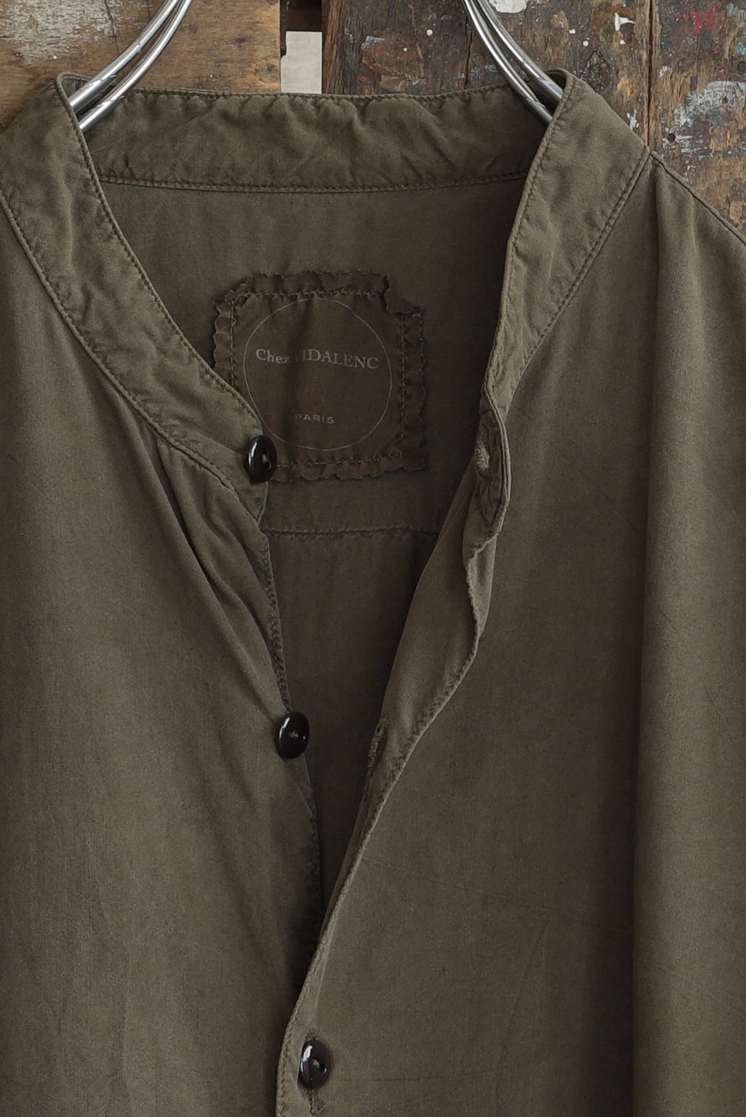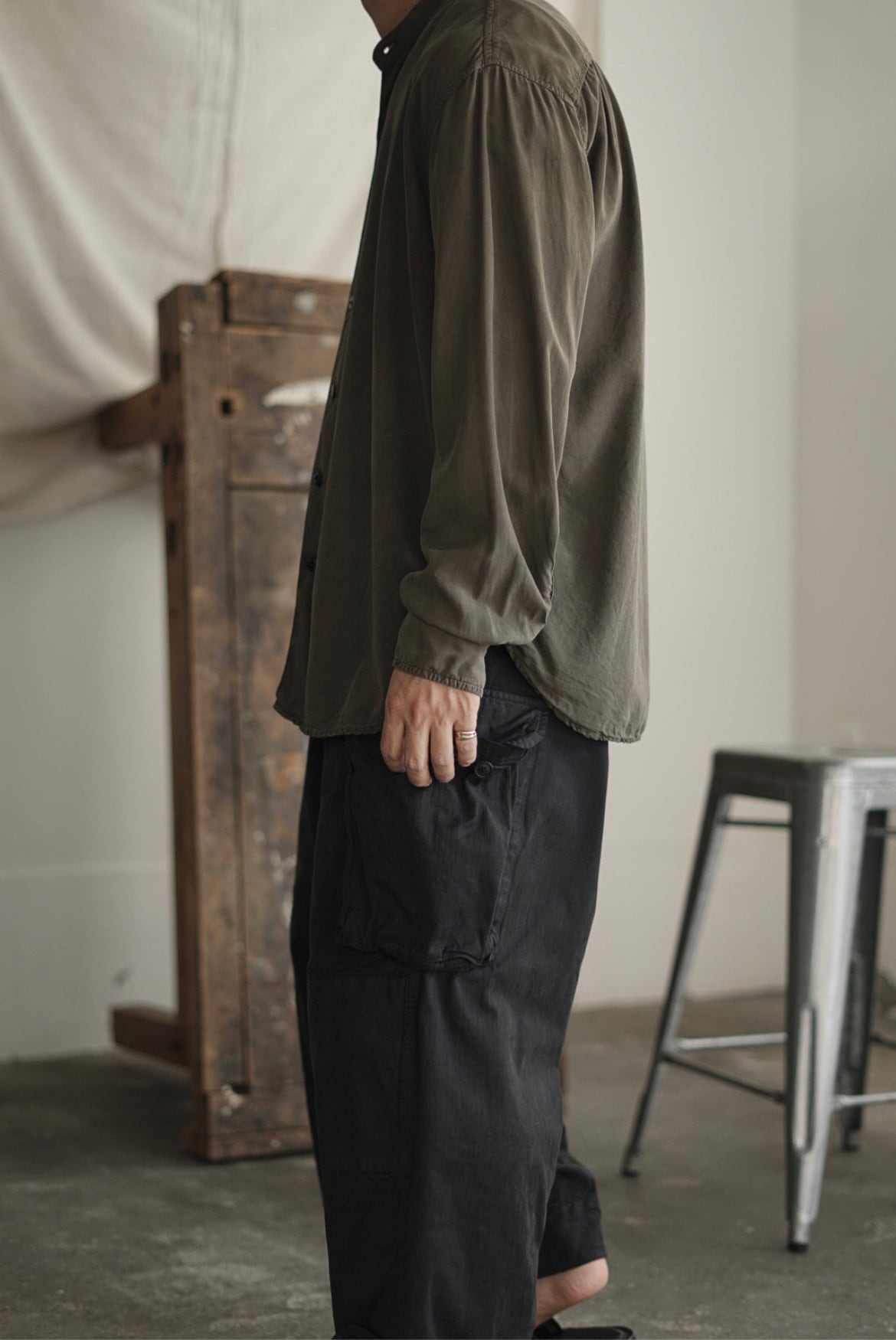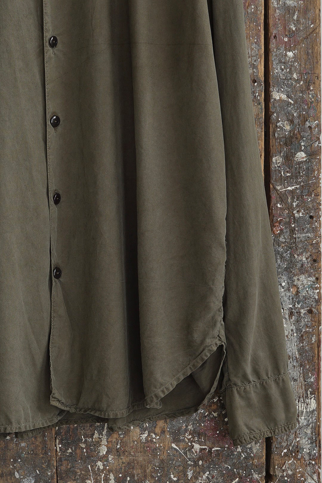 ワークスタイルベース、気取りのないデザインのカラーレスシャツ。シルクの肌当たりにコットンライクなテクスチャーのニュアンスが入り混じる、贅沢にも敢えて光沢を抑えたシルクマットファブリックを使用。カスレやムラを帯びる、ガーメントダイ(製品染め)によるオリーブカラー。クスミのある発色の不完全さに儚い色気を感じます。製品染めの工程を経た事で、細部のステッチが引き締まり縮絨、パッカリングが表情として現れています。ミニマルなアンティークガラスボタンのディティール。生地が心地よくドレープする程よいリラックスシルエット、背面のサイドプリーツは肩周りの可動域を広げ、快適な着用感を加えます。袖口はロールアップ可能な2ボタン仕様。