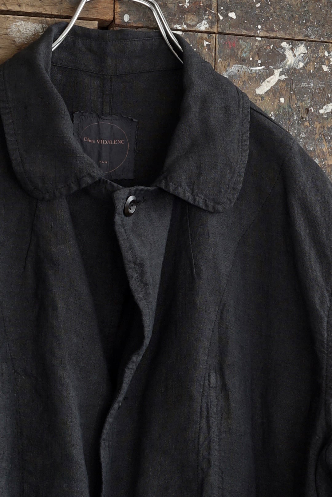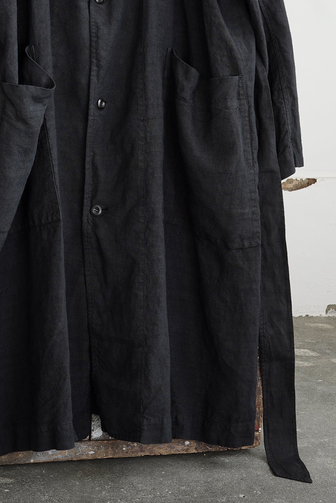 デザイナー自身が選りすぐった、アンティックフレンチリネンを使用した「COAT TRENCH」。それぞれに個性があり、ひとつとして同じ物が存在しない生地。現行の統制された物では表現できない、ホームスパンならではのネップやスラブが自然な表情として製品に存在感をもたらします。着用を重ねることで風合いを増してゆき、着用者の身体に馴染み、時を経て各々のヴィンテージとなっていく存在のファブリックです。ガーメンドダイ(製品染)によるブラックは、奥行きのある感情的なトーンを携えています。サイドの大胆に大きいパッチポケット。チェスト部の内側にパッチポケットが付くことで、表面にダブルステッチが浮き彫りになりデザインの一部に加わります。控えめにラウンドした小振りの襟は、全体に柔らかでエスプリの効いた印象。アンライニング仕様、古いリネン特有の弾力をシルエットが謳歌して靡きます。