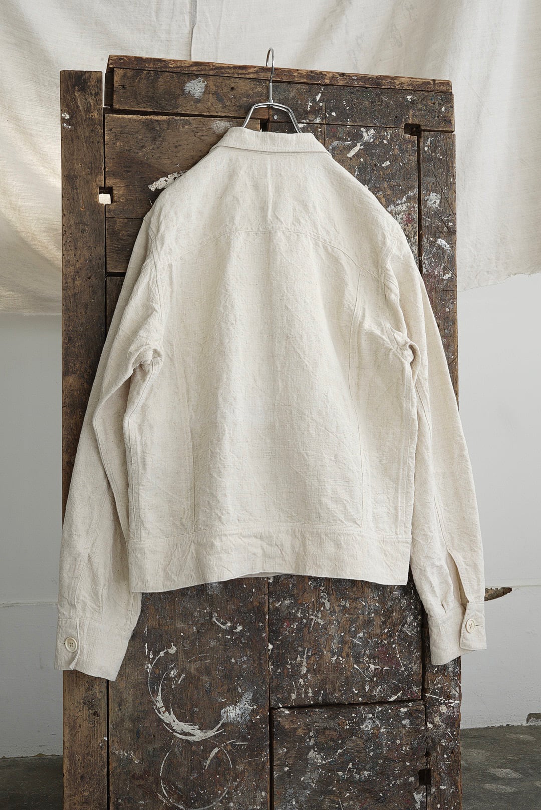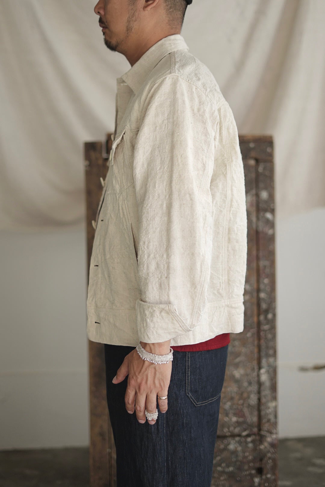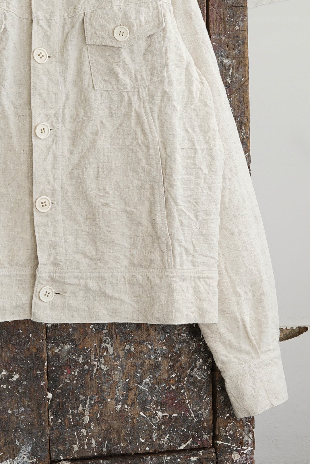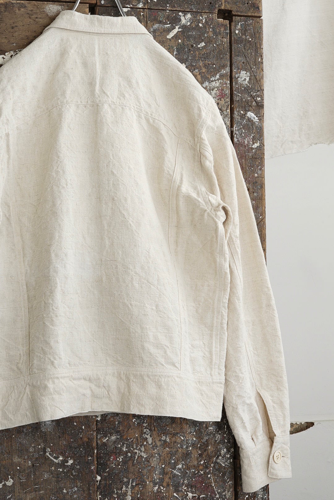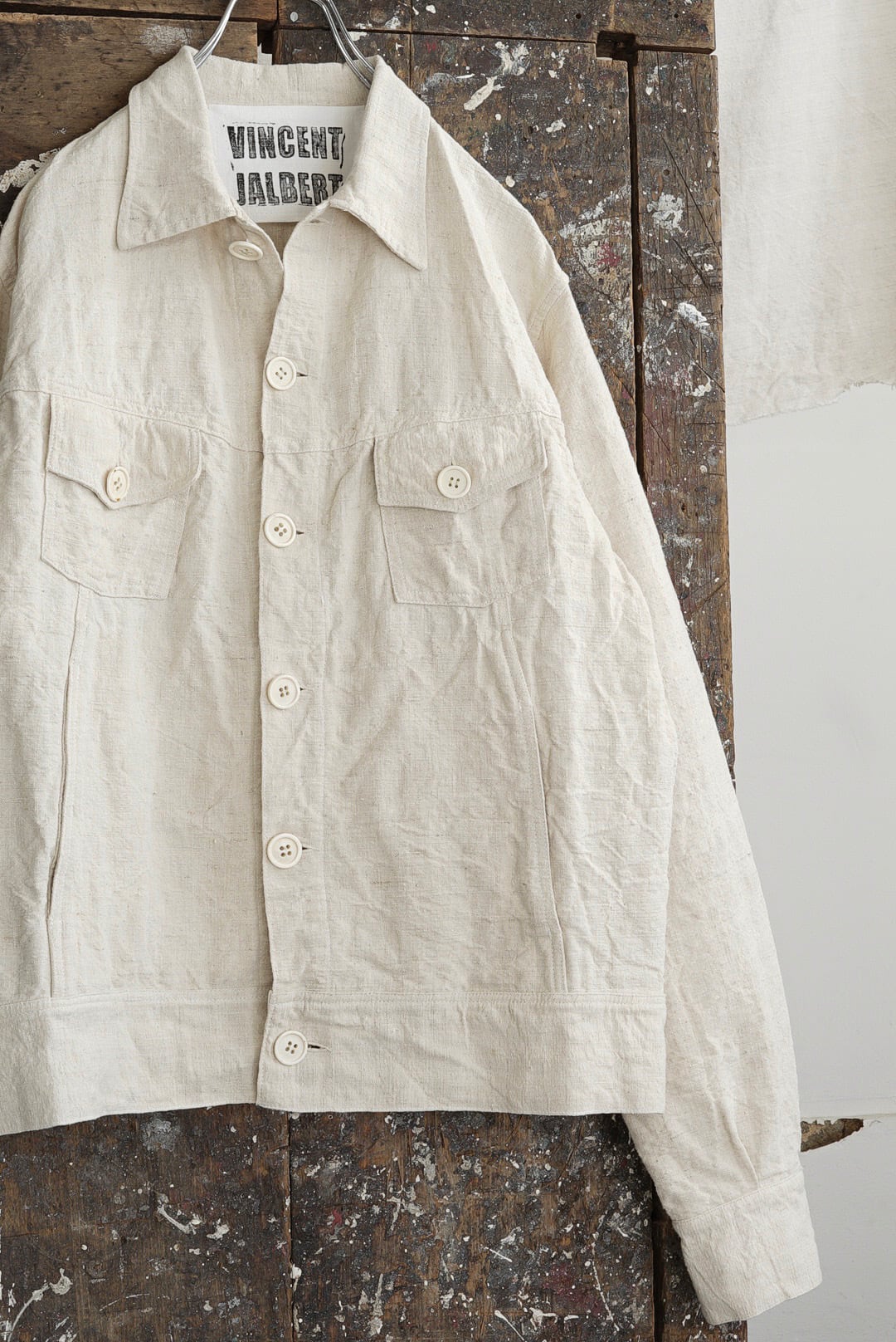 「VINCENT JALBERT」のシグネットファブリック、ヴィンテージフレンチリネン(1900年代初頭)を使用したデニムタイプジャケット。現行の統制された生地にはない、ホームスパンならではのネップやスラブが自然な表情として製品に存在感をもたらしています。それぞれに個性があり、ひとつとして同じ物が存在しないアイテム。着込み洗濯を重ねることで、ソフトな風合いを増してゆき、着用者の身体に馴染み寄り添い、時を経て各々のヴィンテージとなっていく存在。古布の表情をダイレクトに楽しめる未染色のナチュラルカラー。フロントにチェスト&サイドポケット、インサイドにも2ポケットのユーティリティディテール。