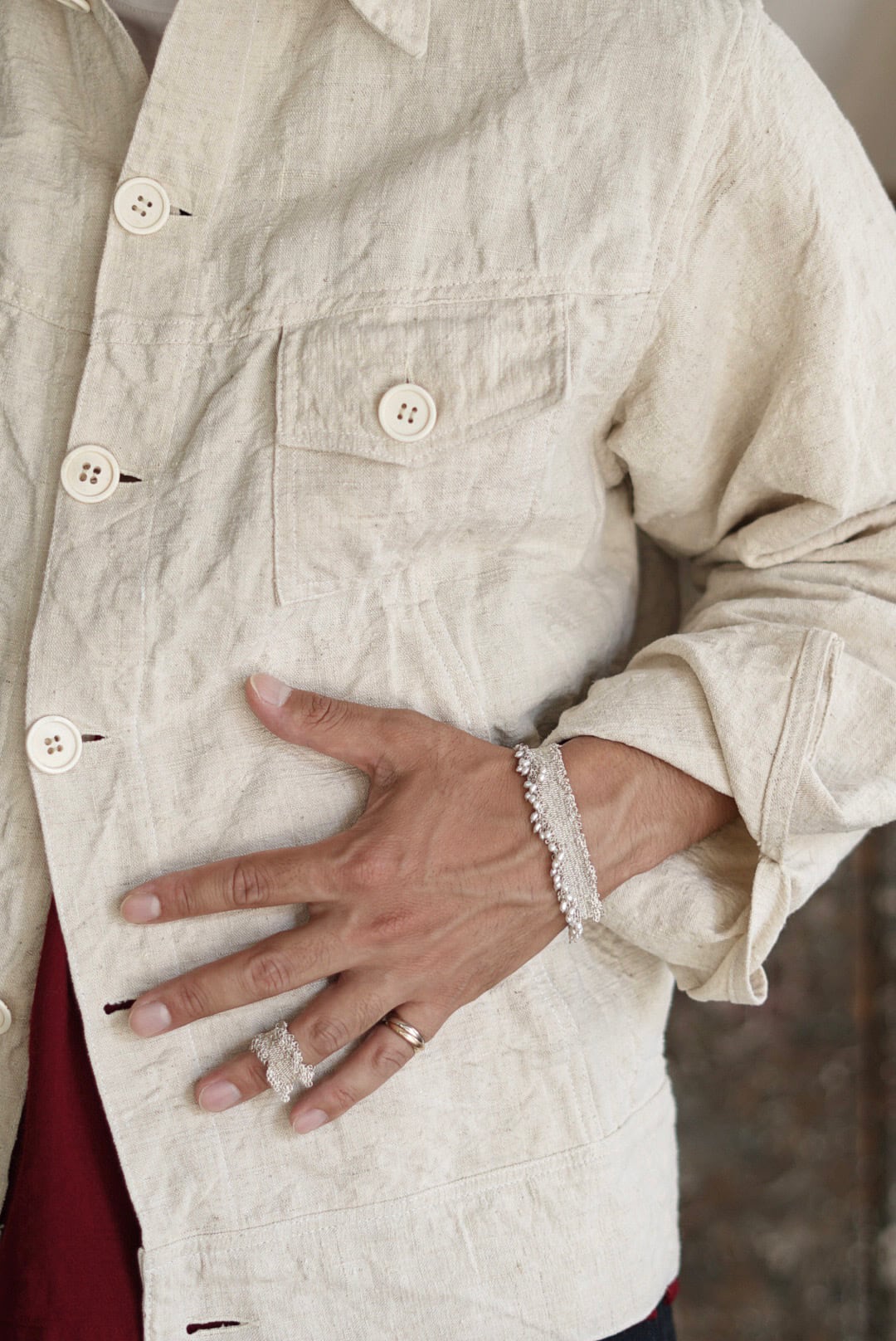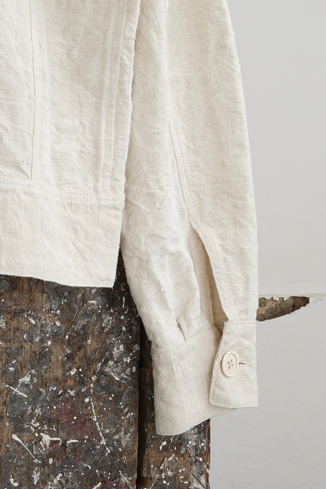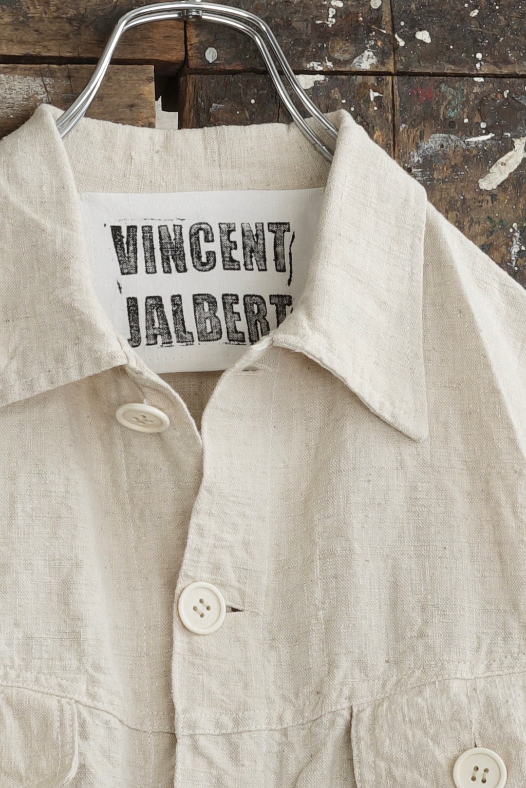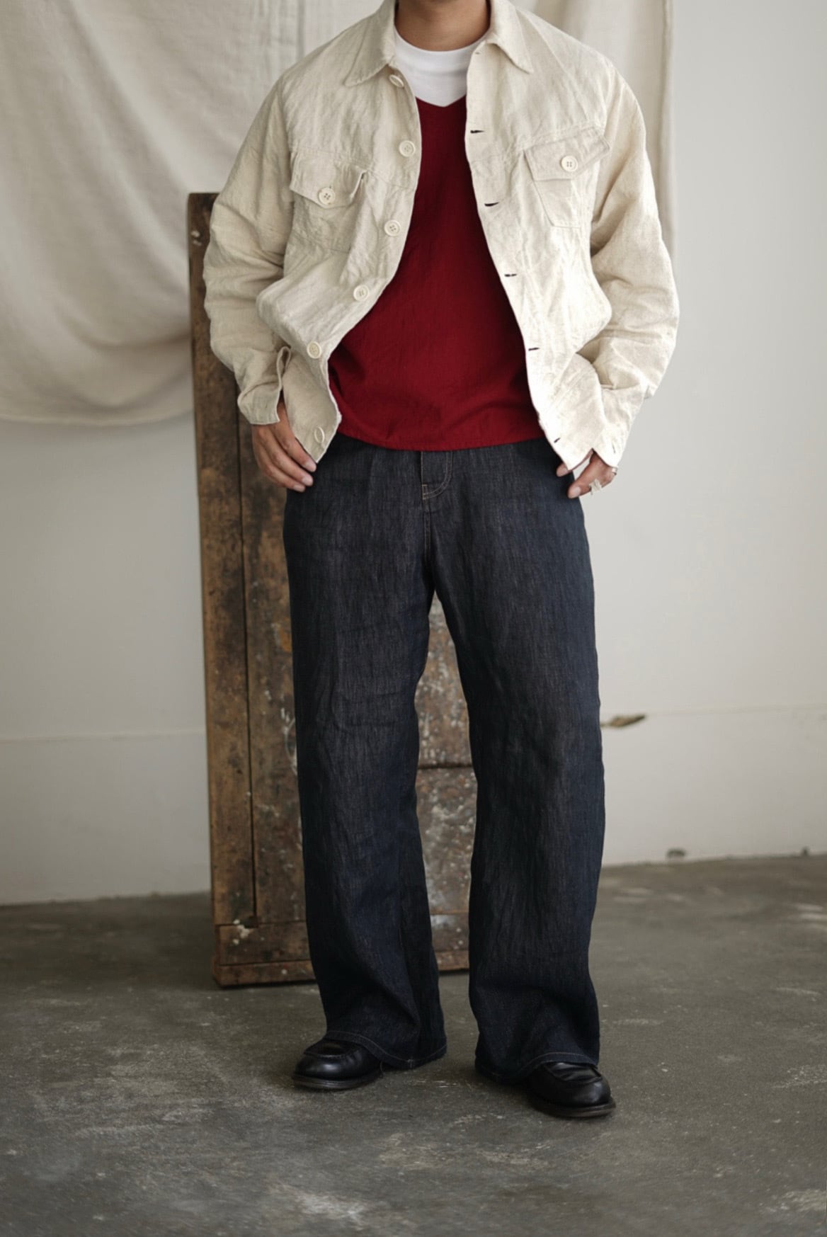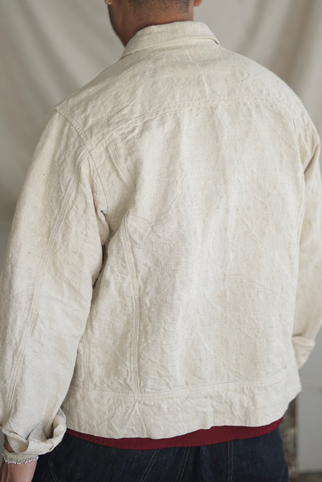 「VINCENT JALBERT」のシグネットファブリック、ヴィンテージフレンチリネン(1900年代初頭)を使用したデニムタイプジャケット。現行の統制された生地にはない、ホームスパンならではのネップやスラブが自然な表情として製品に存在感をもたらしています。それぞれに個性があり、ひとつとして同じ物が存在しないアイテム。着込み洗濯を重ねることで、ソフトな風合いを増してゆき、着用者の身体に馴染み寄り添い、時を経て各々のヴィンテージとなっていく存在。古布の表情をダイレクトに楽しめる未染色のナチュラルカラー。フロントにチェスト&サイドポケット、インサイドにも2ポケットのユーティリティディテール。