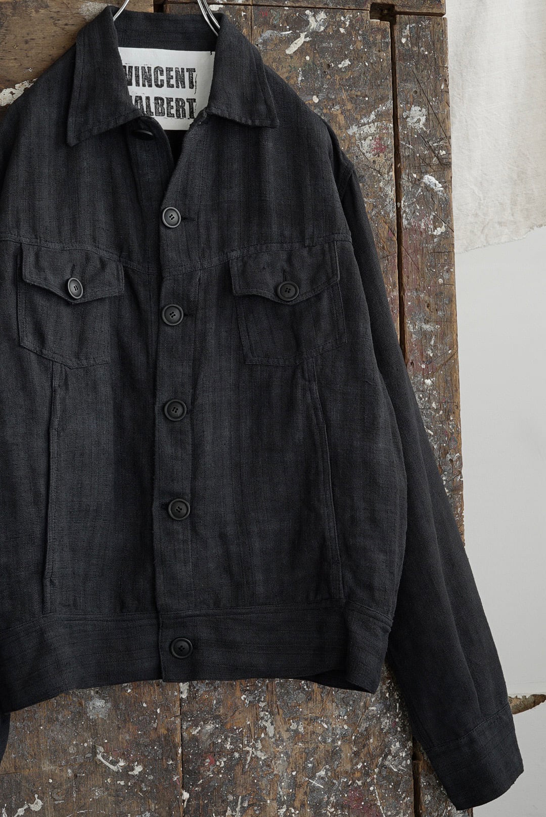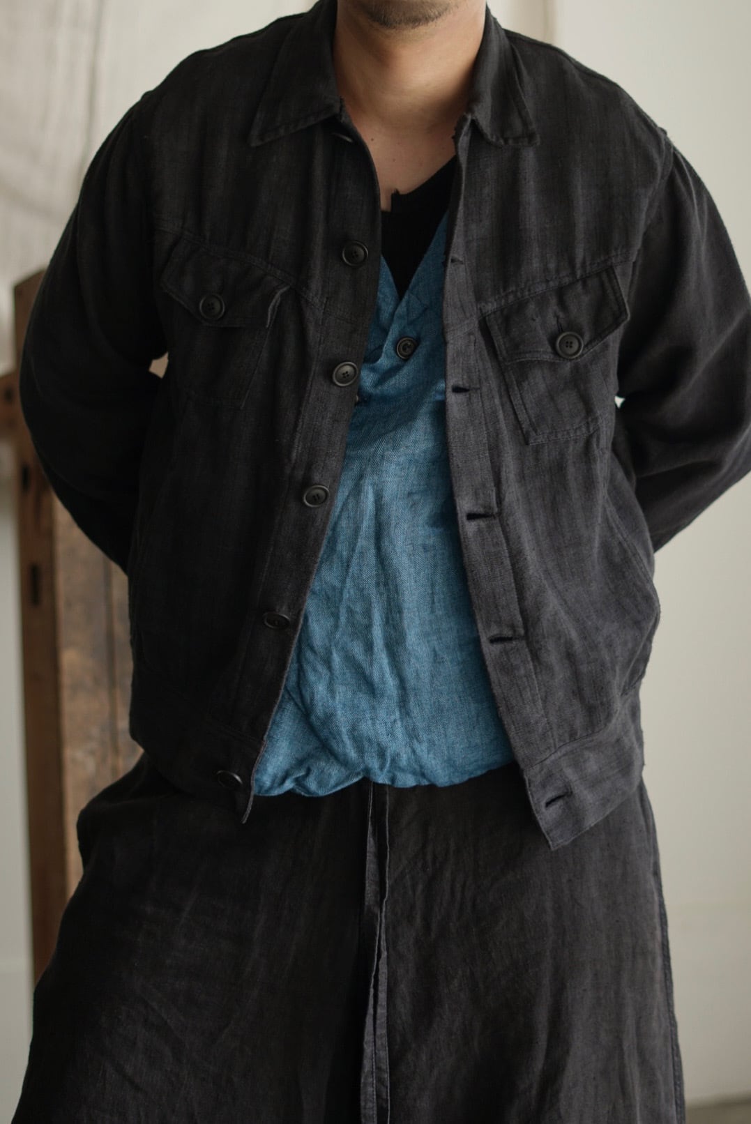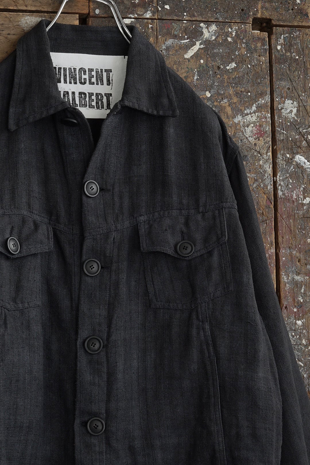 「VINCENT JALBERT」のシグネットファブリック、ヴィンテージフレンチリネン(1900年代初頭)を使用したデニムタイプジャケット。現行の統制された生地にはない、ホームスパンならではのネップやスラブが自然な表情として製品に存在感をもたらしています。それぞれに個性があり、ひとつとして同じ物が存在しないアイテム。着込み洗濯を重ねることで、ソフトな風合いを増してゆき、着用者の身体に馴染み寄り添い、時を経て各々のヴィンテージとなっていく存在。ガーメンドダイ(製品染)による、フェード気味のブラックは柔らかな色調です。フロントにチェスト&サイドポケット、インサイドにも2ポケットのユーティリティディテール。