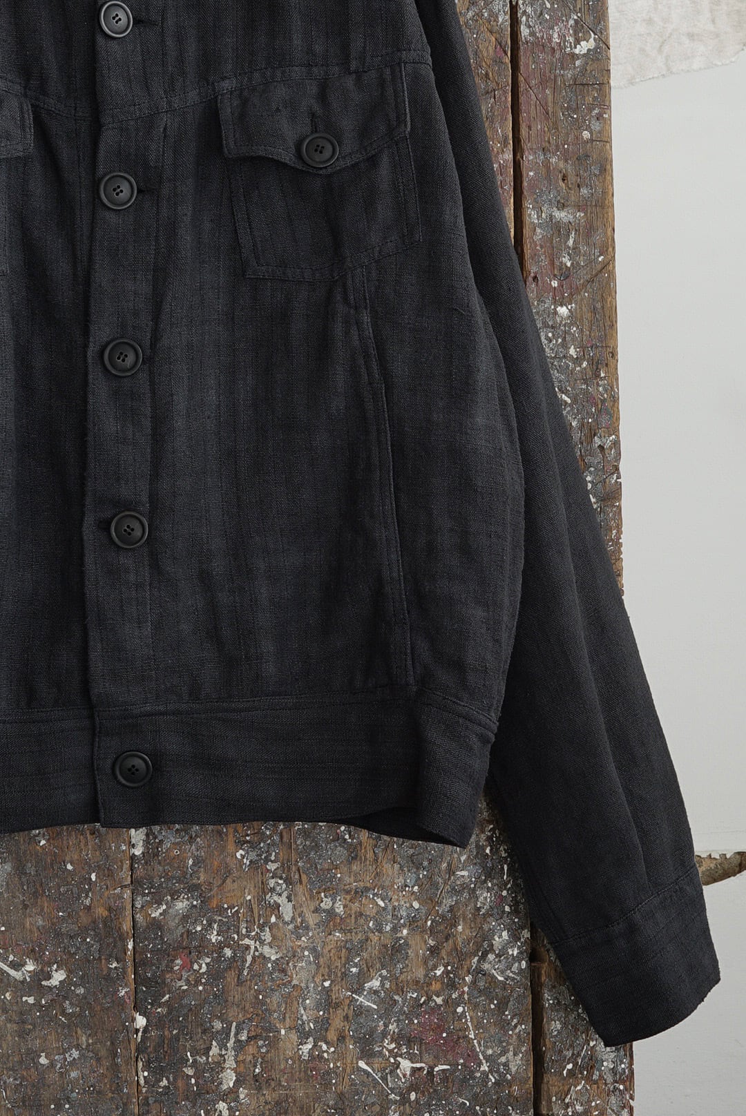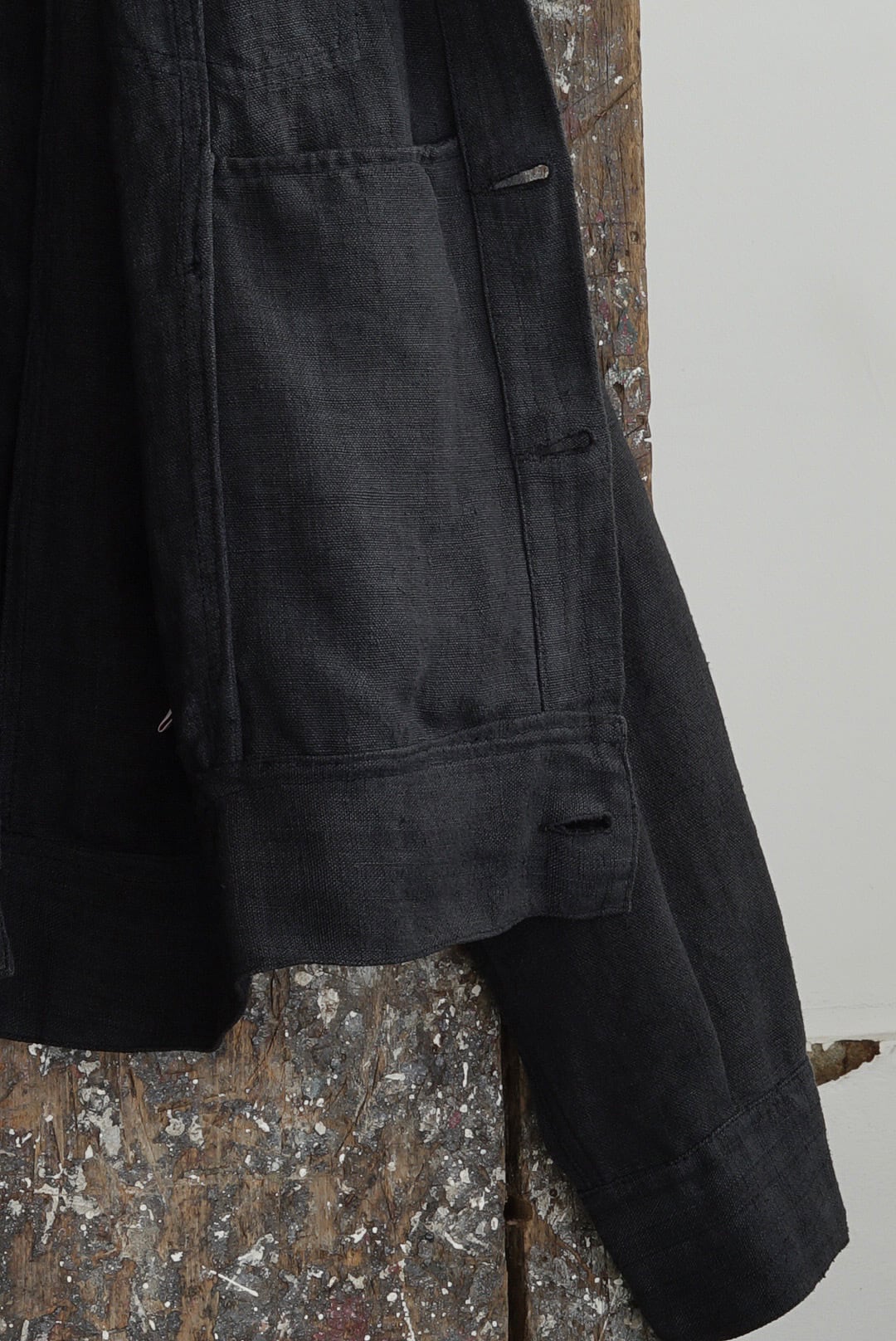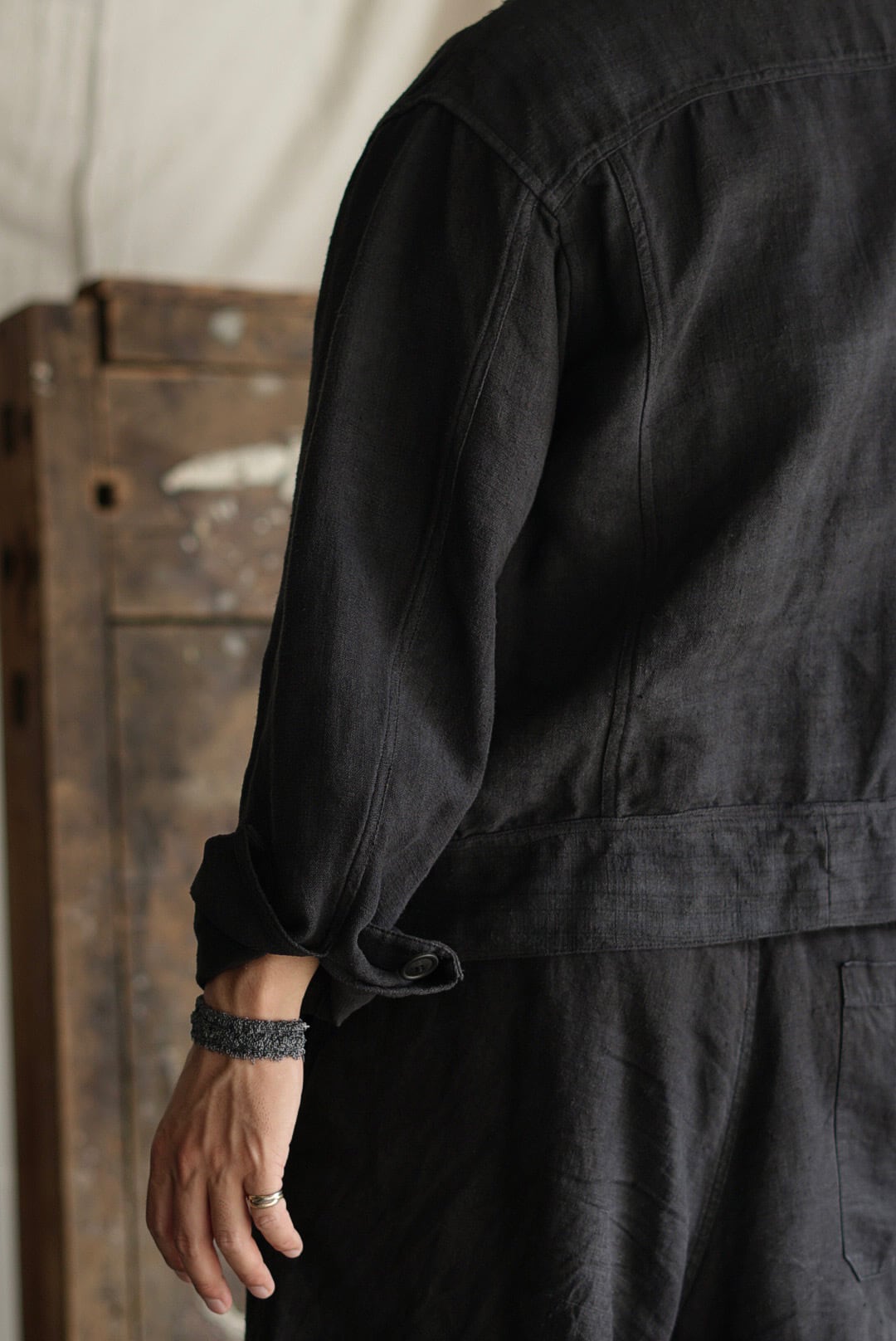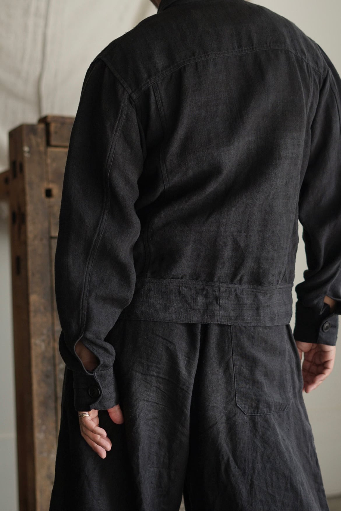 「VINCENT JALBERT」のシグネットファブリック、ヴィンテージフレンチリネン(1900年代初頭)を使用したデニムタイプジャケット。現行の統制された生地にはない、ホームスパンならではのネップやスラブが自然な表情として製品に存在感をもたらしています。それぞれに個性があり、ひとつとして同じ物が存在しないアイテム。着込み洗濯を重ねることで、ソフトな風合いを増してゆき、着用者の身体に馴染み寄り添い、時を経て各々のヴィンテージとなっていく存在。ガーメンドダイ(製品染)による、フェード気味のブラックは柔らかな色調です。フロントにチェスト&サイドポケット、インサイドにも2ポケットのユーティリティディテール。