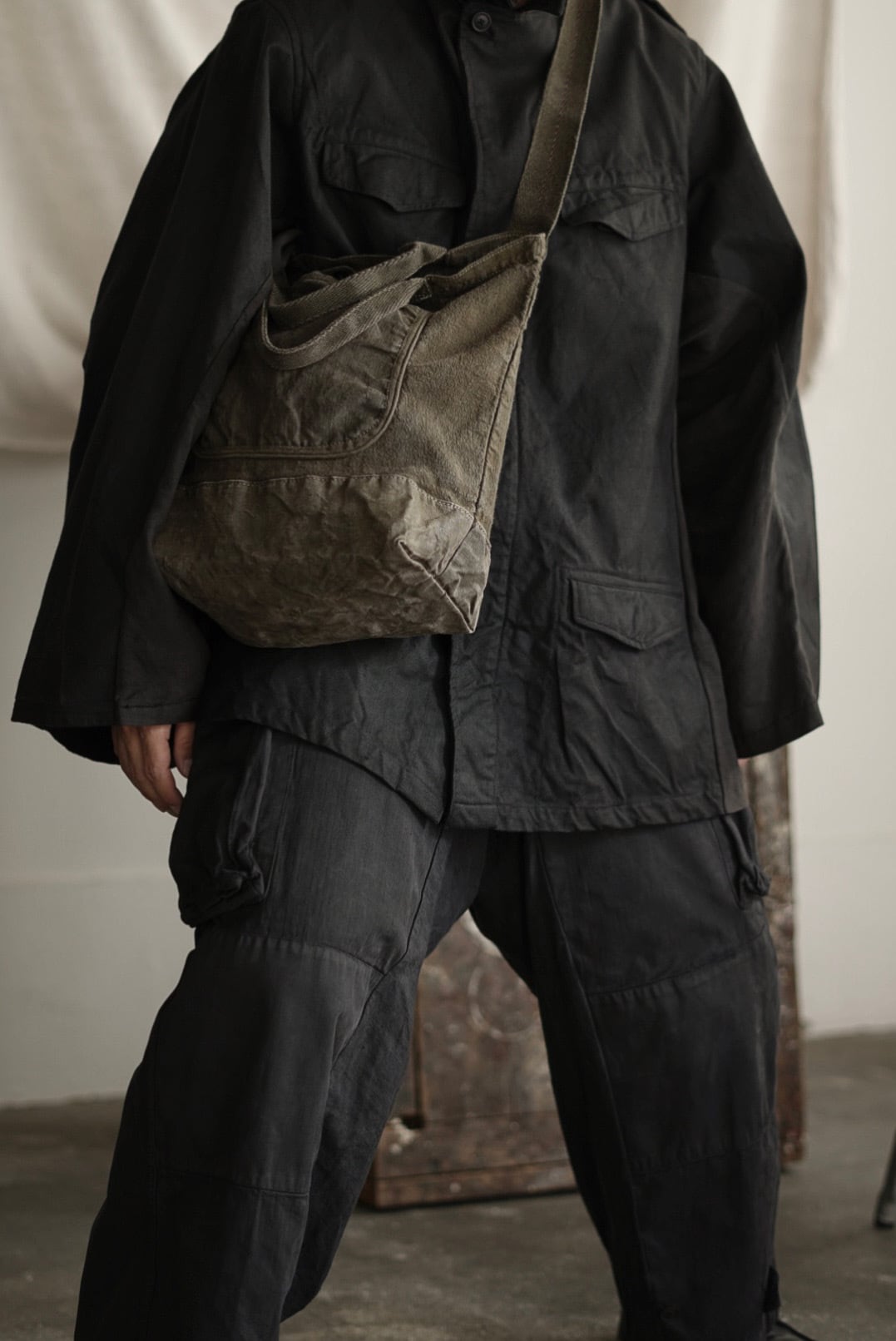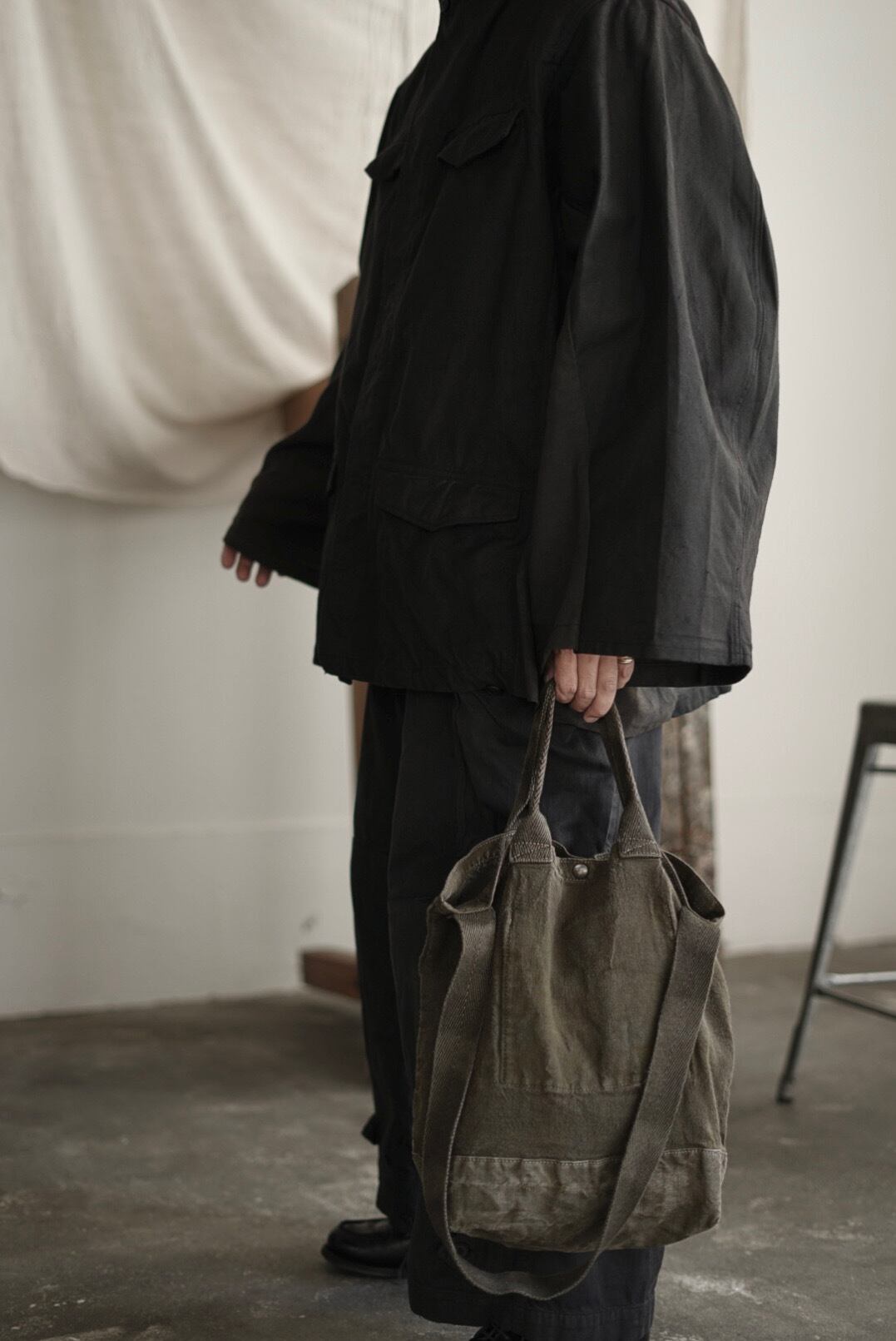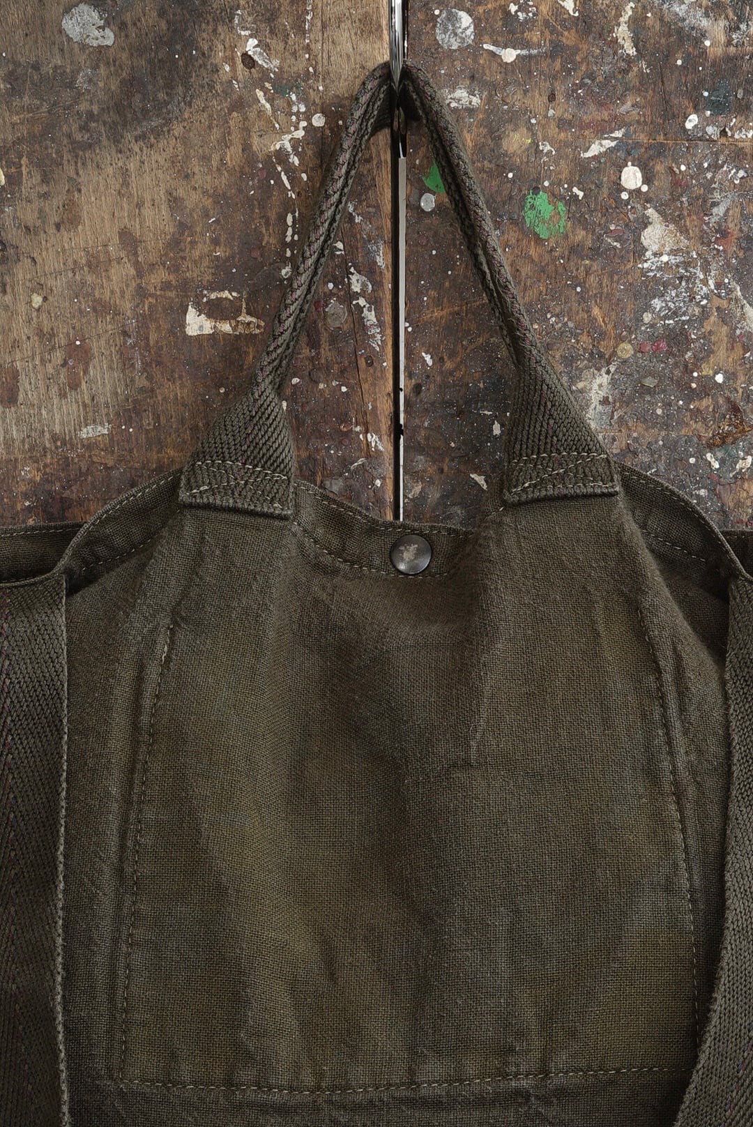 "VINCENT JALBERT"のパートナー、YVES ANDRIEUXの手掛けるアイテム。ヴィンテージミリタリーアイテムを解体し再構築したトート&ショルダーのマーケットバッグ。ボディにはヘビーウォッシュを施しパターンを褪色させた、ブリティッシュミリタリーカモフラージュ。ボトムとパッチポケットには、同じくヘビーウォッシュを施したフレンチミリタリーヘビーリネンを使用。製品染により各々のカーキを映し出した、表情深いテクスチャーです。スナップ留めの上部に、ストラップにもミリタリーパーツを使用。内側にセパレートポケット「ARCHIVES, AD2015」