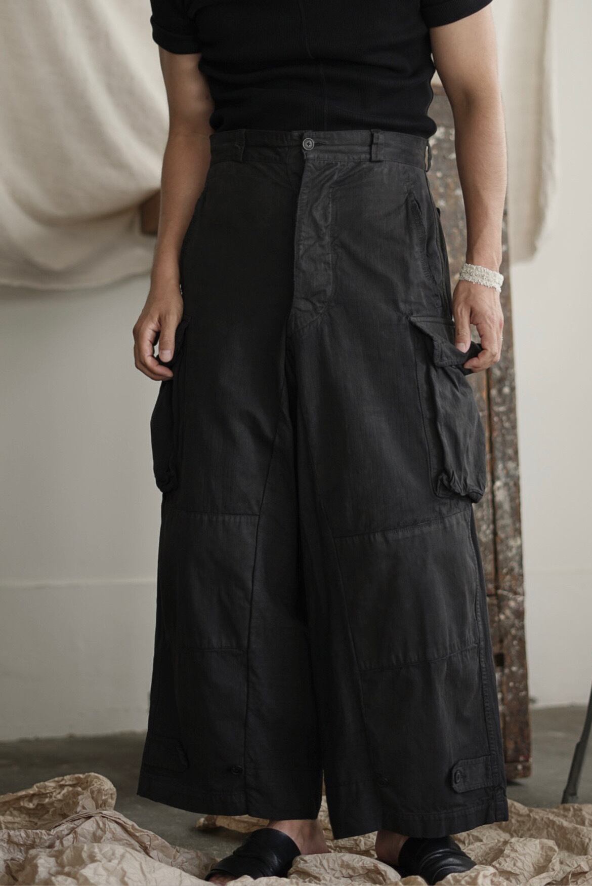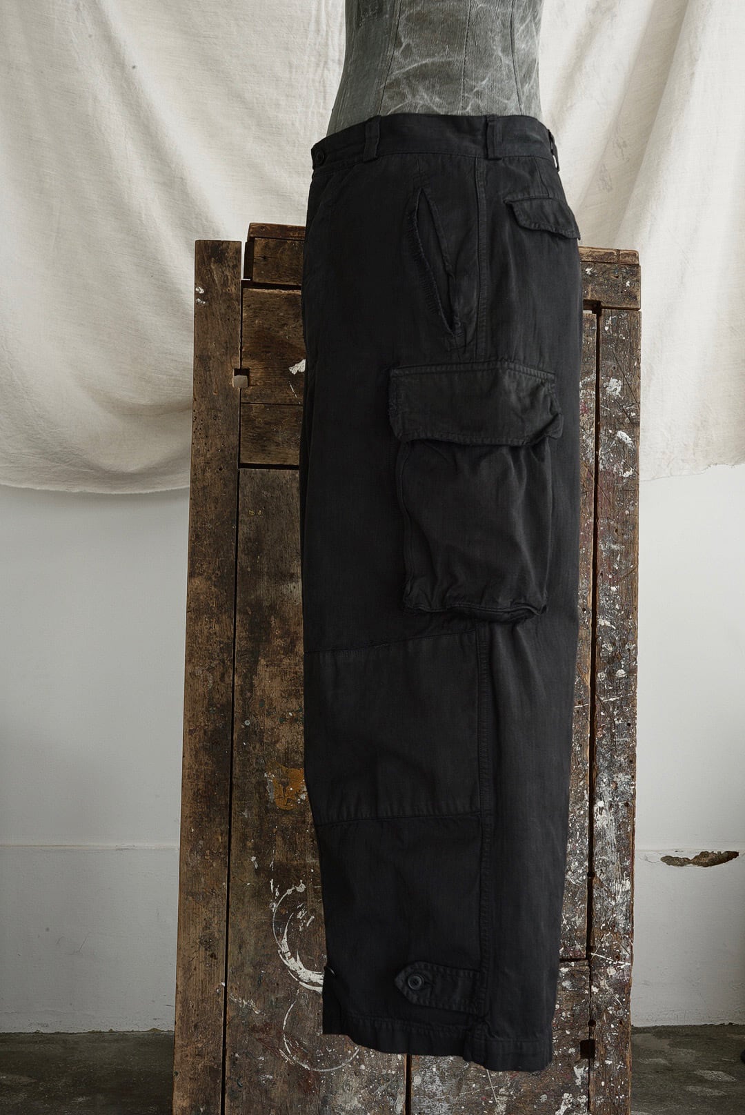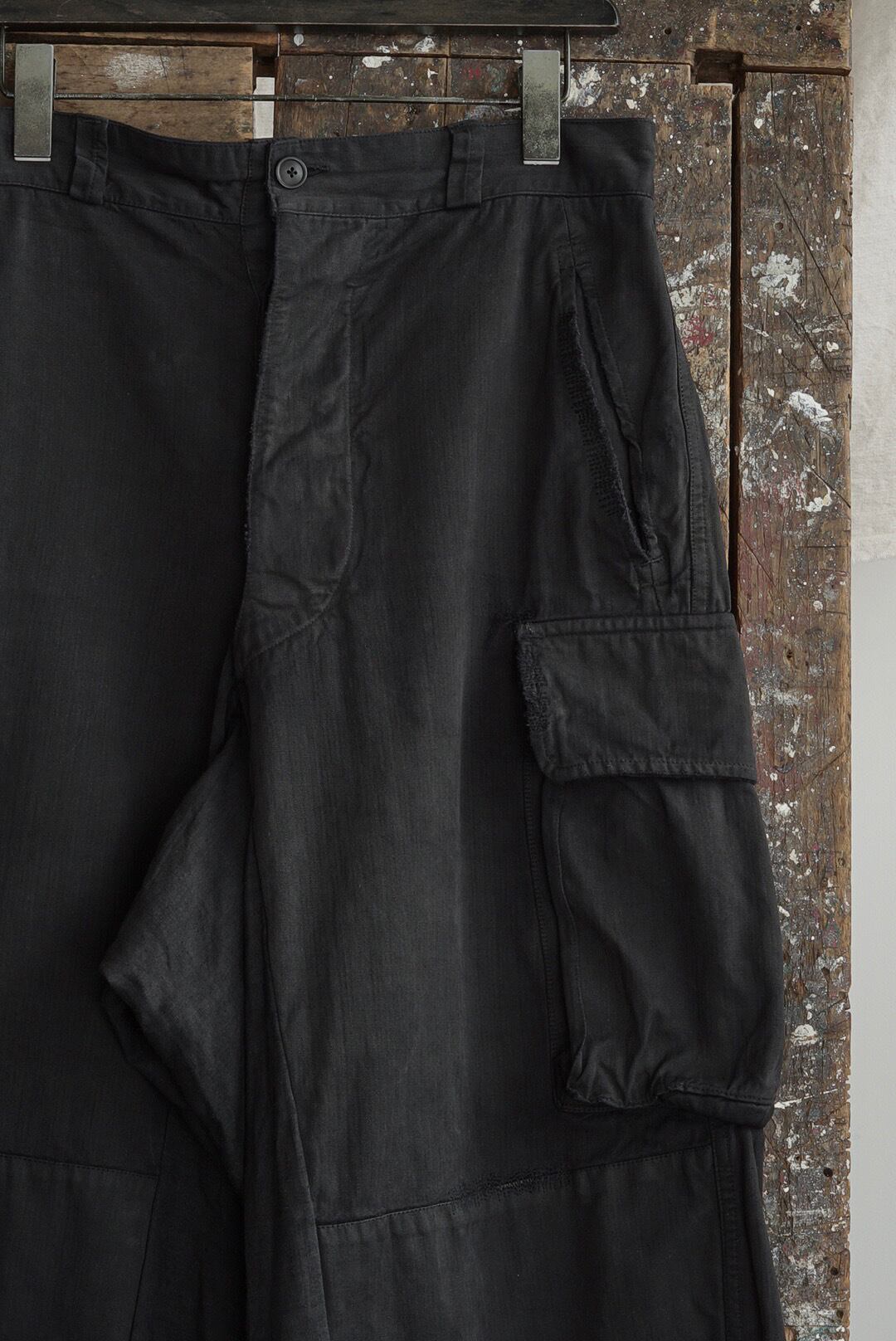 フレンチミリタリー「M-47 FIELD PANTS 1960's」を再構築したエンラージトラウザーズ。股下部を大胆に切り開き、ヴィンテージフレンチリネンをドッキング。後期のワークディティール、ソフトなヘリンボーンファブリックにドレープ性を促す弾力を持ったヴィンテージリネン。フレンチ×フレンチのグッドコンビネーション。質実剛健なミリタリーアイテムが、さりげなくエレガントに昇華されています。贅沢に全てのボタンはホーンボタンに変更。再構築後に製品染めにて仕上げたブラックカラー。ボディのミリタリーコットンとヴィンテージリネンが素材ごとのブラックを纏い、コントラストを浮かべる表情に。
