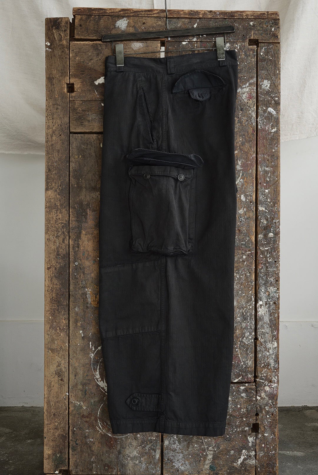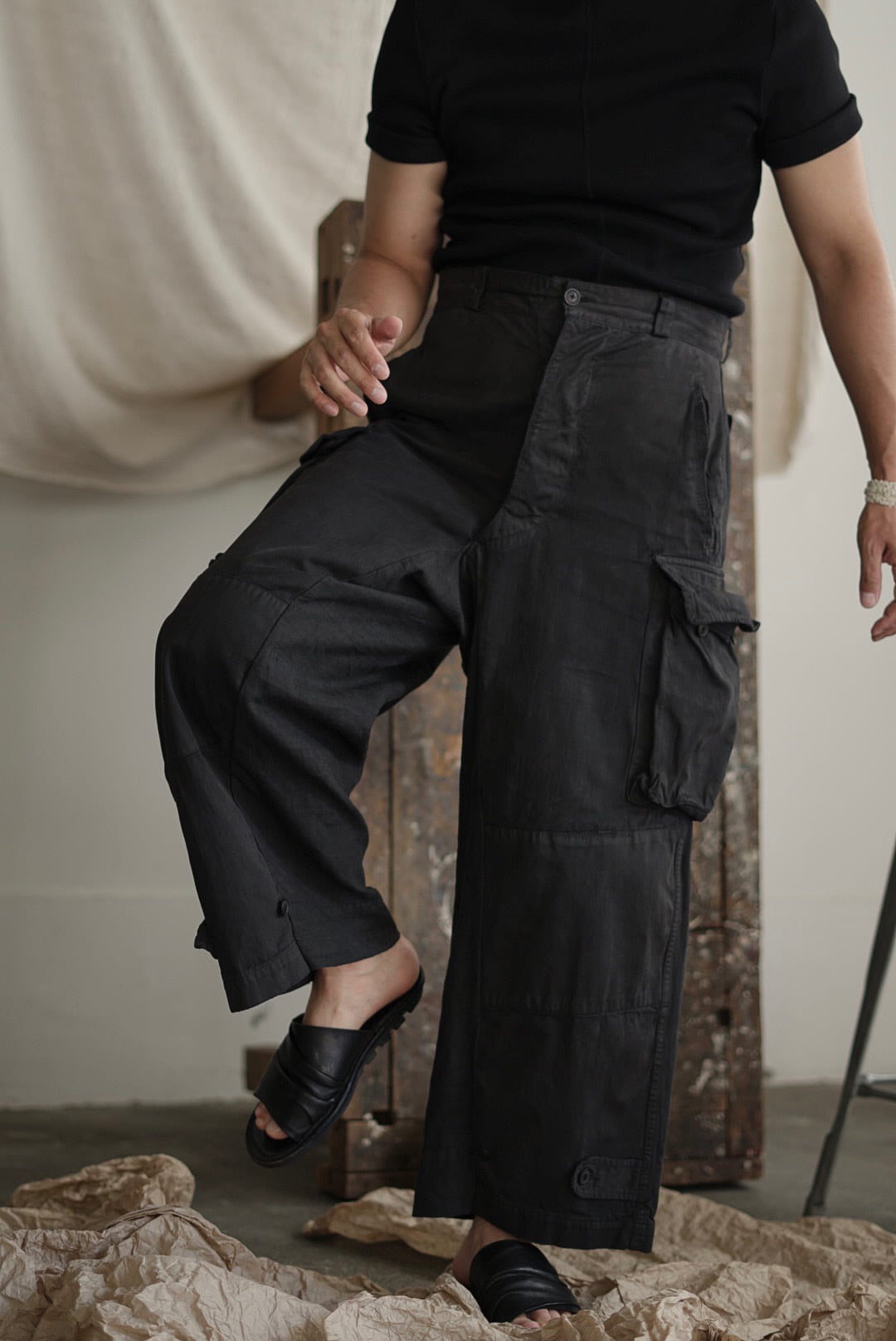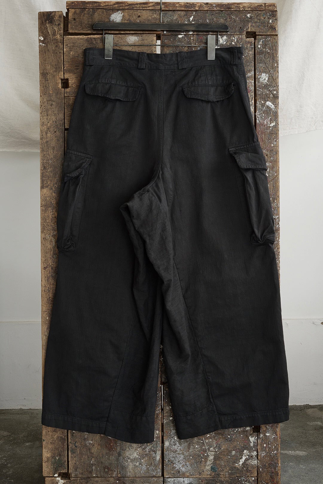 フレンチミリタリー「M-47 FIELD PANTS 1960's」を再構築したエンラージトラウザーズ。股下部を大胆に切り開き、ヴィンテージフレンチリネンをドッキング。後期のワークディティール、ソフトなヘリンボーンファブリックにドレープ性を促す弾力を持ったヴィンテージリネン。フレンチ×フレンチのグッドコンビネーション。質実剛健なミリタリーアイテムが、さりげなくエレガントに昇華されています。贅沢に全てのボタンはホーンボタンに変更。再構築後に製品染めにて仕上げたブラックカラー。ボディのミリタリーコットンとヴィンテージリネンが素材ごとのブラックを纏い、コントラストを浮かべる表情に。