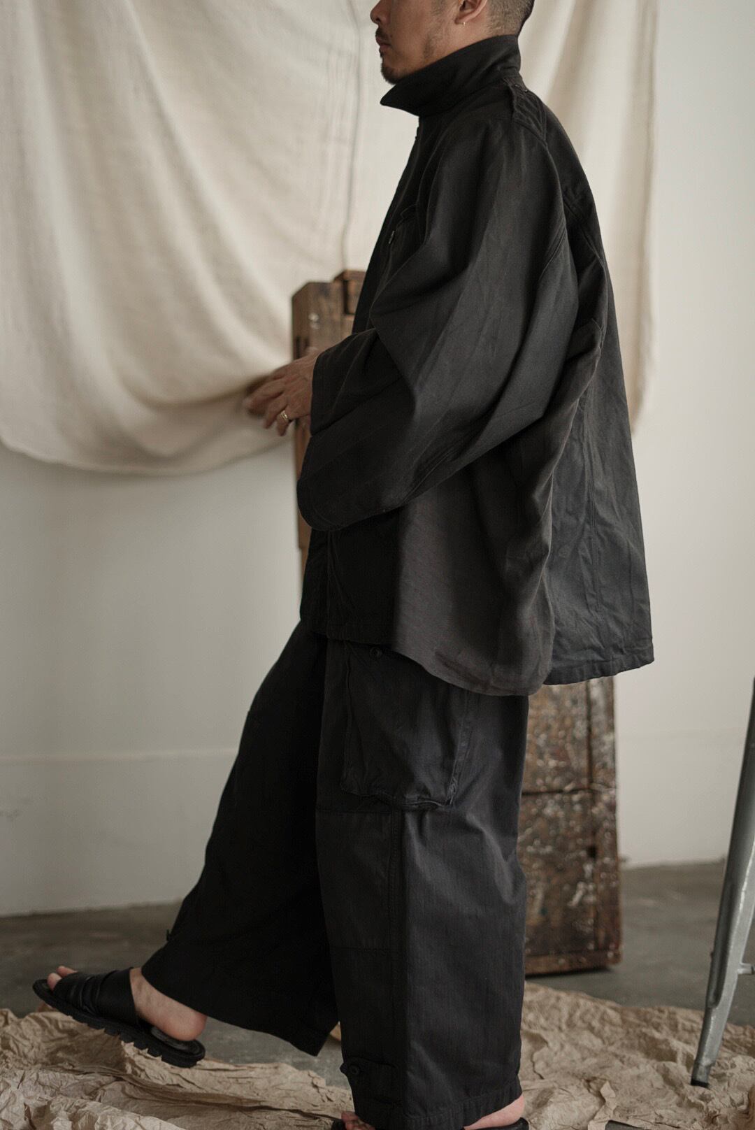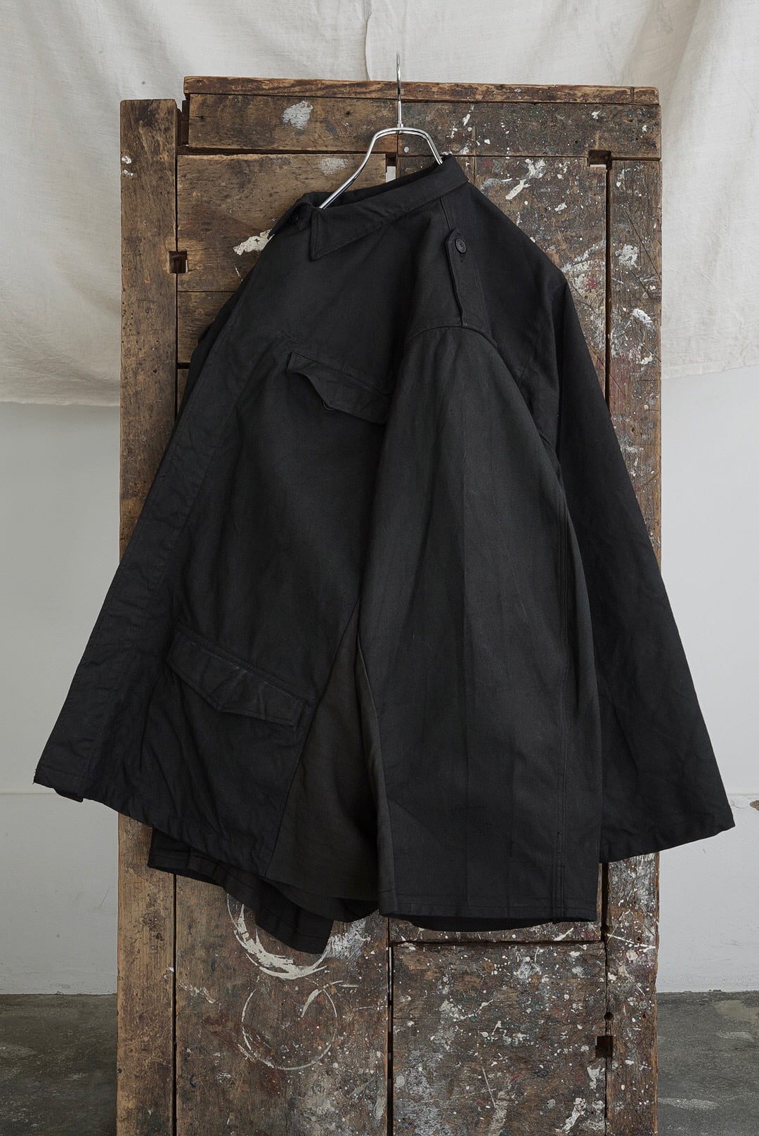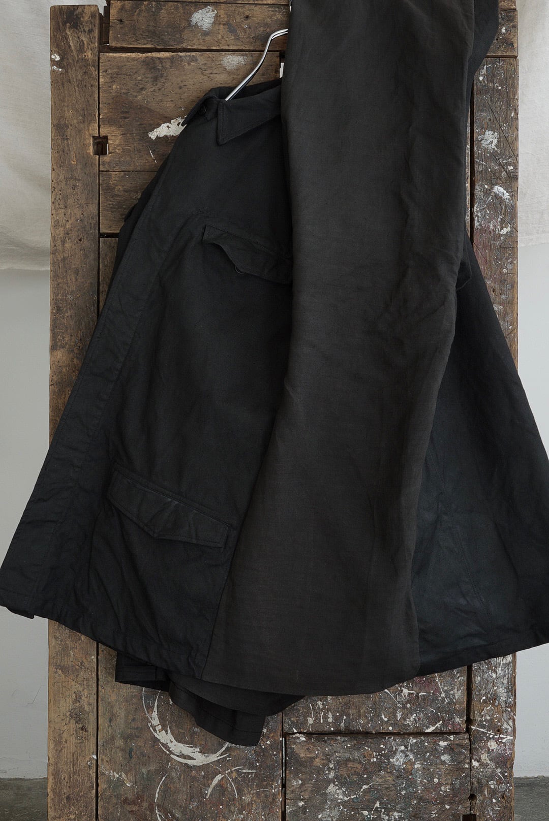 フレンチミリタリー「M-47 FIELD JACKET 1940's」を再構築したエンラージジャケット。袖から裾にかけてを大胆に切り開き、ヴィンテージフレンチリネンをドッキング。最初期特有、無骨で重厚感のある風合いのツイルファブリックにドレープ性を促す弾力を持ったヴィンテージリネン。フレンチ×フレンチのグッドコンビネーション。質実剛健なミリタリーアイテムを、エレガントなAラインへと促すシルエットに昇華。贅沢に全てのボタンはホーンボタンに取り替えられています。再構築後に製品染めにて仕上げたブラックカラー。ボディのミリタリーコットンとヴィンテージリネンが素材ごとのブラックを纏い、コントラストを浮かべる表情に。
