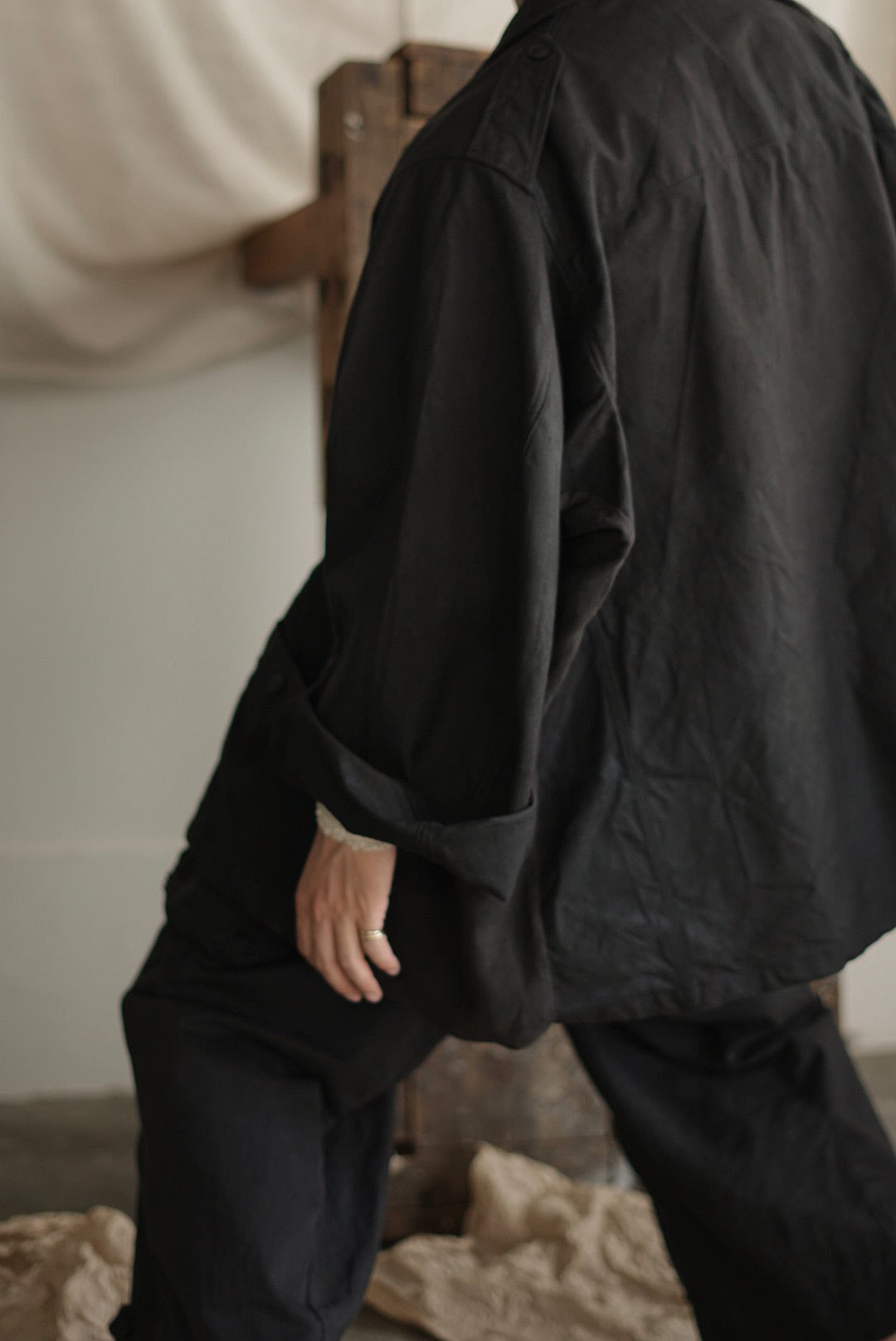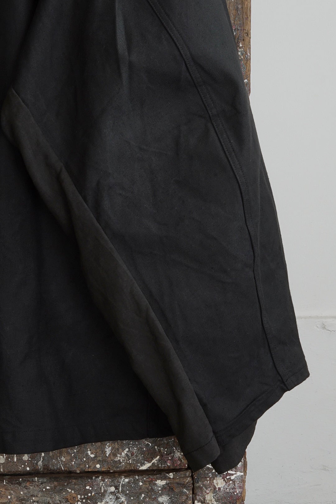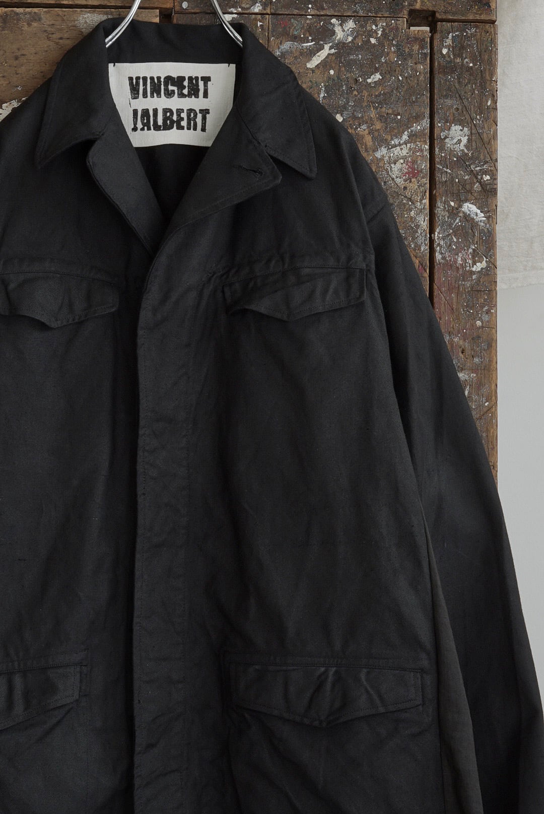 フレンチミリタリー「M-47 FIELD JACKET 1940's」を再構築したエンラージジャケット。袖から裾にかけてを大胆に切り開き、ヴィンテージフレンチリネンをドッキング。最初期特有、無骨で重厚感のある風合いのツイルファブリックにドレープ性を促す弾力を持ったヴィンテージリネン。フレンチ×フレンチのグッドコンビネーション。質実剛健なミリタリーアイテムを、エレガントなAラインへと促すシルエットに昇華。贅沢に全てのボタンはホーンボタンに取り替えられています。再構築後に製品染めにて仕上げたブラックカラー。ボディのミリタリーコットンとヴィンテージリネンが素材ごとのブラックを纏い、コントラストを浮かべる表情に。