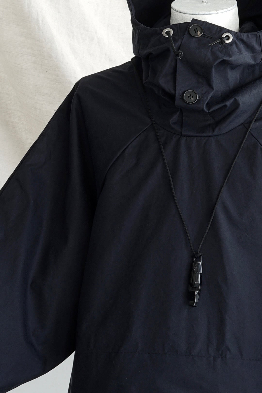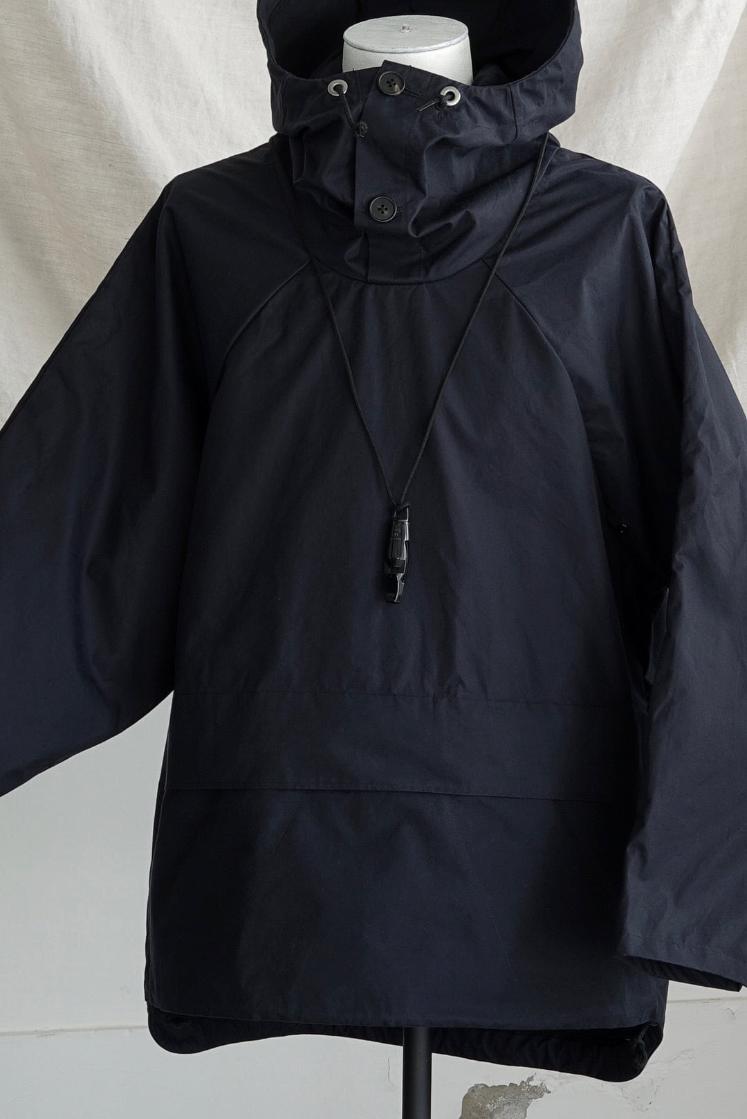 アノラックパーカ。質の良い細番手の双糸を用いて高密度に織られたコットンウェザークロス。濃色染色が難しい密度限界織物を糸染めにすることで特有の風合いに。横糸にネイビー・縦糸にブラックを使用した、ニュアンスを感じるダークネイビーの色調。ドライな質感は着用を重ねることで徐々にソフトに変化してゆきます。バックサイドにスナップボタン・フロントにコードがついた立体フード。裾内側に調整用コード。袖口に調整用のベルクロテープ。フロント下部、2口にセパレートしたポケット。脇下と背面にベンチレーションディテール。天然の水牛ボタン。1870年創業のACME社、イギリス製の救難ホイッスル付き(着脱可能)。