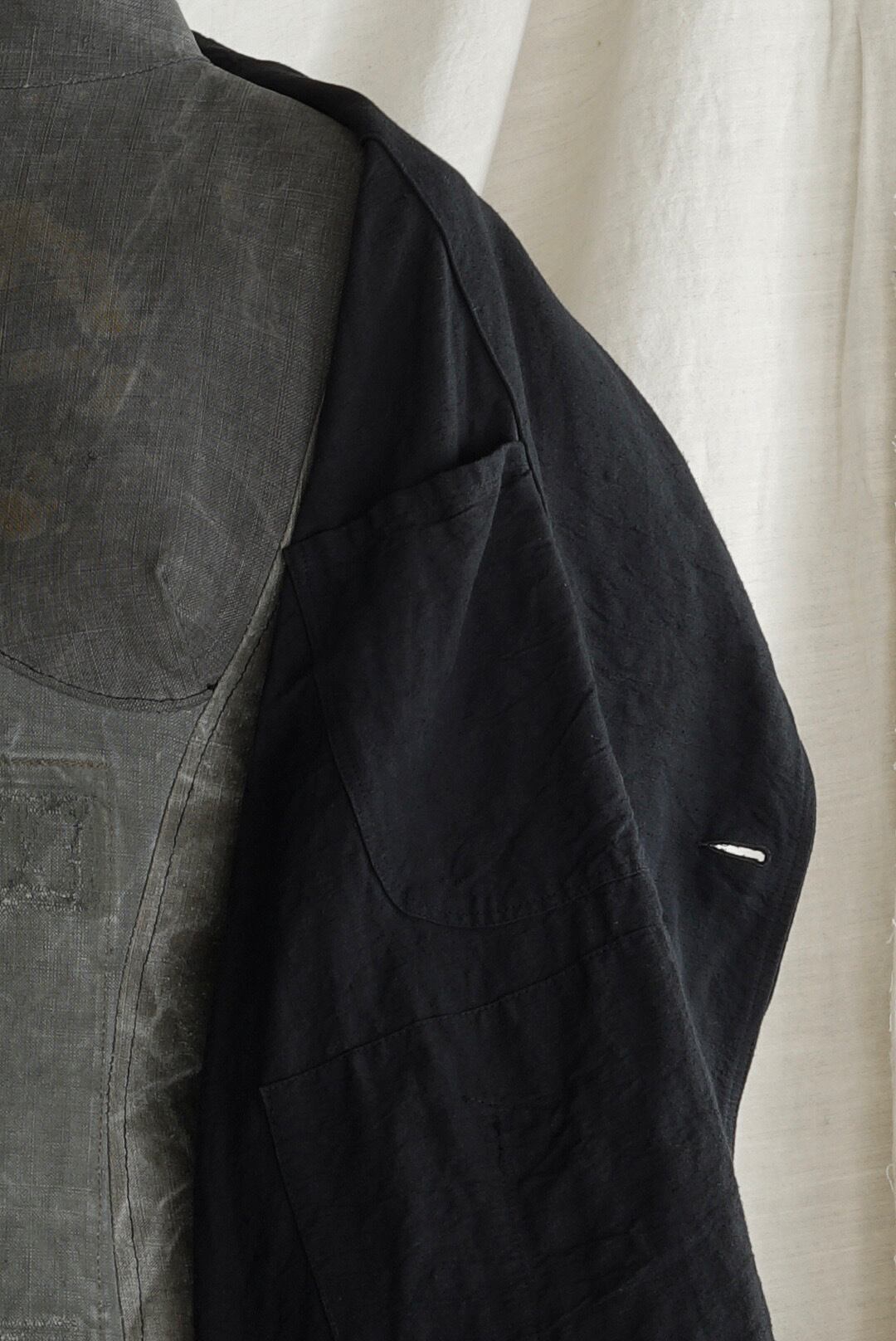 1960年代のフレンチミリタリー、オフィサートレンチコートをベースに再解釈を施したアイテム。オリジナルデザインからガンフラップ/チンストラップ/エポレット/ウエストベルトなどのディティールを差し引く事で、シンプルに洗練されたAラインのオーバーコートに。さらに、後面のインバーテッドプリーツを無くしたノーベントの仕様は、無機質でエレガントな装いを促します。オリジナルから比較すると袖周りをエンラージ(拡大)、ヘムにかけて大きく長く伸びるスリーブはロールアップ着用にてバランスとムーブを作ります。揺らぎ・靡き・膨らみなど、生地の動きをダイレクトに楽しめるシルエットは、使用する1960年代のハリのあるヴィンテージフレンチリネンを活かします。縫製後に製品染めにて仕上げたブラックカラー。ホーンボタンディティール、内側胸にポケット。