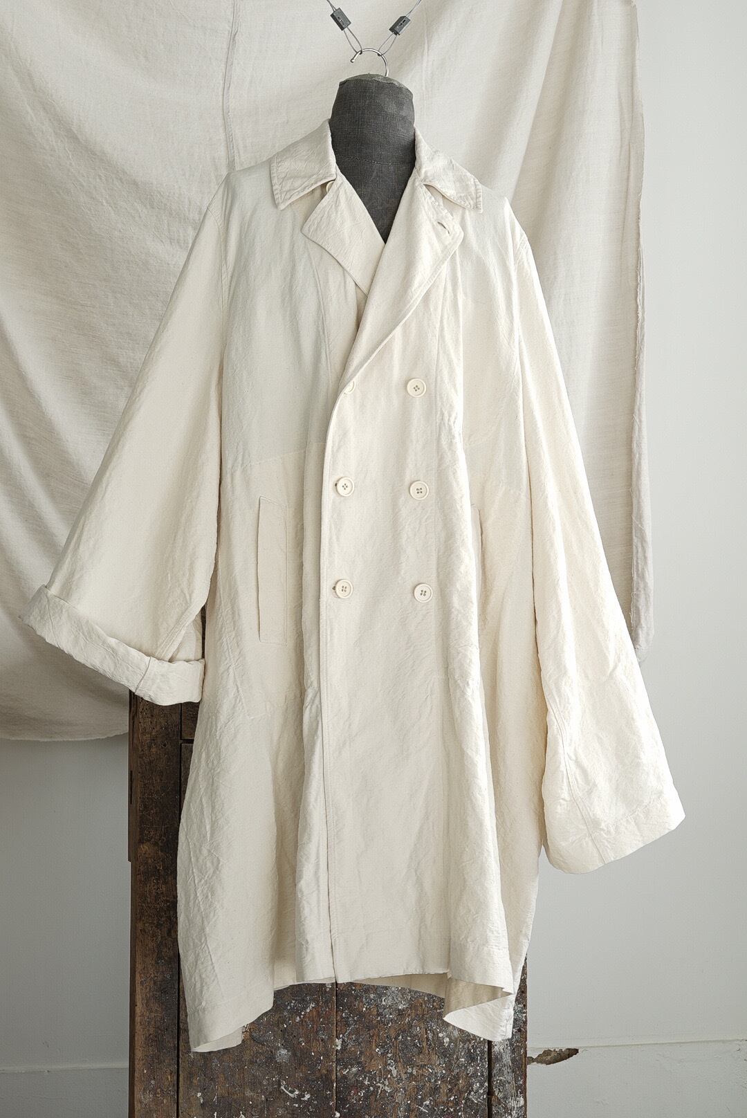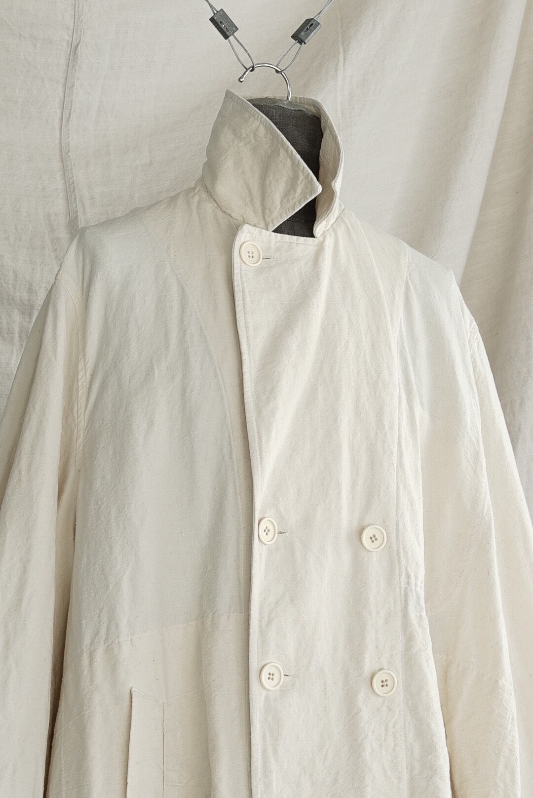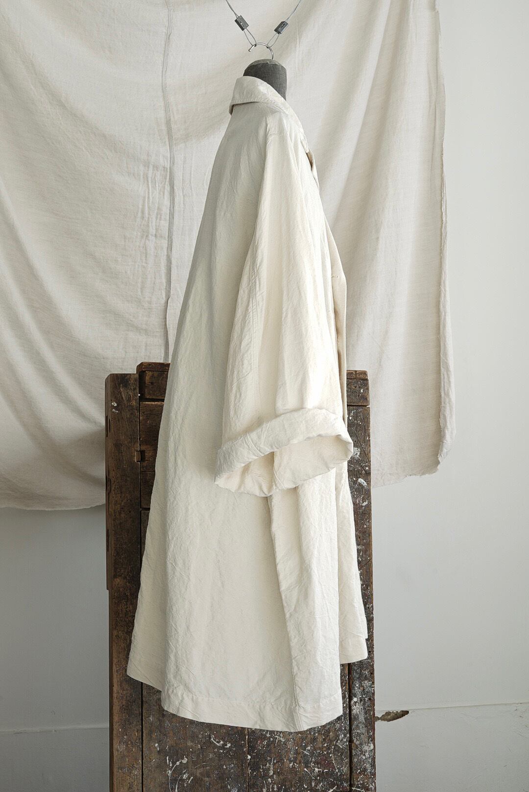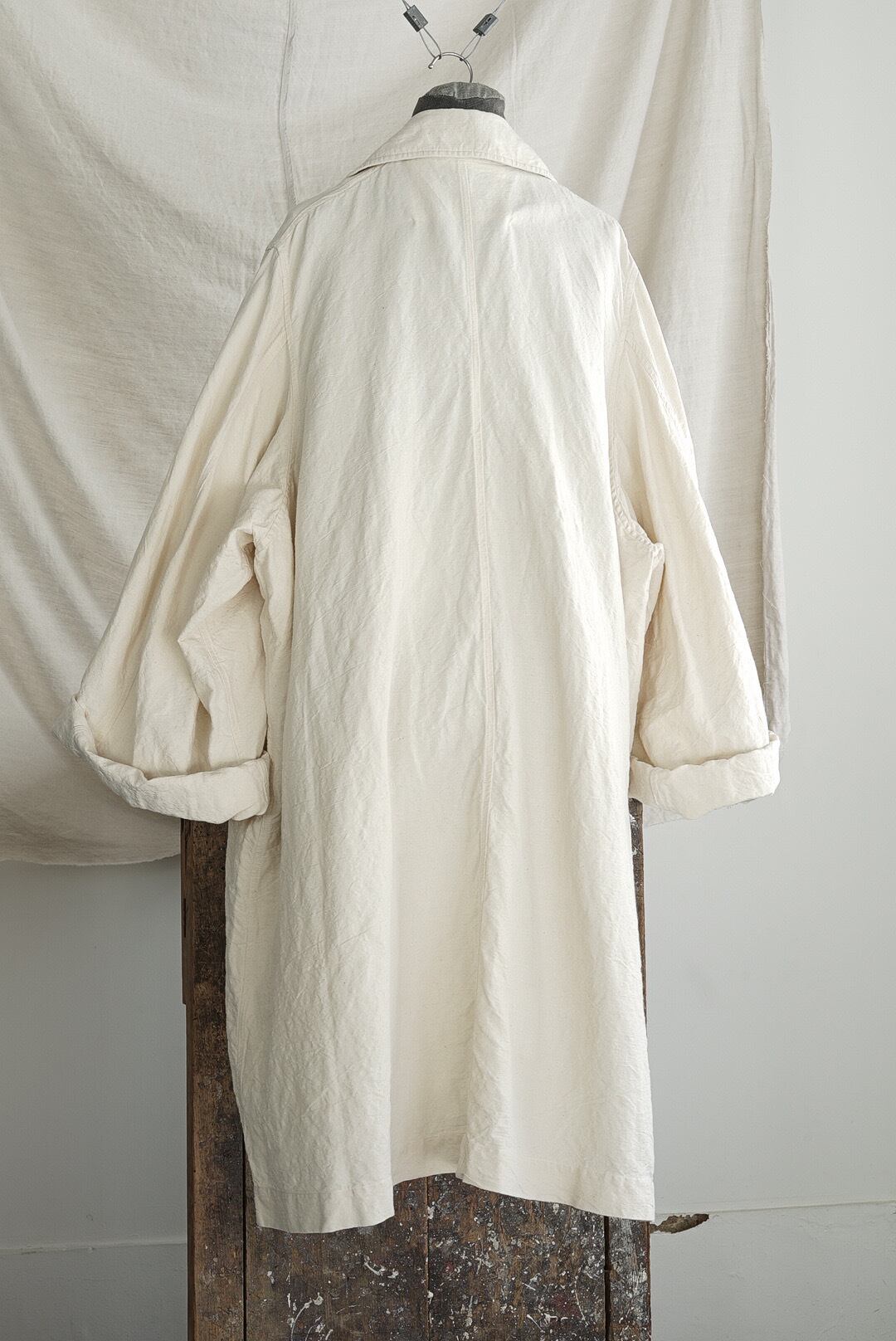 1960年代のフレンチミリタリー、オフィサートレンチコートをベースに再解釈を施したアイテム。オリジナルデザインからガンフラップ/チンストラップ/エポレット/ウエストベルトなどのディティールを差し引く事で、シンプルに洗練されたAラインのオーバーコートに。さらに、後面のインバーテッドプリーツを無くしたノーベントの仕様は、無機質でエレガントな装いを促します。オリジナルから比較すると袖周りをエンラージ(拡大)、ヘムにかけて大きく長く伸びるスリーブはロールアップ着用にてバランスとムーブを作ります。揺らぎ・靡き・膨らみなど、生地の動きをダイレクトに楽しめるシルエットは、使用する1960年代のハリのあるヴィンテージフレンチリネンを活かします。古布の表情をダイレクトに楽しめる未染色のナチュラルカラー。ホーンボタンディティール、内側胸にポケット。