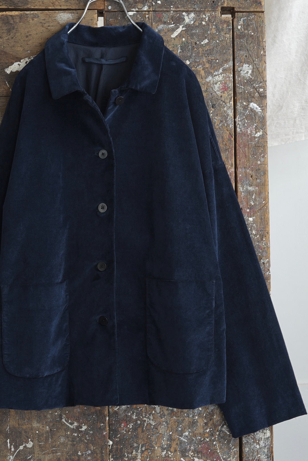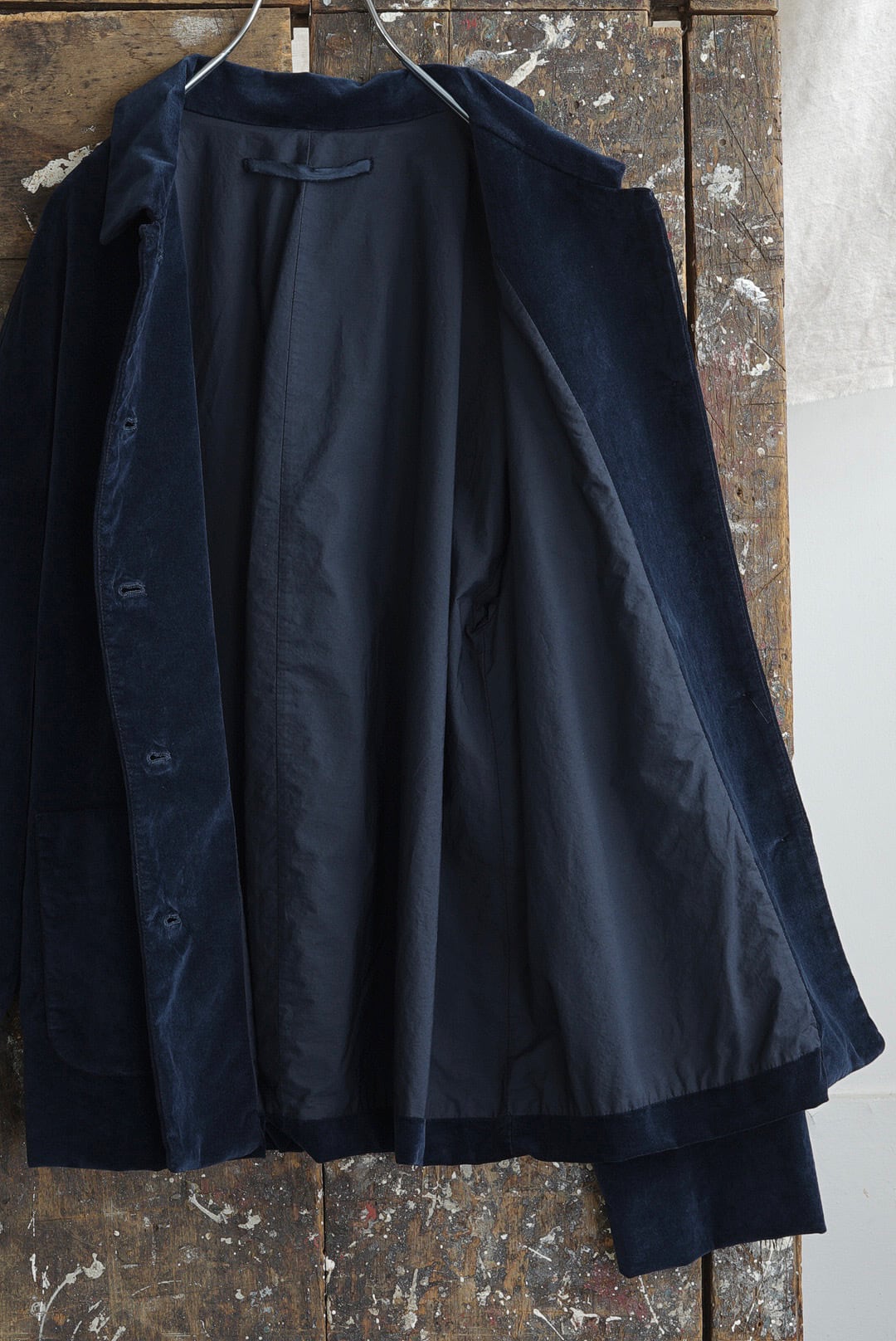 フロント5ボタンのシャツ型ブレザー。スマートな趣のフレンチフロント仕様。カバーオールの実用性を持ちつつ軽快な印象のコンパクトシルエット。コットンをベースに伸縮性を加えたベルベット素材。製品自体を染める工程を経ることで、他にはない鈍い光沢と豊かな表情を纏う、濃厚かつ鮮やかさを備えるソフィスティケートされたインクブルーカラー。アクセントになる大振りのパッチポケット。袖通りの良いペーパーコットンのフルライニングは防風性も高めます。