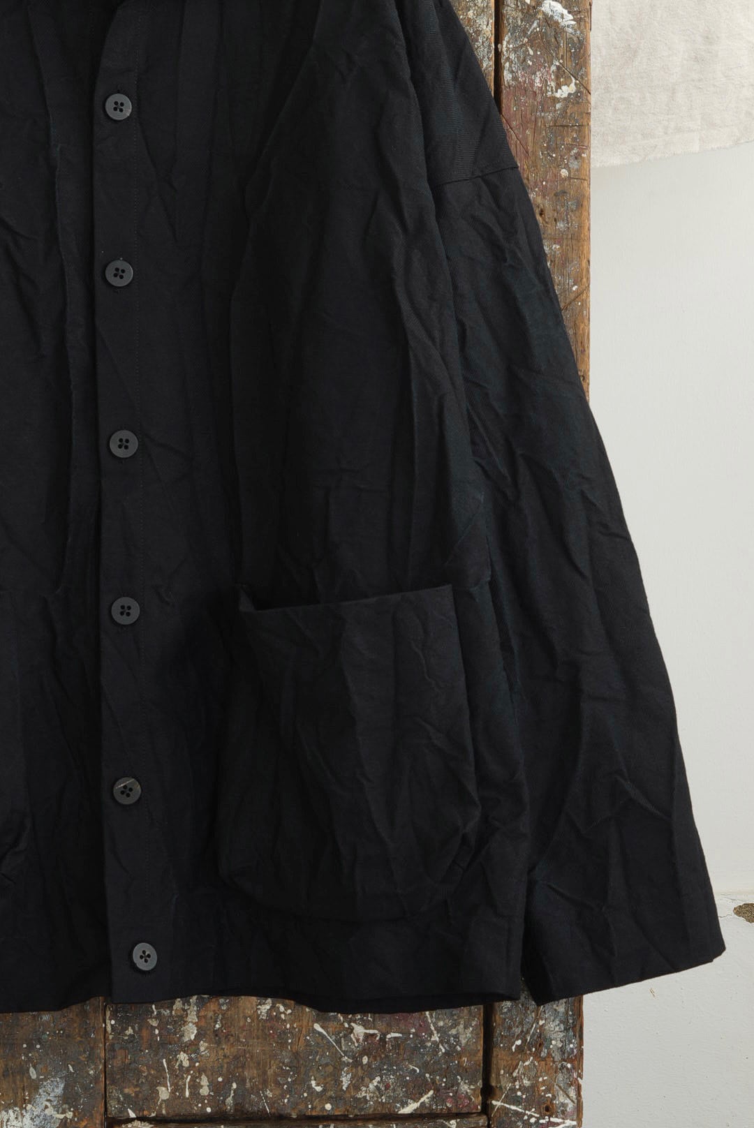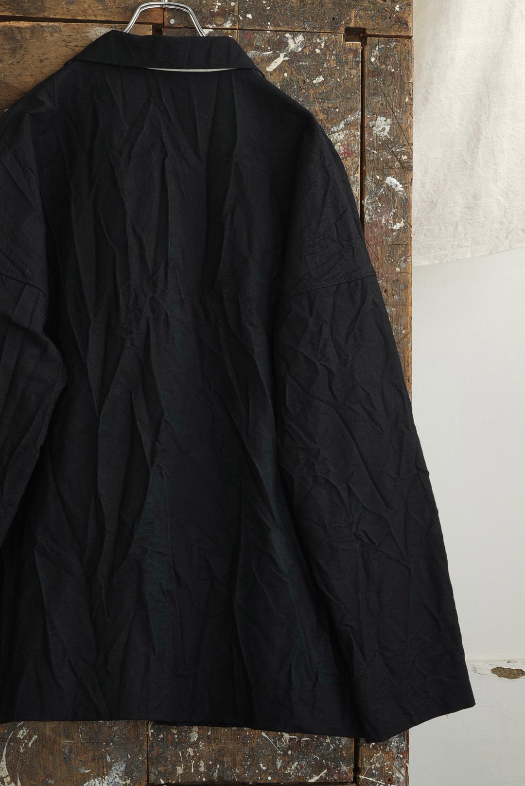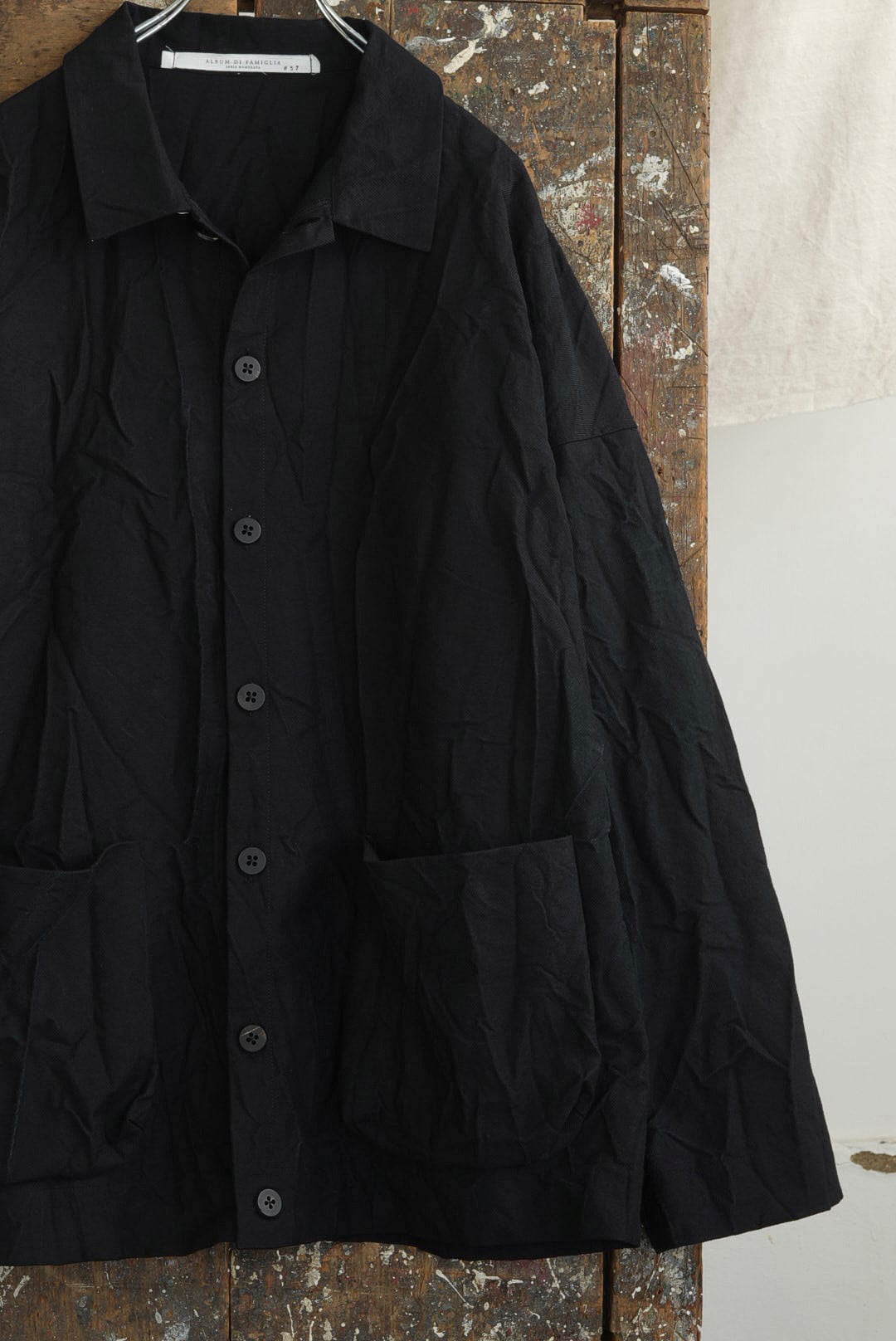 コレクションにおいて最上級のファブリックを使用した、アイテム毎にシリアルナンバーを持つラグジュアリーライン「SERIE NUMERATA」。クラッシュコットンと称されたファブリックは、タフなツイルにリンクル加工を施し、不規則な凹凸を加え立体的で表情豊かな雰囲気を生み出しています。厚く高密度に織られたファブリックは、着用の度に身体に馴染む工程を共にし、時を重ねるごとに風合いが増してゆきます。フロント7ボタンのシャツ型ドロップショルダージャケット。カバーオールの実用性を持ちつつ軽快な印象の着用ができる、インナーやシーズンを問わないオールラウンダー。アンライニング仕様に筒袖のディティール故に、袖をクルクルと巻くし上げラフな着こなしも可能です。アクセントになる大振りのパッチポケット。