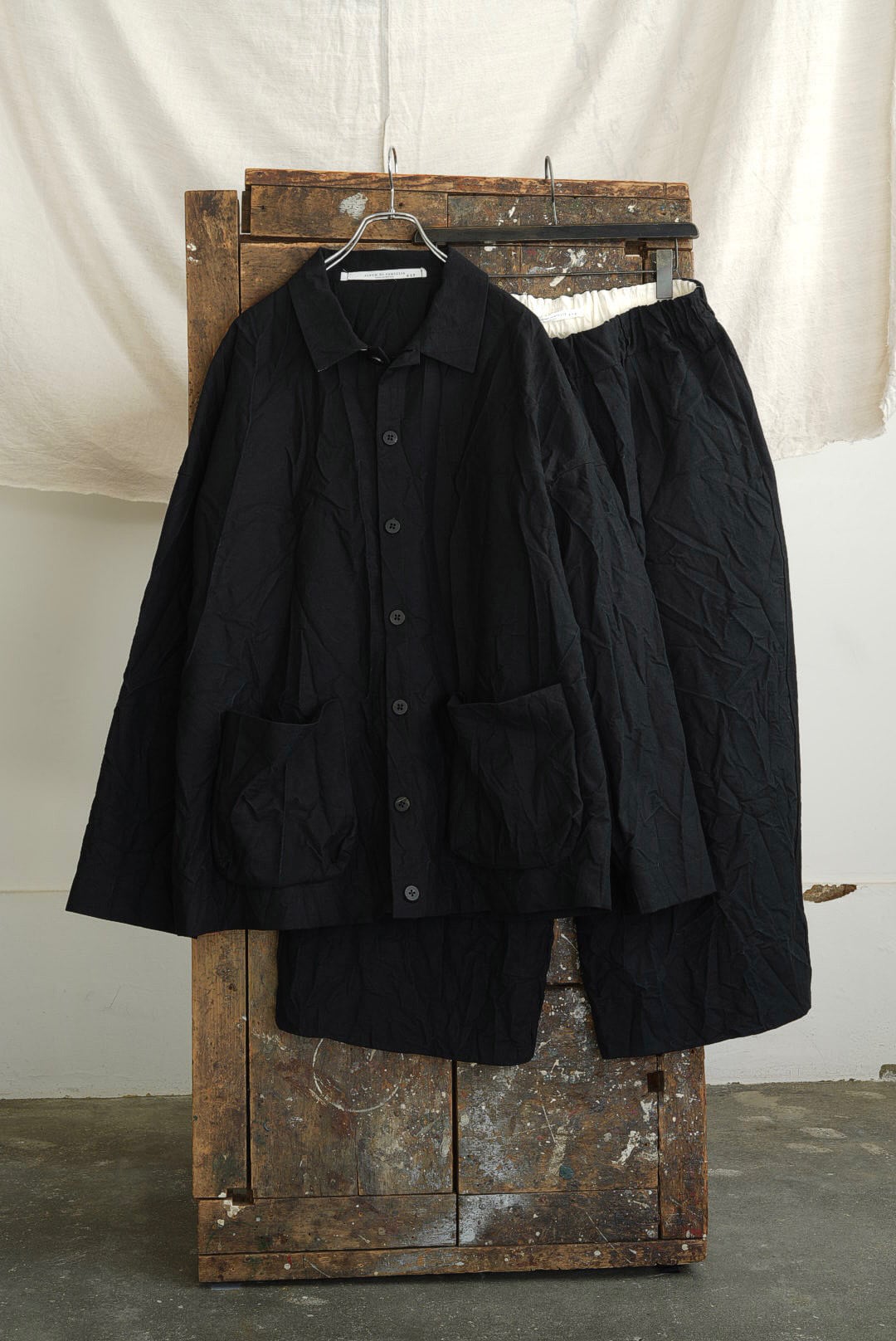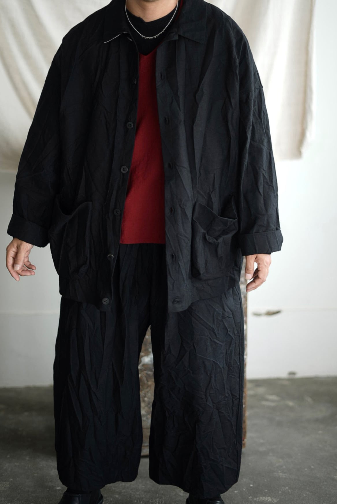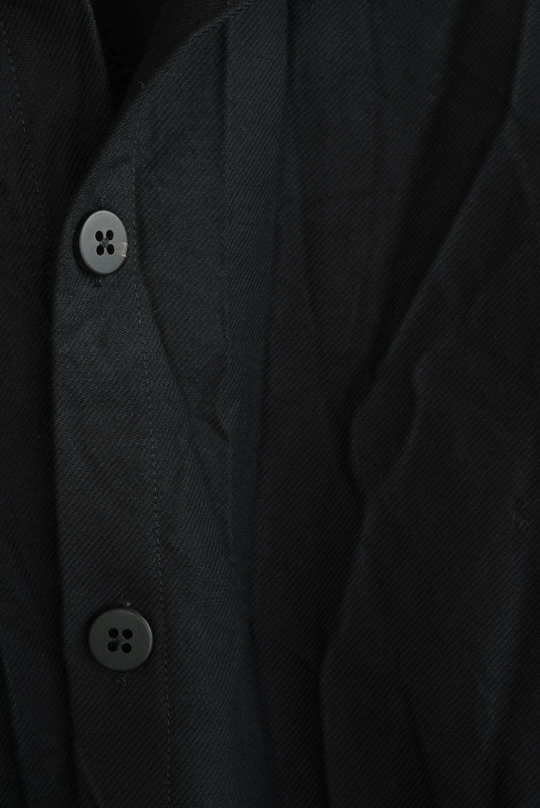 コレクションにおいて最上級のファブリックを使用した、アイテム毎にシリアルナンバーを持つラグジュアリーライン「SERIE NUMERATA」。クラッシュコットンと称されたファブリックは、タフなツイルにリンクル加工を施し、不規則な凹凸を加え立体的で表情豊かな雰囲気を生み出しています。厚く高密度に織られたファブリックは、着用の度に身体に馴染む工程を共にし、時を重ねるごとに風合いが増してゆきます。フロント7ボタンのシャツ型ドロップショルダージャケット。カバーオールの実用性を持ちつつ軽快な印象の着用ができる、インナーやシーズンを問わないオールラウンダー。アンライニング仕様に筒袖のディティール故に、袖をクルクルと巻くし上げラフな着こなしも可能です。アクセントになる大振りのパッチポケット。