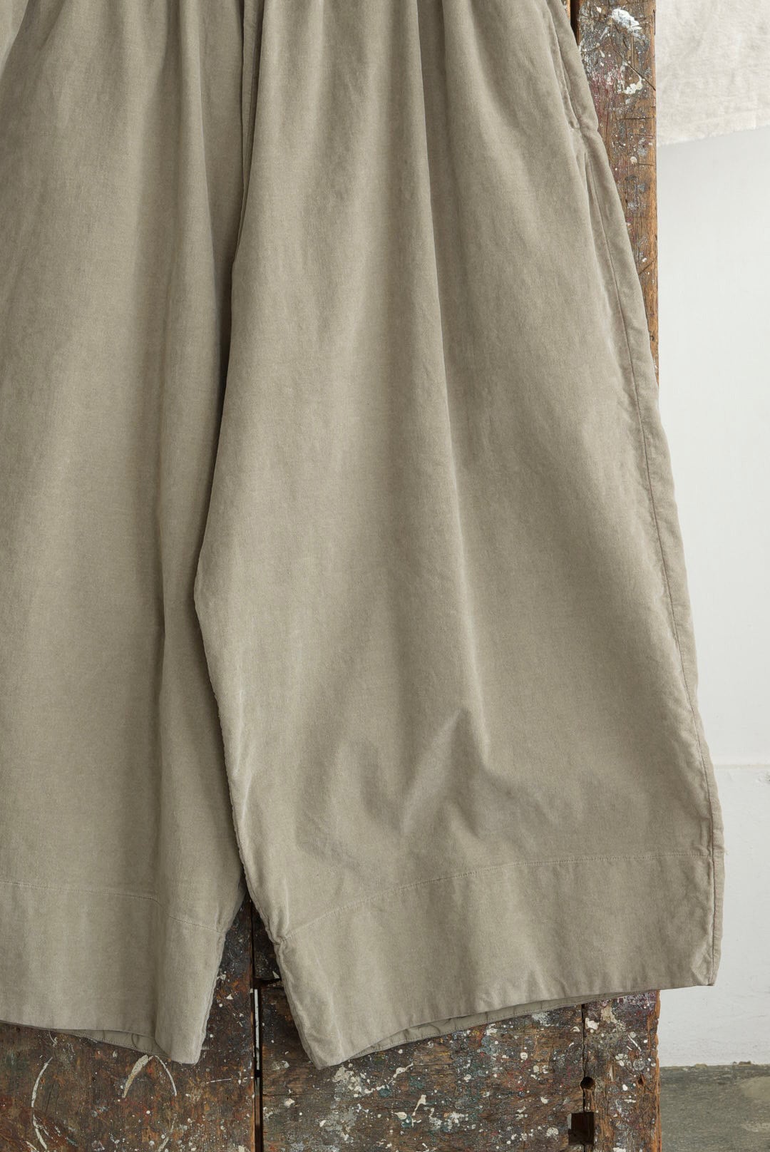 丸みを帯びたリラックスシルエットにモードな雰囲気が共存する、ALBUM DI FAMIGLIAを象徴するようなデザイン。ワイドフィットトラウザーズ。コットンをベースに伸縮性を加えたベルベット素材。縫製後の製品を染める工程を経ることで、他にはない鈍い光沢と豊かな表情を纏う、優しくも洗練されたマロングラッセカラー。大振りの外付けバックポケットと太いタタキ幅のグッドバランス。ウエストエラスティック&ドローストリング仕様。