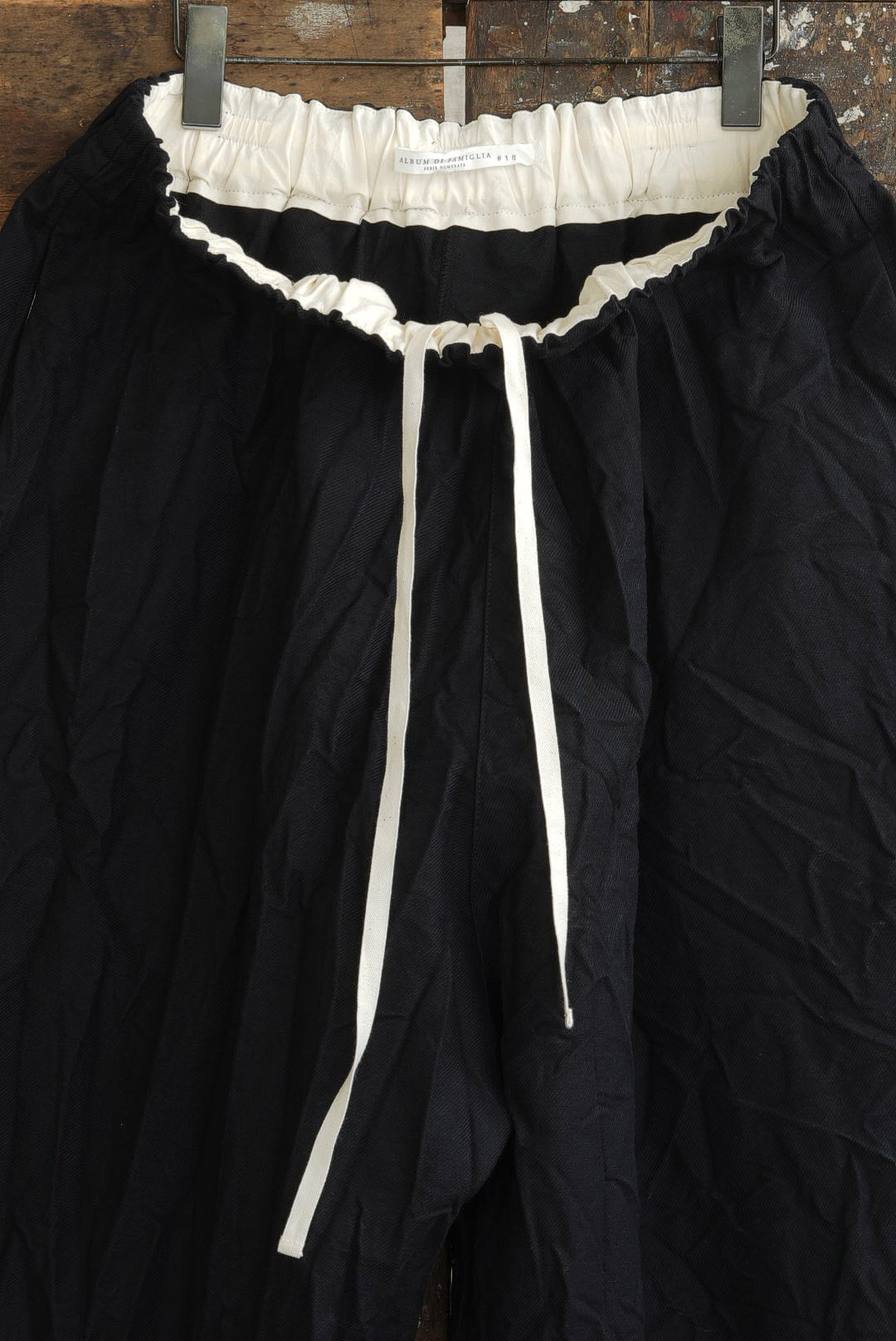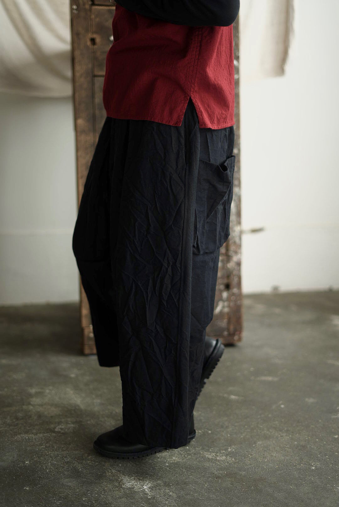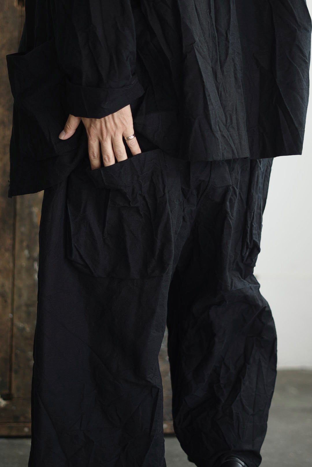 コレクションにおいて最上級のファブリックを使用した、アイテム毎にシリアルナンバーを持つラグジュアリーライン「SERIE NUMERATA」。クラッシュコットンと称されたファブリックは、タフなツイルにリンクル加工を施し、不規則な凹凸を加え立体的で表情豊かな雰囲気を生み出しています。厚く高密度に織られたファブリックは、着用の度に身体に馴染む工程を共にし、時を重ねるごとに風合いが増してゆきます。丸みを帯びたリラックスシルエットにモードな雰囲気が共存するワイドフィットトラウザーズ。サイドポケットとアクセントになる大振りのパッチバックポケット。ウエスト内側にドローストリング付き。
