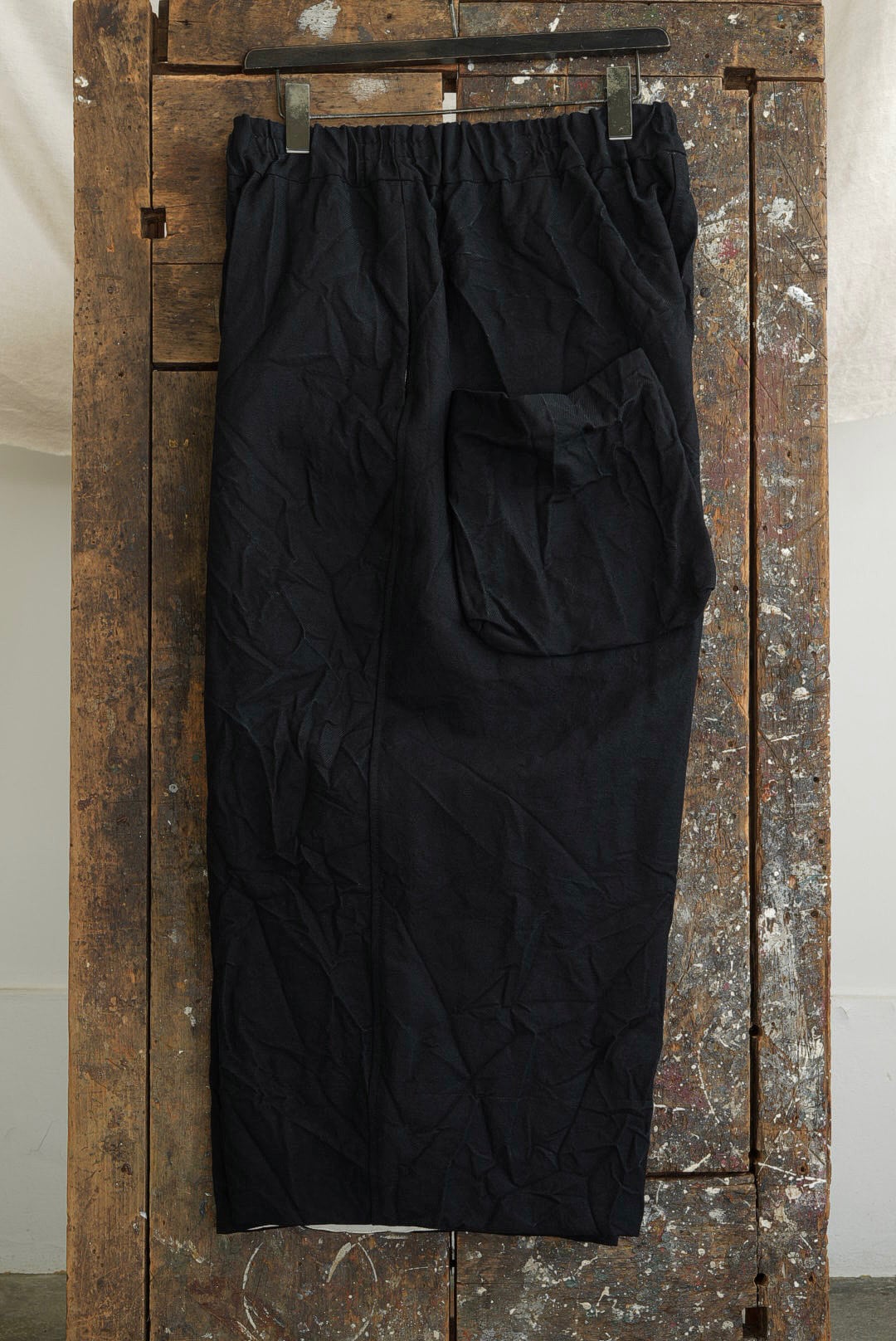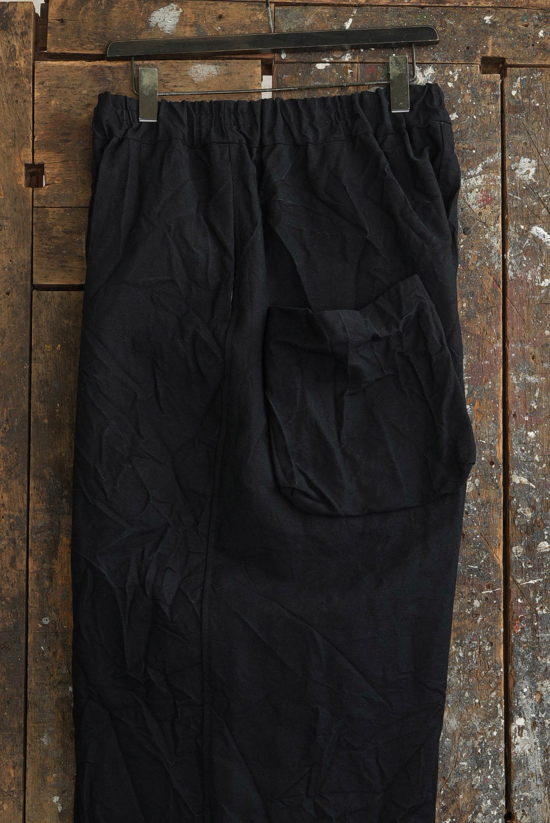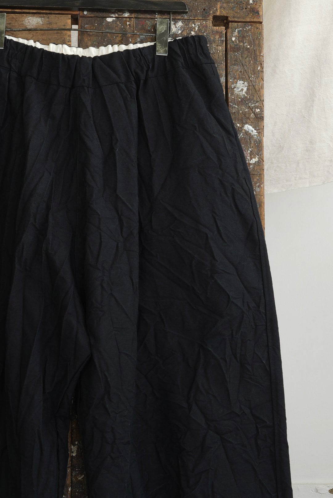 コレクションにおいて最上級のファブリックを使用した、アイテム毎にシリアルナンバーを持つラグジュアリーライン「SERIE NUMERATA」。クラッシュコットンと称されたファブリックは、タフなツイルにリンクル加工を施し、不規則な凹凸を加え立体的で表情豊かな雰囲気を生み出しています。厚く高密度に織られたファブリックは、着用の度に身体に馴染む工程を共にし、時を重ねるごとに風合いが増してゆきます。丸みを帯びたリラックスシルエットにモードな雰囲気が共存するワイドフィットトラウザーズ。サイドポケットとアクセントになる大振りのパッチバックポケット。ウエスト内側にドローストリング付き。