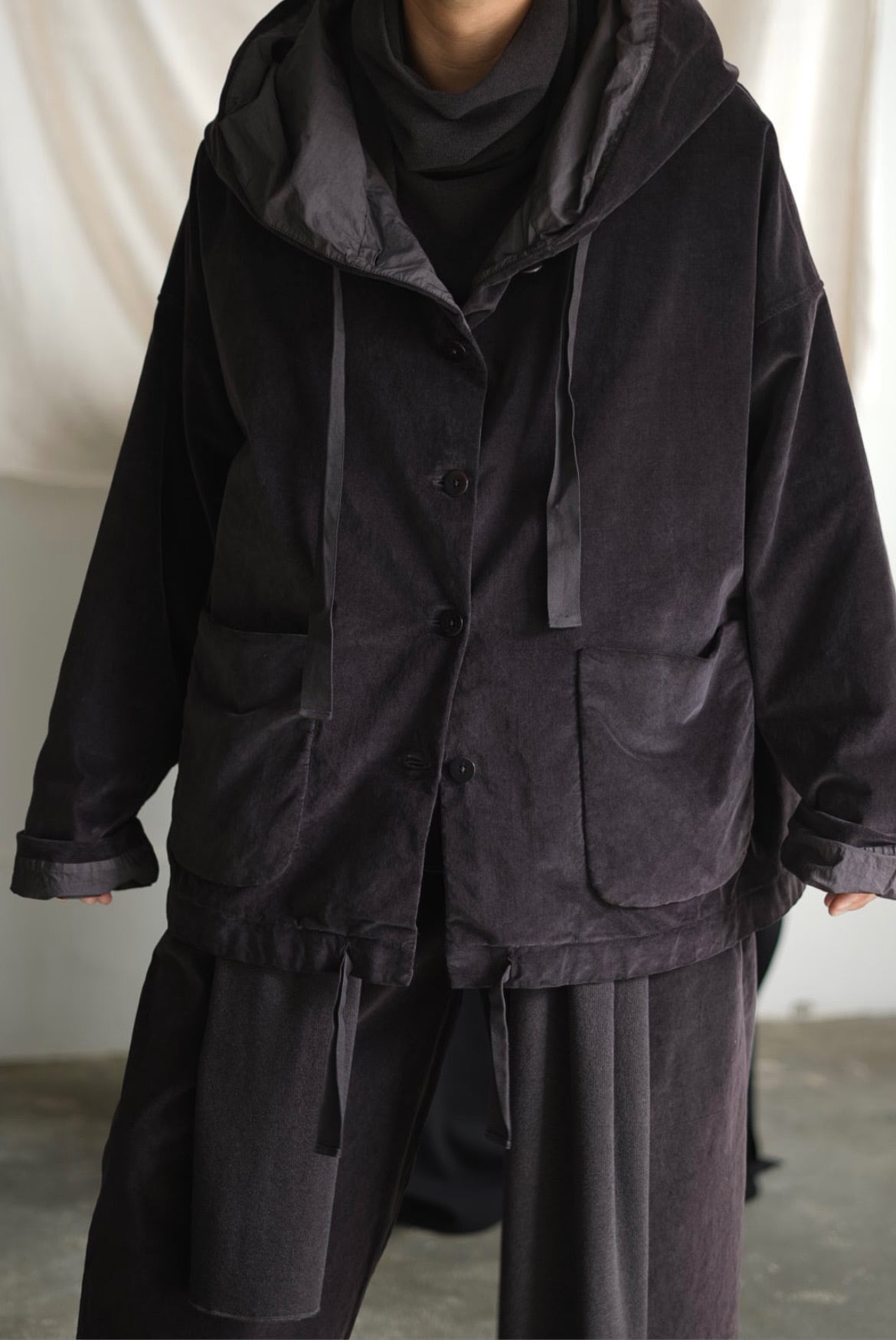 「ALBUM DI FAMIGLIA」のシグネチャーアイテム、ドロップショルダーのスクエアシルエットブレザーをベースに、フードをあしらいモディファイドされたアイテム。ビッグフード&リラックスフィットのポンチョライクなジャケット。カジュアルに傾倒しない。スマートな趣のフレンチフロントのボタン仕様。シルエットのバランスを整える緩やかなラウンドテール。ヘムのアジャスターテープによりシルエットの矯正が可能です。コットンをベースに伸縮性を加えたベルベット素材。製品自体を染める工程を経ることで、他にはない鈍い光沢と豊かな表情を纏う、高級感を感じるチョコレートカラー。袖通りの良いペーパーコットンのフルライニングは防風性も高めます。モデル : 174センチ