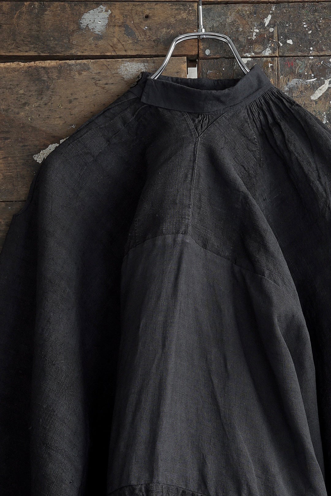 デザイナー自身が収集した1900年代初頭のフレンチワークウェア、デッドストックのファーマースモックを再構築したモデル。始めに、ベースとなるスモックを製品染にてブラックに染色。その後、ボディからスリーブを切り離し、胴/袖部分に別布のヴィンテージフレンチリネン(染色済)を付け加えドッキング。通常ではサイズバランスが"着"難しいアイテムがモダンなオーバーシルエットになることで、古い織物特有の弾力あるテクスチャーが活かされドレープを纏う製品に生まれ変わります。当時の手作業によるピンタック、細かく寄せられたギャザーや胸元に残るイニシャルなど、ヴィンテージ故のアーティザナルなディティールが印のようにデザインと共存。現行の統制された生地にはない、ホームスパンならではのネップやスラブが自然な表情として製品に存在感をもたらしています。それぞれに個性があり、ひとつとして同じ物が存在しないアイテム。着込み洗濯を重ねることで、ソフトな風合いを増してゆき、着用者の身体に馴染み寄り添い、時を経て各々のヴィンテージとなっていく存在。