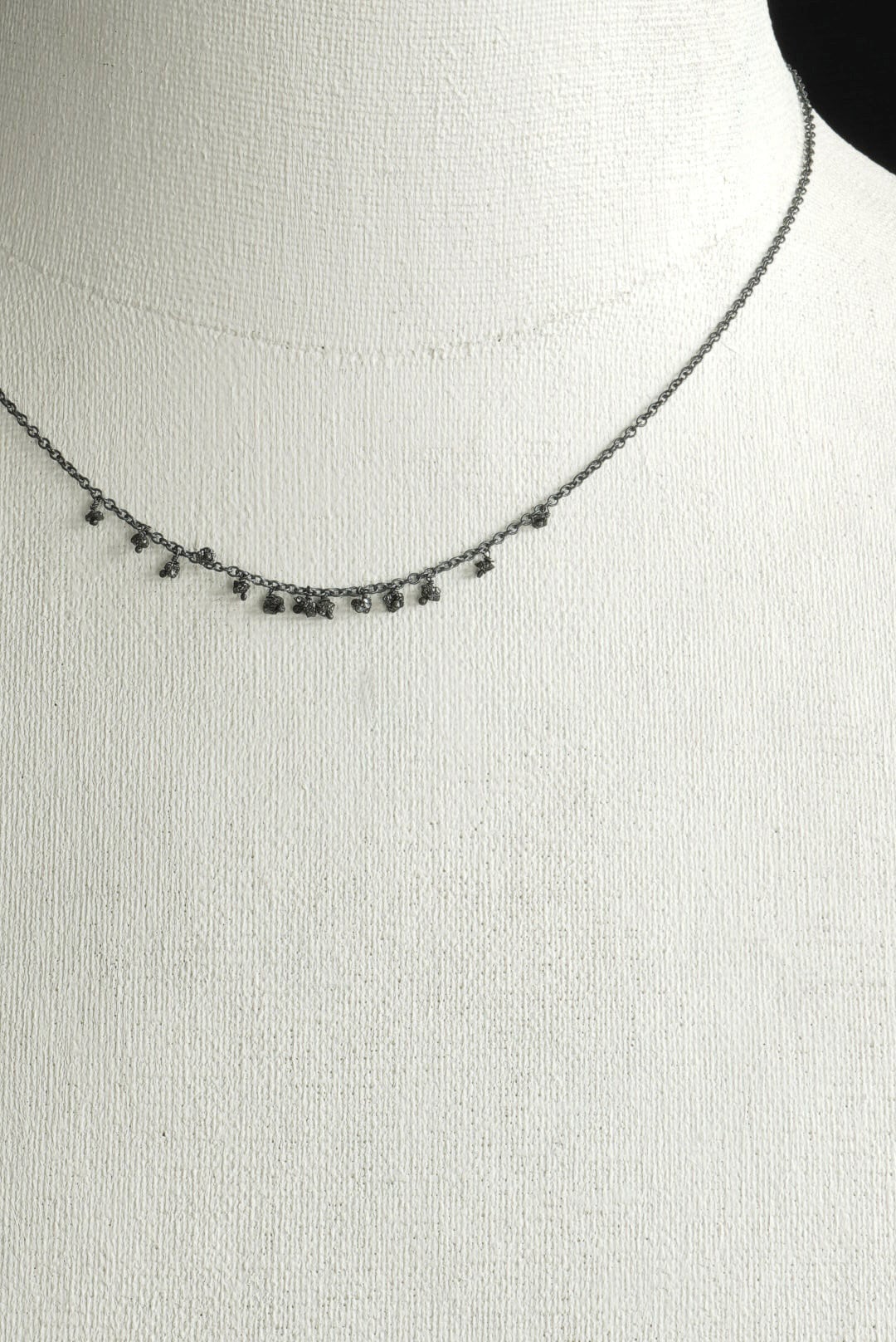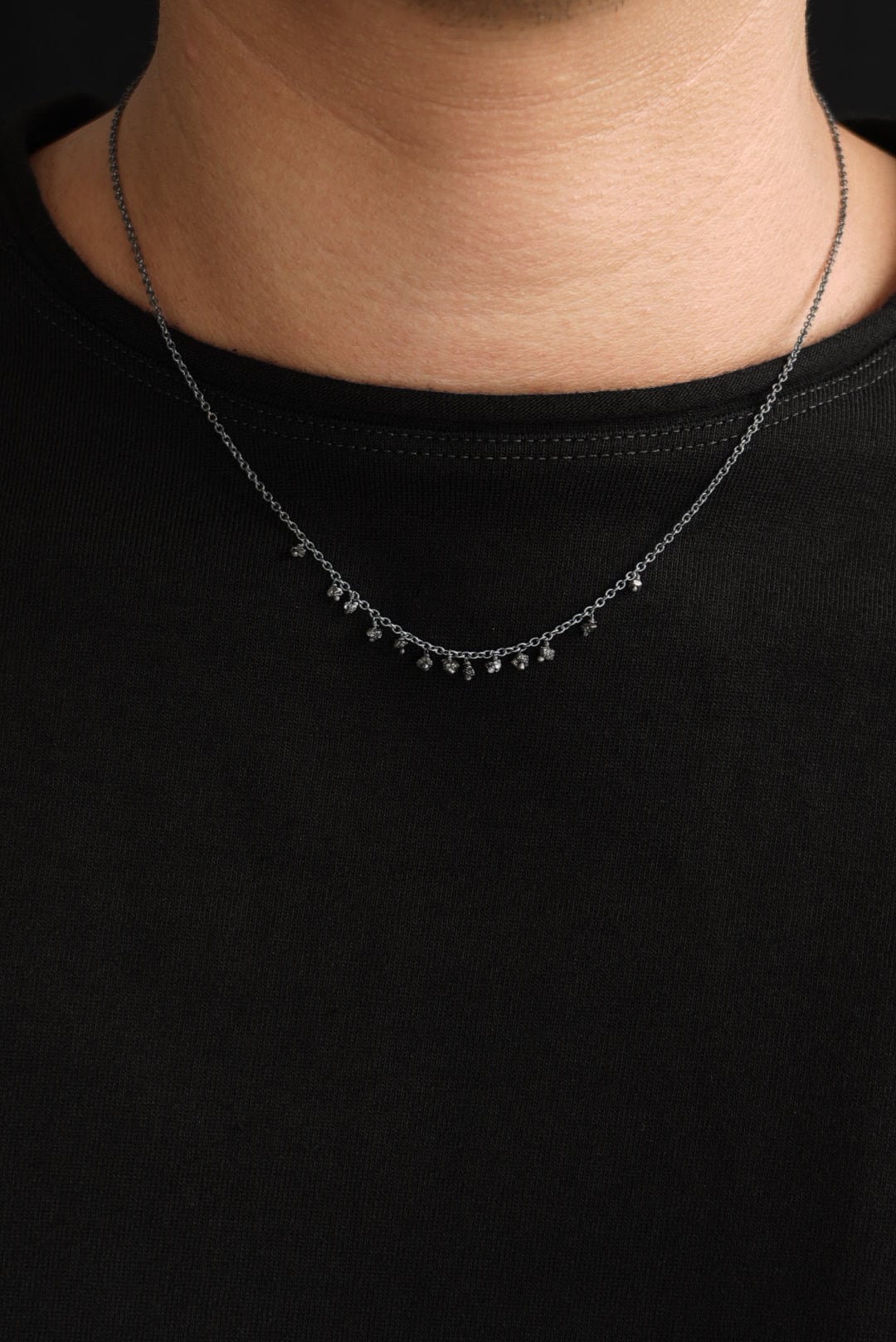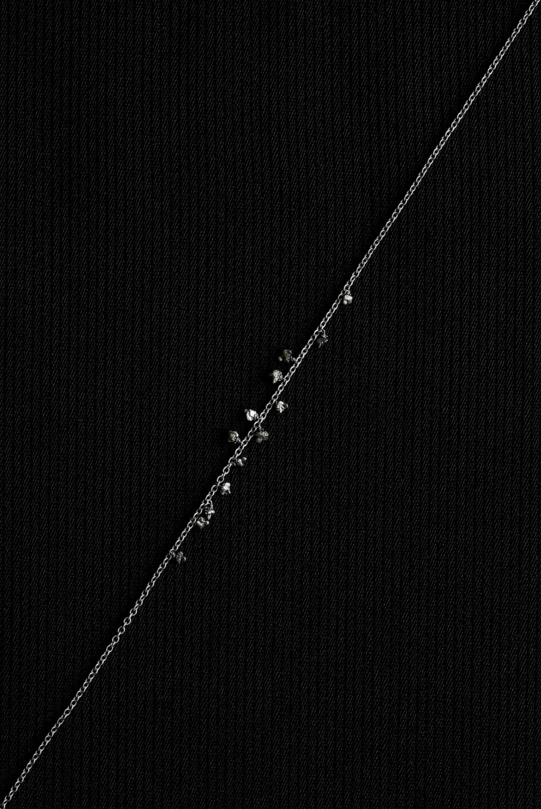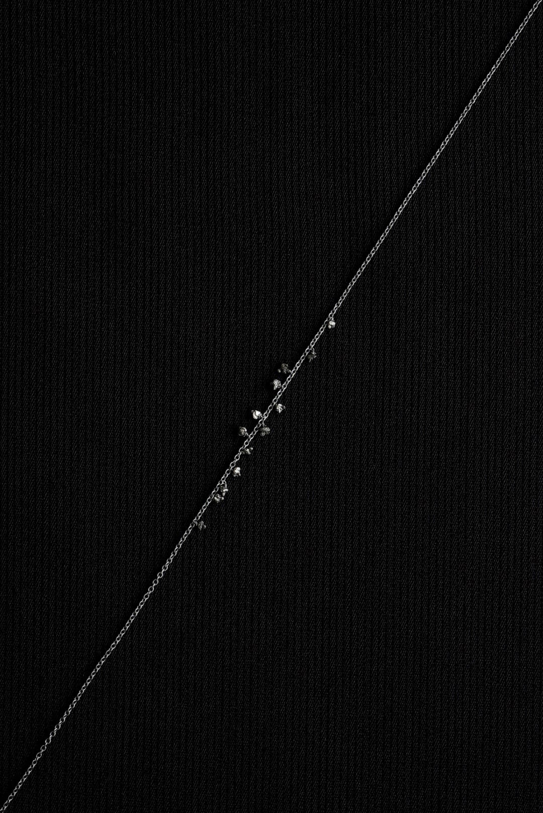オキシダイズ加工を施したブラックカラーの925スターリングシルバー、色調を抑えたなめらかなチェーン。日々のスタイリングに収まりの良い、控えめな印象のネックレスです。首元から覗く繊細ながらも確かなアクセントに、ランダムな配置で13粒のロウダイヤモンドをデコレーション。未研磨で不揃いのブラックダイアモンドが滴るようにあしらわれています。お好みのネックレスと組み合わせて、独創性にあふれたスタイルを表現する楽しみも。