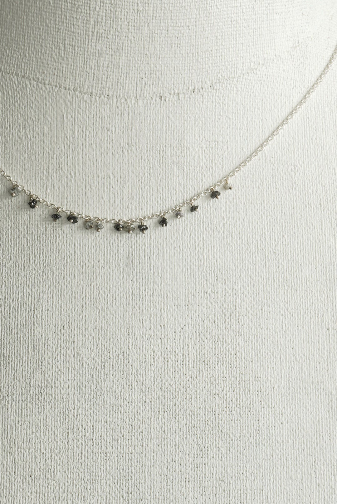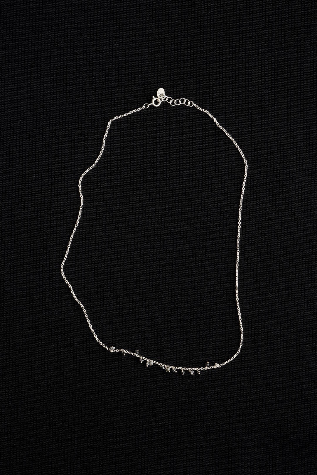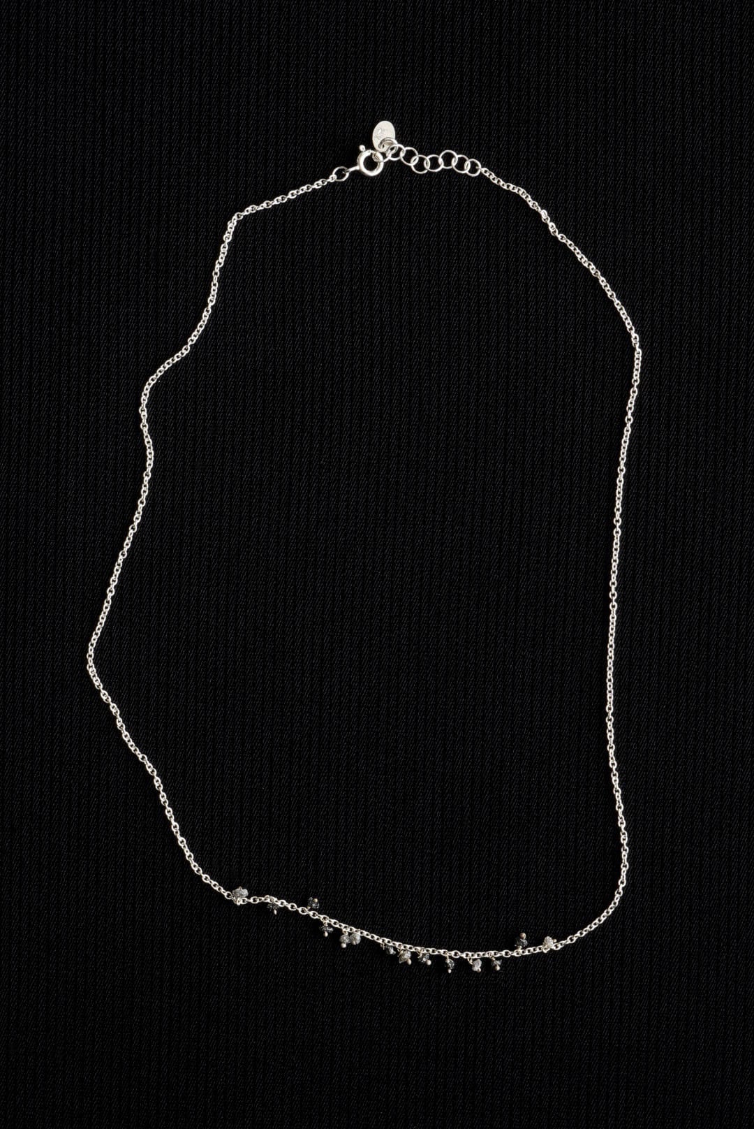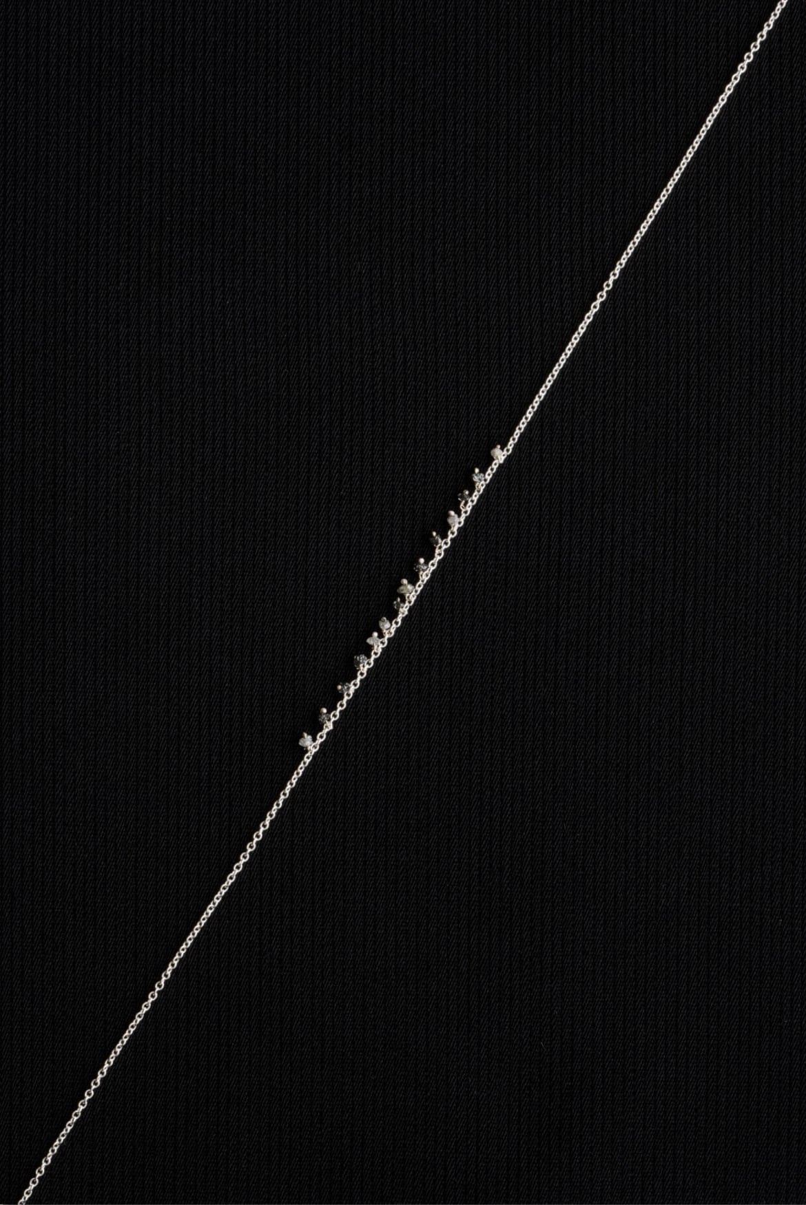 925スターリングシルバーチェーン。日々のスタイリングに収まりの良い、控えめな印象のネックレスです。首元から覗く繊細ながらも確かなアクセントに、ランダムな配置で13粒のロウダイヤモンドをデコレーション。未研磨で不揃いのダイアモンドが滴るようにあしらわれています。お好みのネックレスと組み合わせて、独創性にあふれたスタイルを表現する楽しみも。