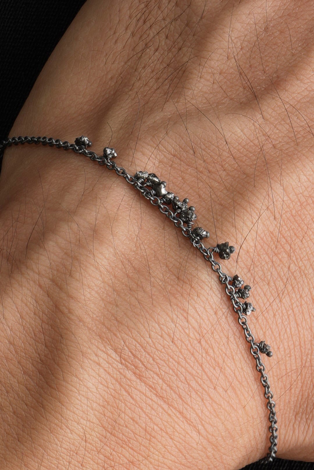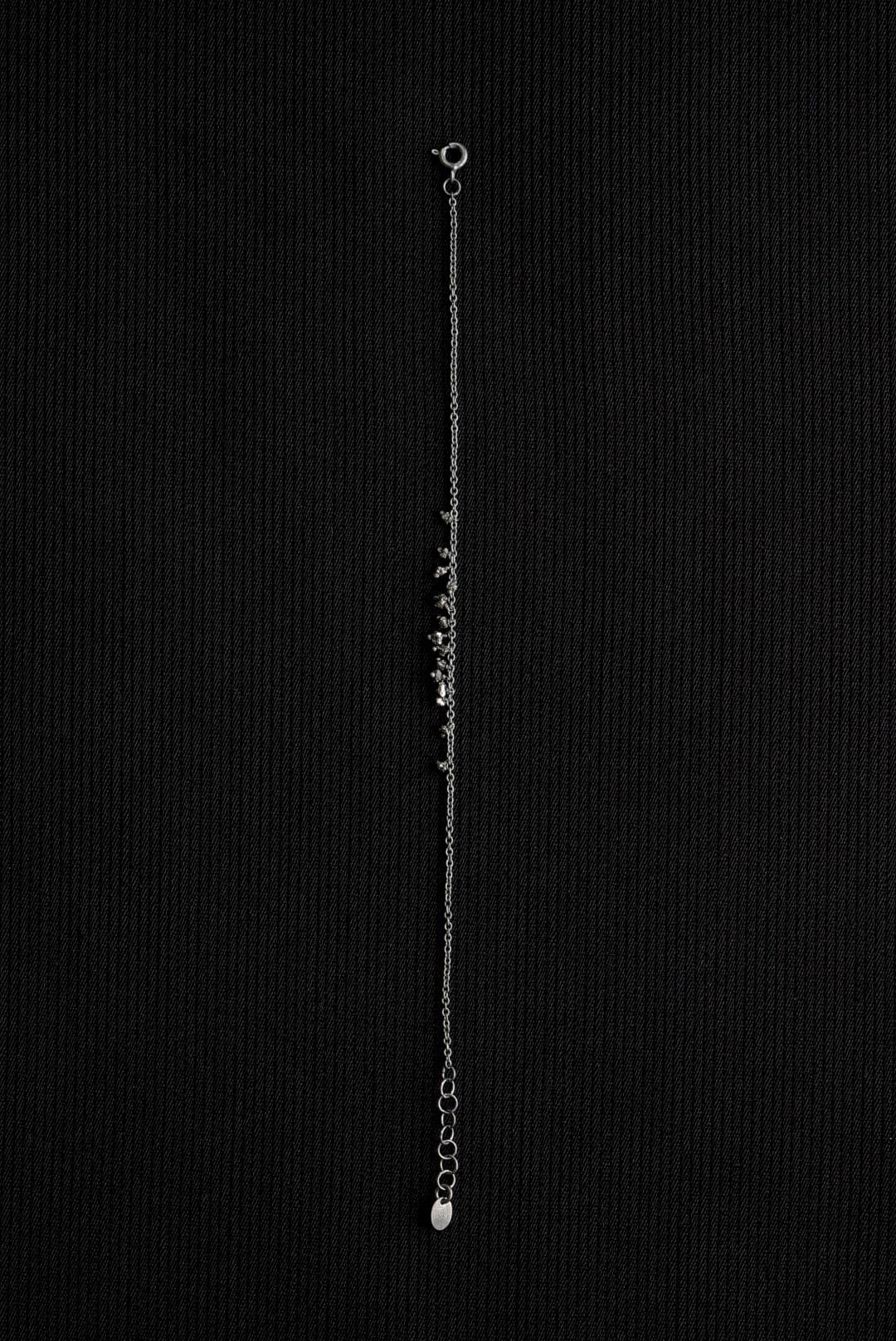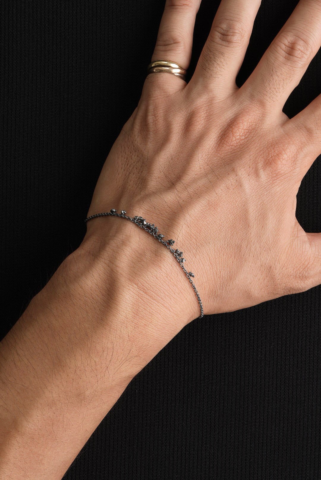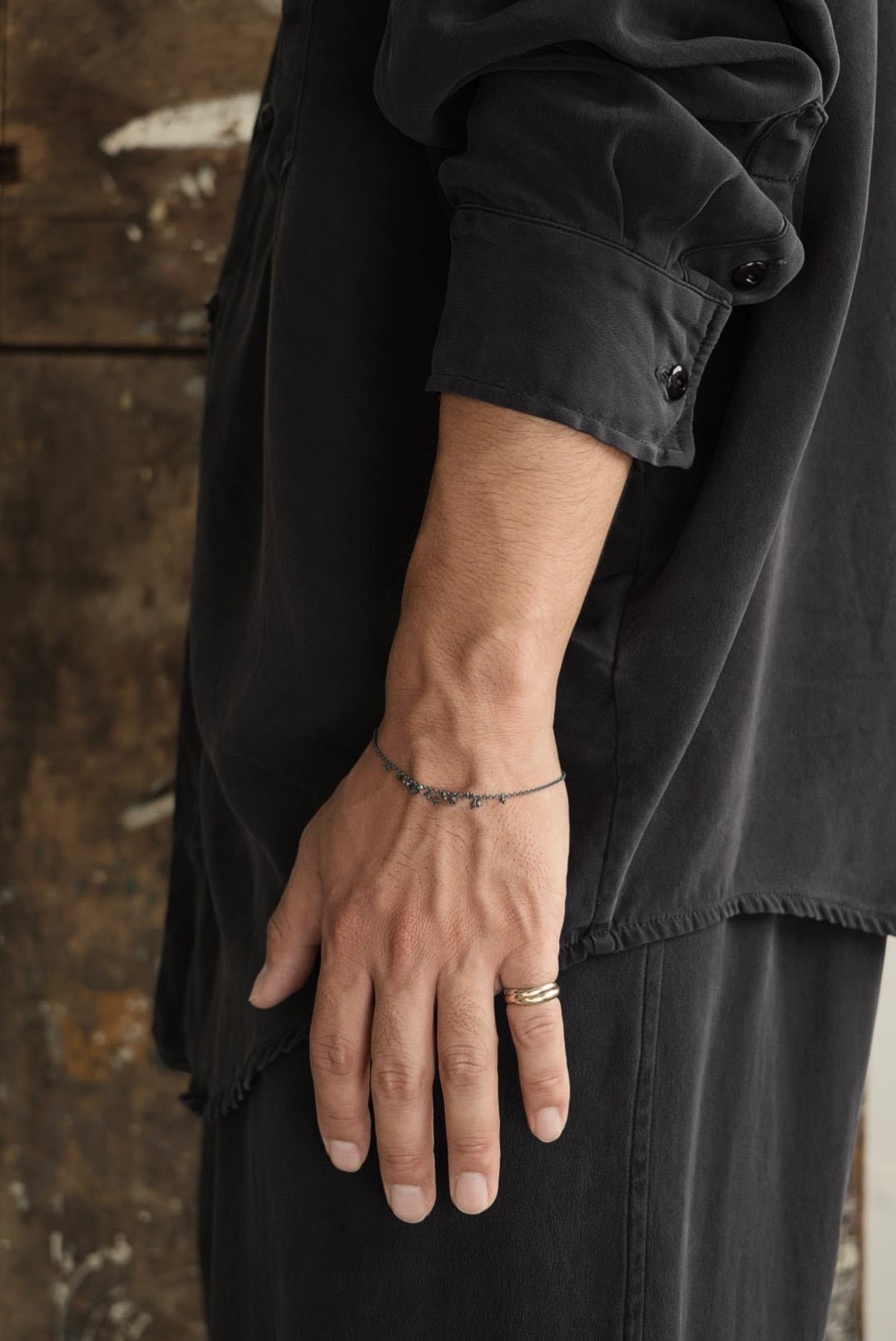 オキシダイズ加工を施したブラックカラーの925スターリングシルバー、色調を抑えたなめらかなチェーン。日々のスタイリングに収まりの良い、控えめな印象のブレスレットです。袖から覗く繊細ながらも確かなアクセントに、ランダムな配置で14粒のロウダイヤモンドをデコレーション。未研磨で不揃いのブラックダイアモンドが滴るようにあしらわれています。お好みのブレスレットと組み合わせて、独創性にあふれたスタイルを表現する楽しみも。