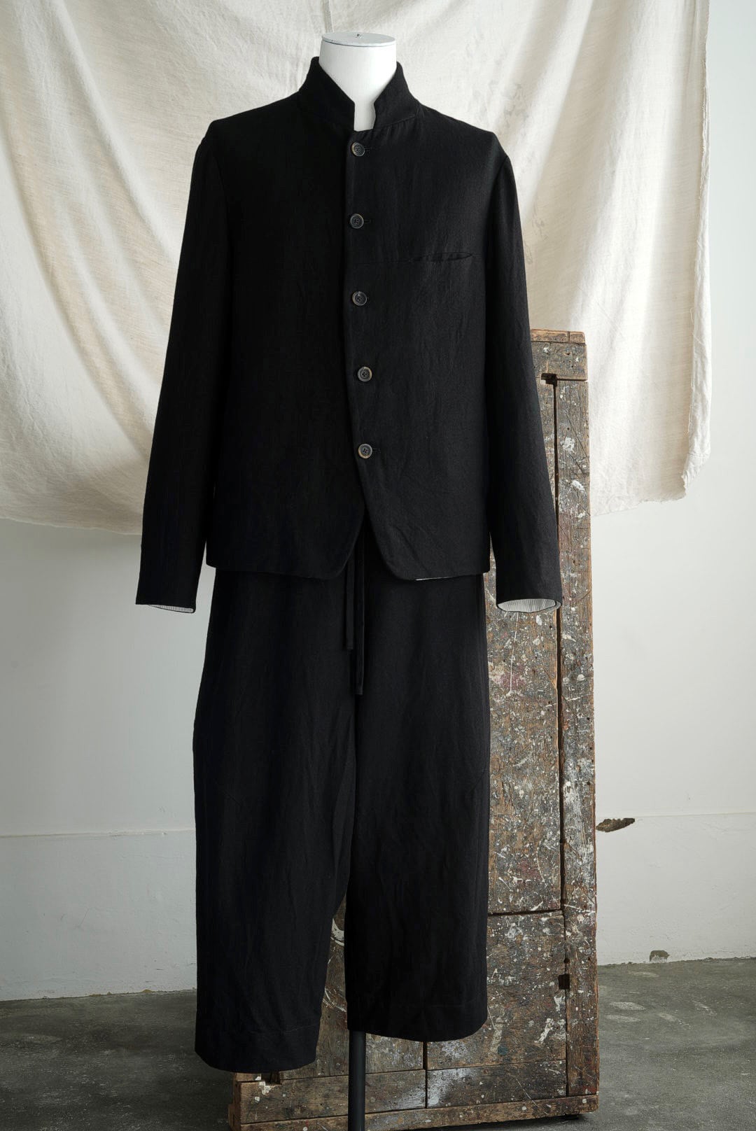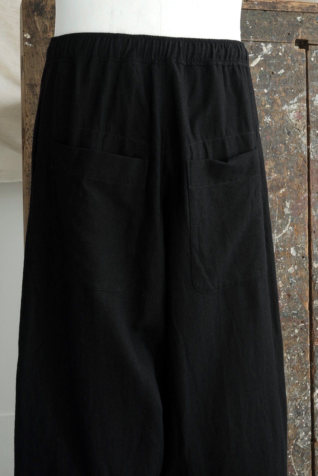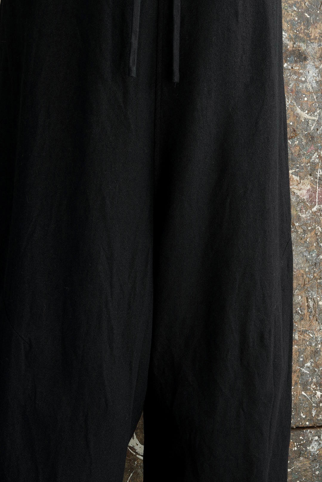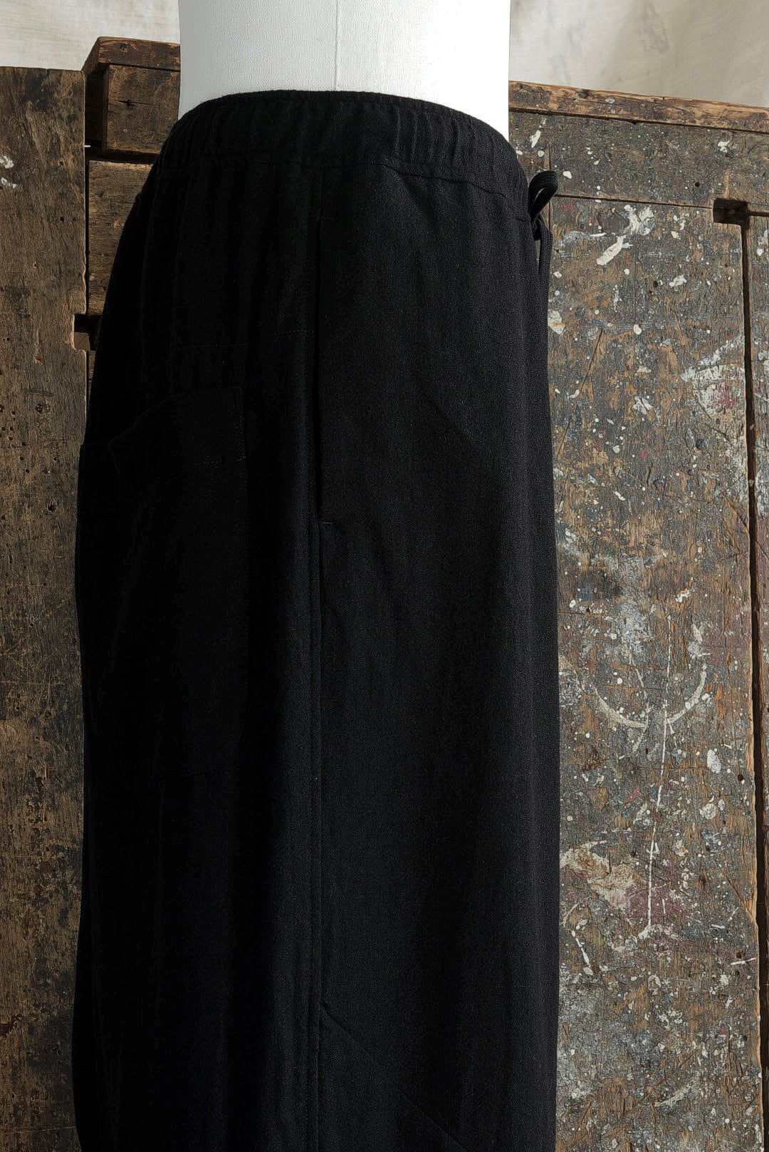 エラスティック仕様のウエストにドローコードを内蔵した、イージーフィットのプルオンパンツ。深い設定の股上と外側のサイドシームから膝にかけて伸びる1本のダーツ。削ぎ落とされたミニマルなデザインながらも、それだけで立体的な曲線美を作る洗練されたパターン。使用されるファブリックは、上質なウールの柔らかな風合いとコシを保ちながら、ラミー混ならではのざっくりした表情の粗野感を併せ持ちます。淀みのないシルエットを形成するためのノーフライフロント。サイドシームポケット/2バックポケット/ジャストレングス。