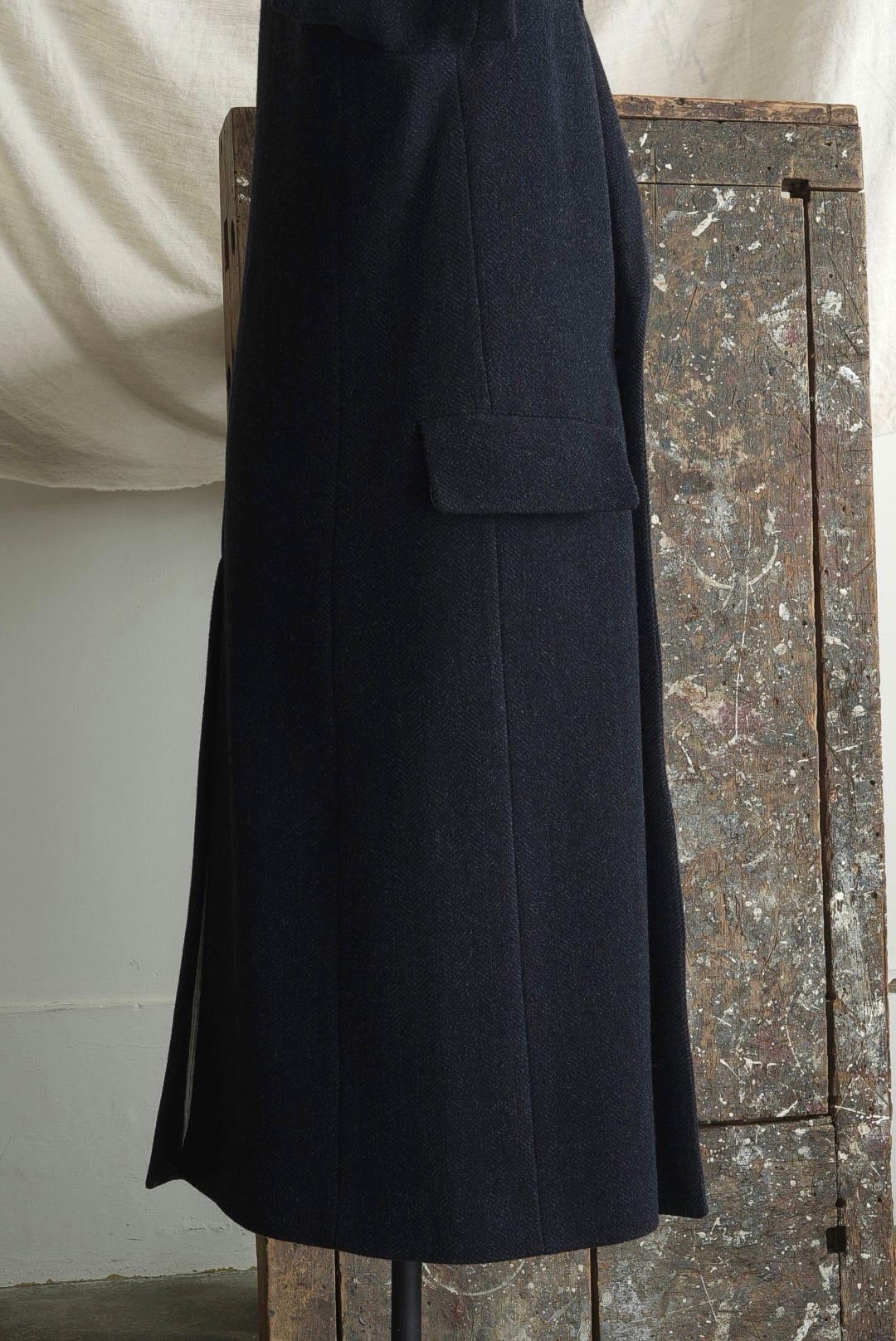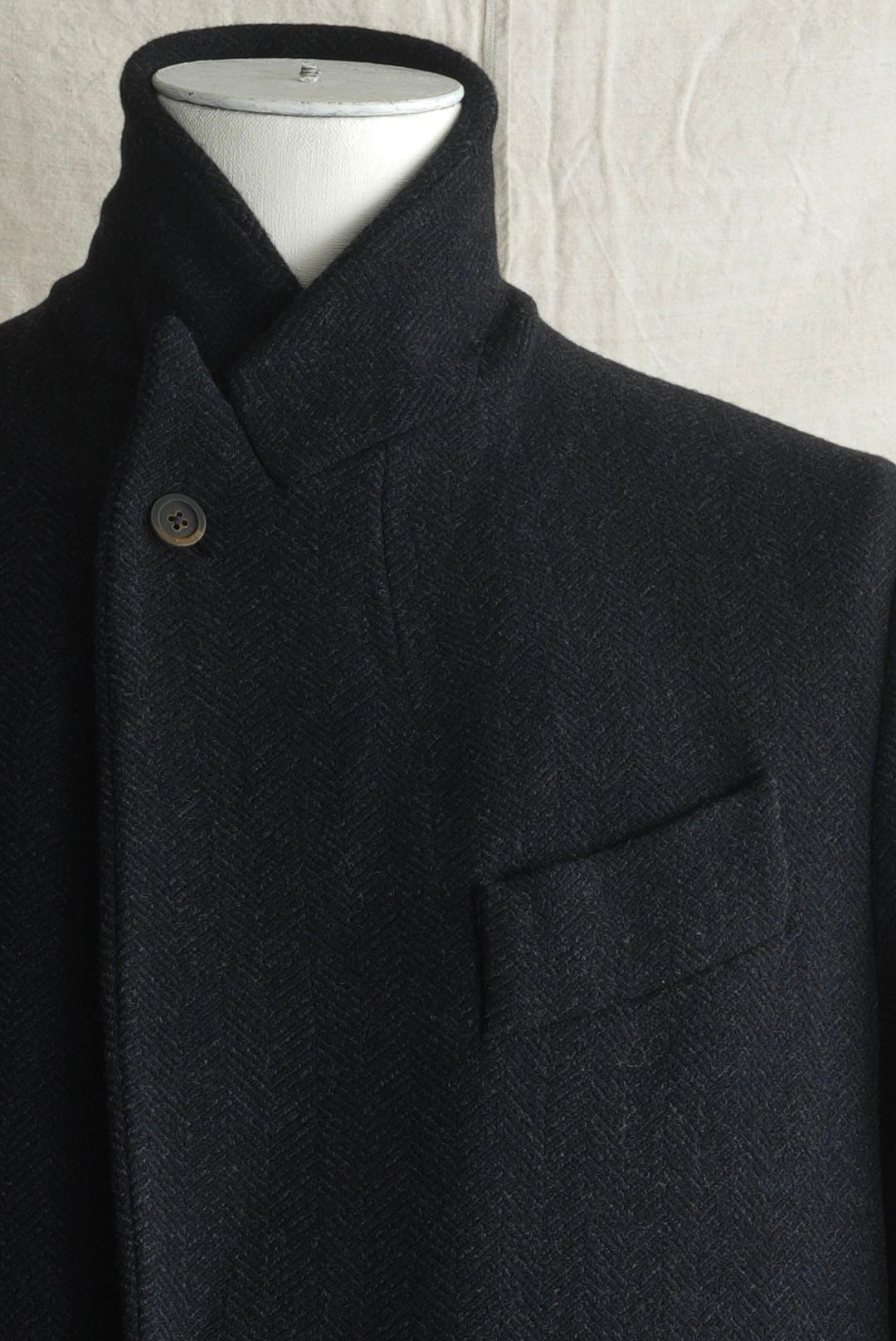 カシミア・ウールのマテリアルを贅沢にブレンドした、肉厚なファブリックのダブルブレステッドコート。ピークドラペルとヘリンボーンパターンの組み合わせがクラシックな表情を見せながらも、窮屈さを感じぬ柔らかな着用感です。脇から裾にかけてなだらかに広がるフレアードの切り替えし、テーパードの立体的な切り替えしが施されたアームにより、身体に寄り添いつつも優雅なAラインシルエットを形成します。11cm幅のラペル、5cm幅のバルカポケット、7.5cm幅のサイドフラップなど、各所のサイズ感が絶妙に調和し、ソフィスティケートされた印象。袖口は通常のボタンとホールの位置を入れ替えた本切羽2ボタン。表にボタンが露出しないエレガントなデザインが、引き算の装飾的な美しさを際立たせます。思慮深いストライプのフルライニング。着脱をスムーズにするアセテート&ビスコースの袖裏、耐久性と保温性に優れたコットンベースの胴裏、異なる2種類の生地を使用する丁寧さ。センターベント仕様。内側に配された機能的な2つのパッチポケット。着用モデル : 174センチ