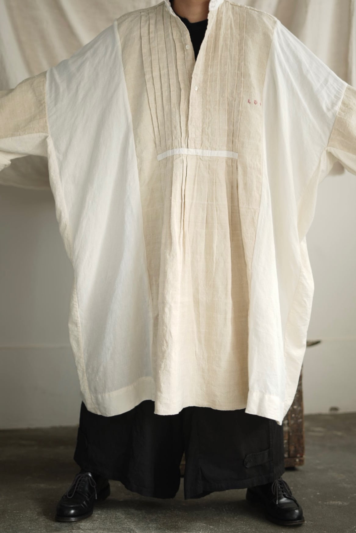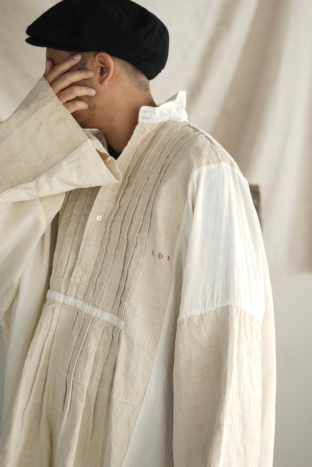 デザイナー自身が収集した1900年代初頭のフレンチワークウェア、デッドストックのファーマースモックを再構築したモデル。ベースとなるスモックのボディからスリーブを切り離し、胴/袖/サイド部分に別布のヴィンテージフレンチリネンを付け加えドッキング。通常ではサイズバランスが"着"難しいアイテムがモダンなオーバーシルエットになることで、古い織物特有の弾力あるテクスチャーが活かされドレープを纏う製品に生まれ変わります。現行の統制された生地にはない、ホームスパンならではのネップやスラブが自然な表情として製品に存在感をもたらしています。当時の手作業による無数のタック、細かく寄せられたギャザーや胸元に残るイニシャル(珍しいミドルネーム入りタイプ)など、ヴィンテージ故のアーティザナルなディティールが印のようにデザインと共存。それぞれに個性があり、ひとつとして同じ物が存在しないアイテムです。古布の表情をダイレクトに楽しめる未染色のナチュラルカラー。着込み洗濯を重ねることで、ソフトな風合いを増してゆき、着用者の身体に馴染み寄り添い、時を経て各々のヴィンテージとなっていく存在です。