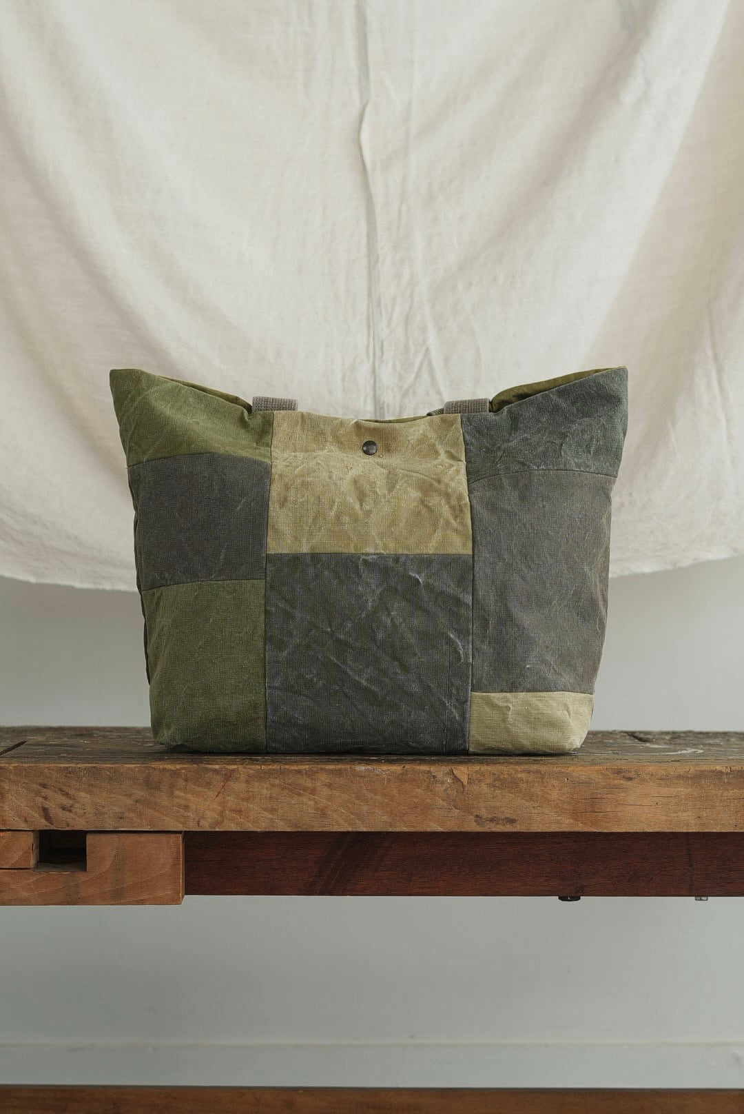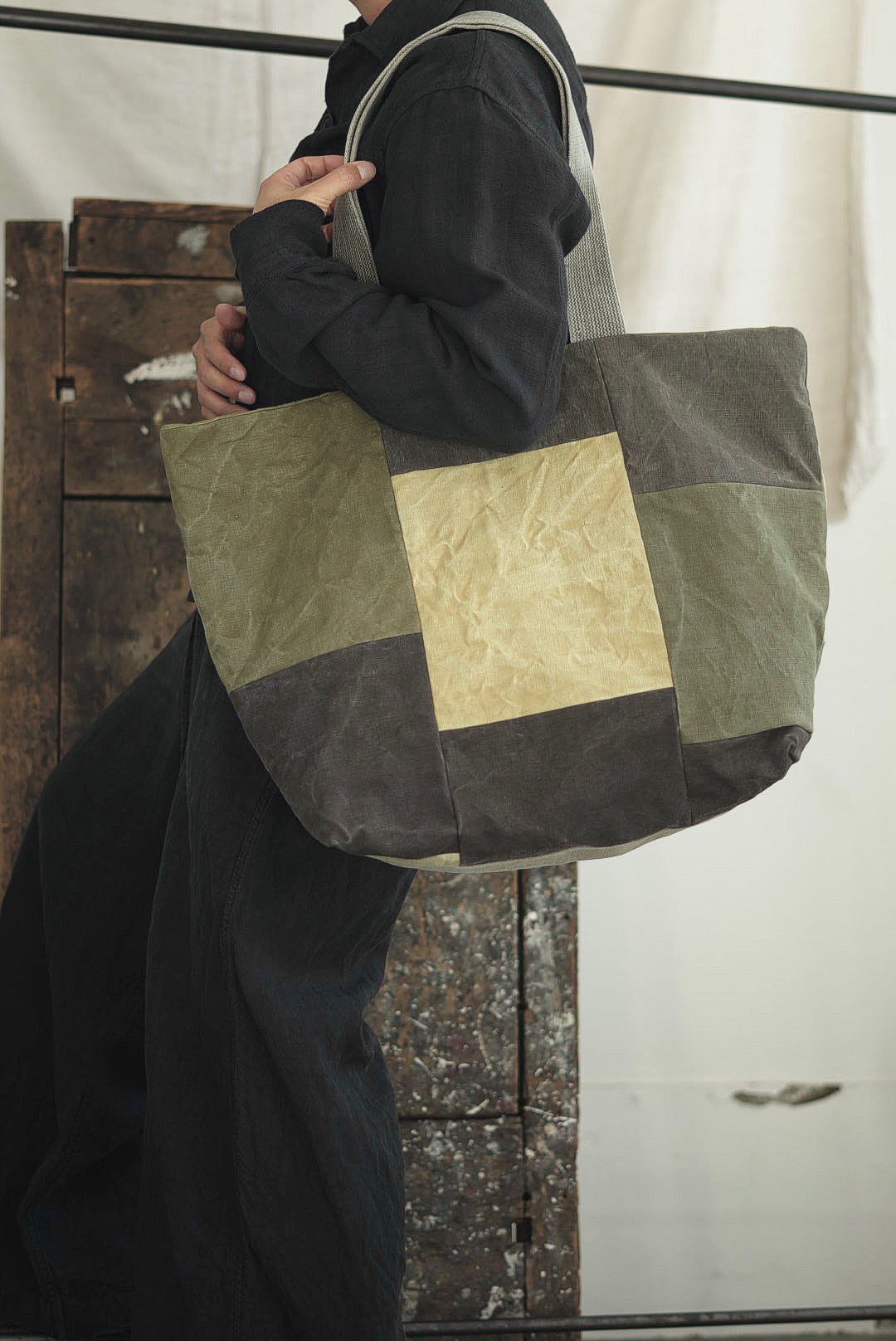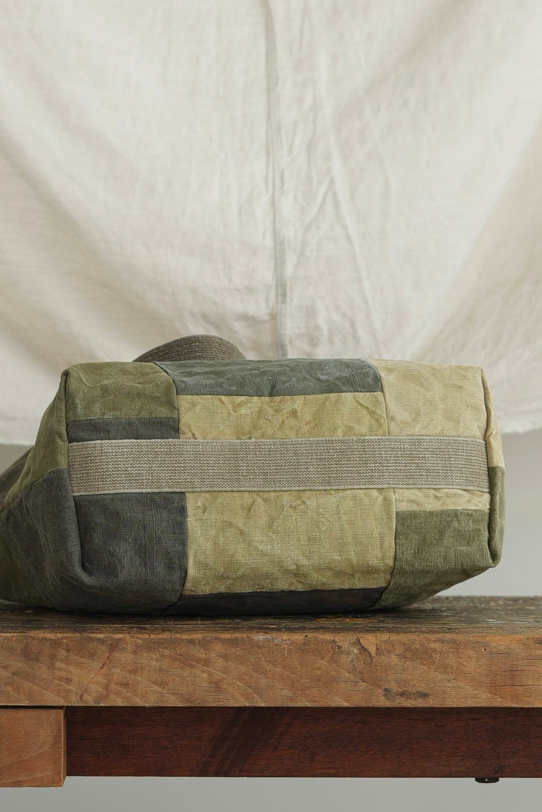 "VINCENT JALBERT"のパートナー、YVES ANDRIEUXの手掛けるアイテム。1950年代のフレンチミリタリーコットンバッグ(デッドストック)を解体し、キャンバスファブリックとして使用。以下、2つの異なる工程を経たファブリックを用いて製作。「解体・ウォッシュ加工→自然な褪色を促したファブリック」/「解体・ウォッシュ・ダイ→褪色を促した後に再染色したファブリック」。これら4種類の異なるカラーパネルを15〜16面使用しパッチワークで繋ぎ合わせています。また、バッグを解体した際に出たストラップパーツをそのまま持ち手として利用。内側はフルライニング仕様で実用的なパッチポケットが2口備わります。