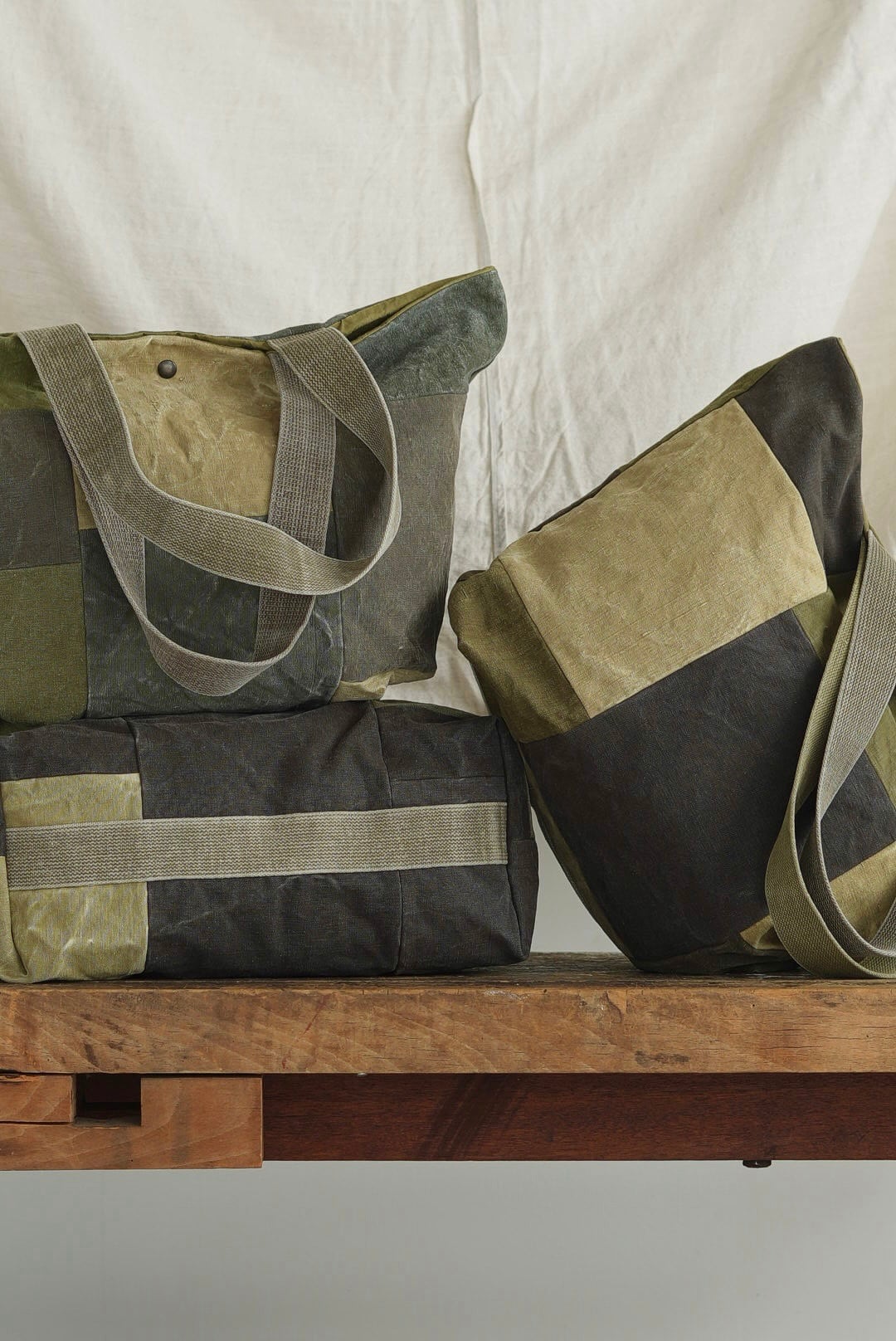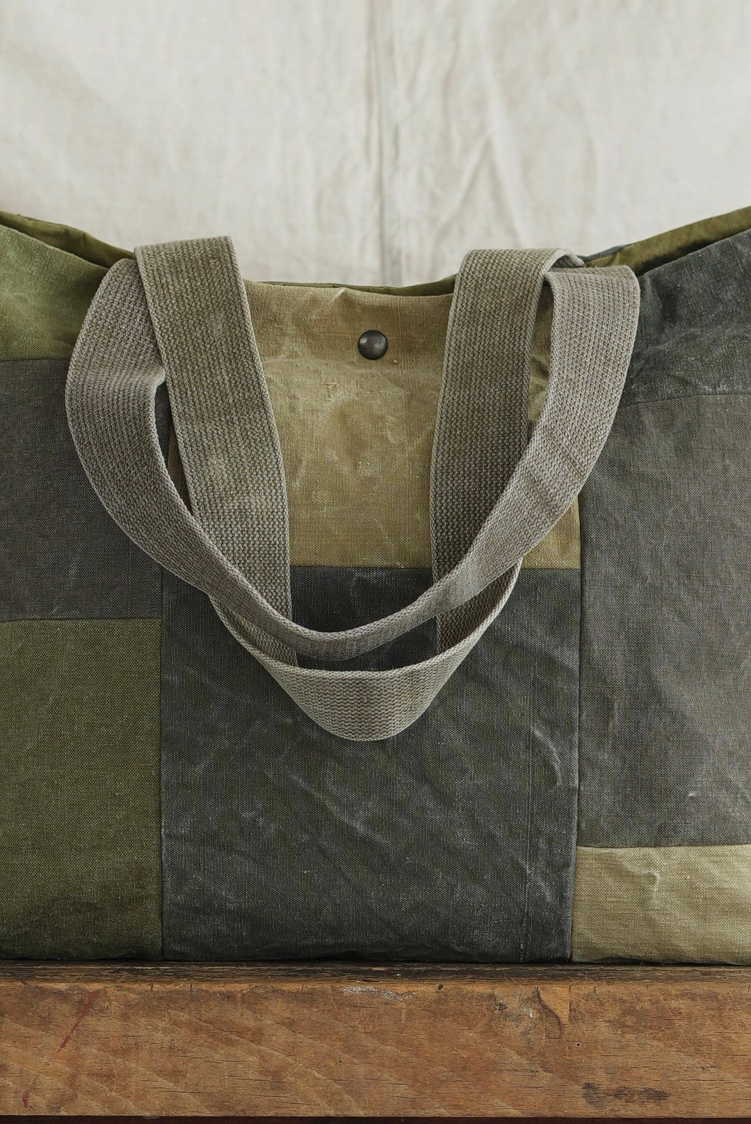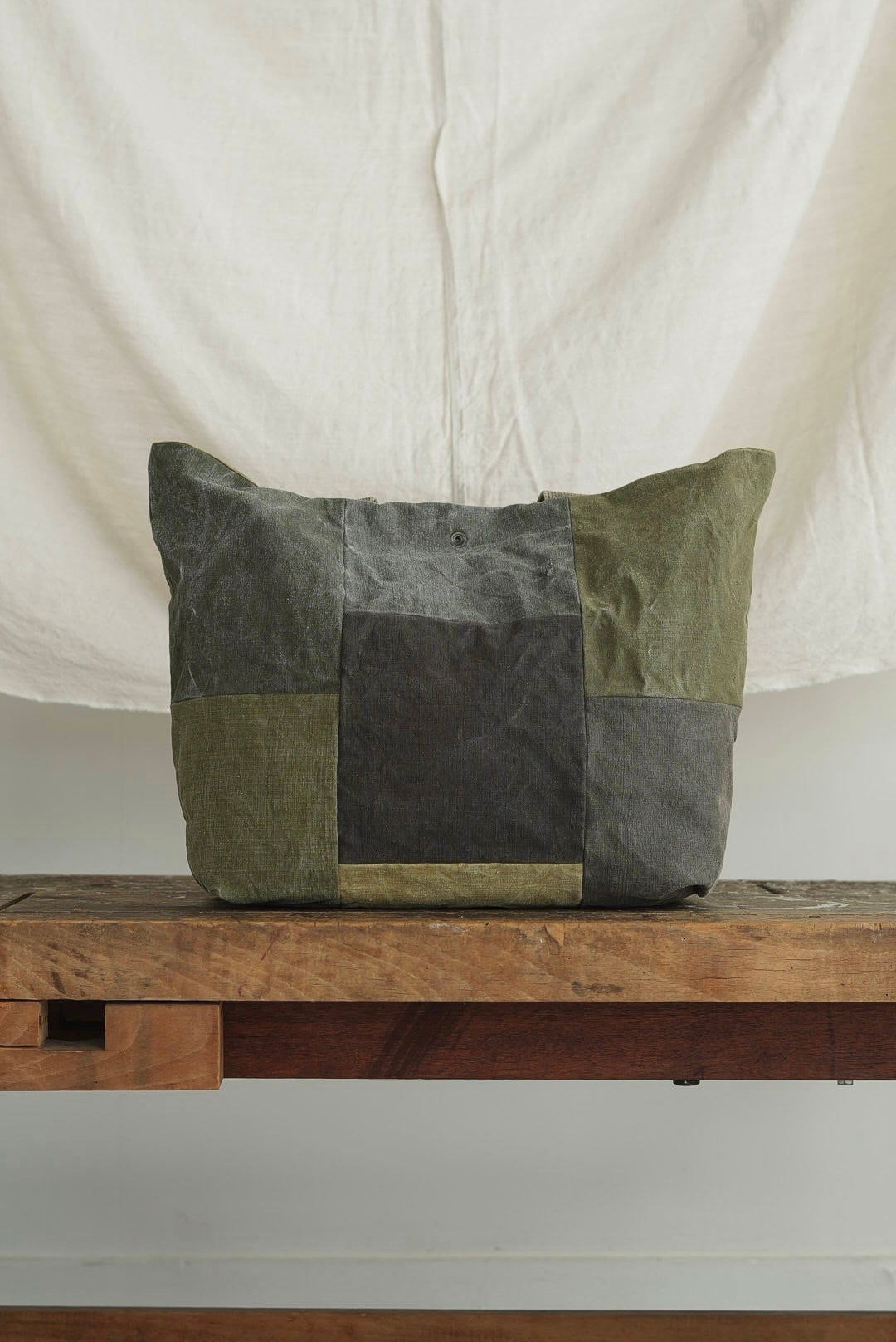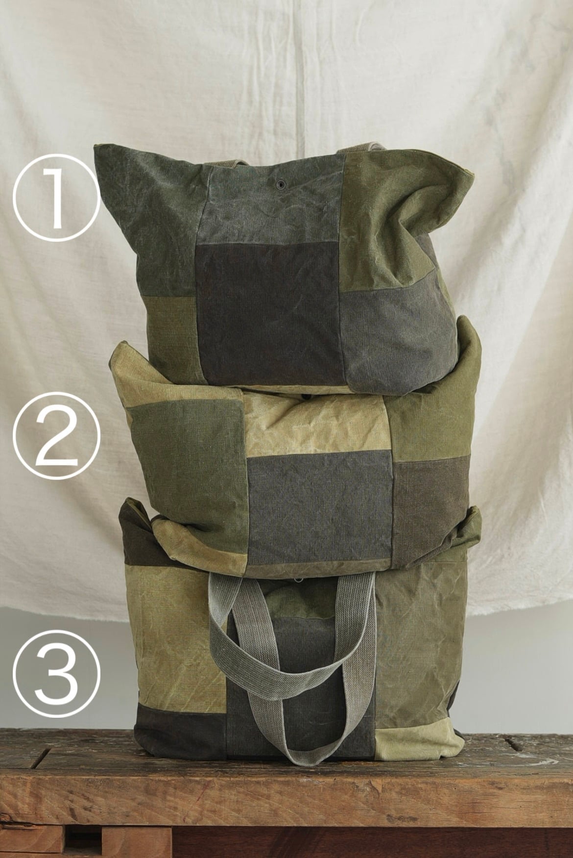 "VINCENT JALBERT"のパートナー、YVES ANDRIEUXの手掛けるアイテム。1950年代のフレンチミリタリーコットンバッグ(デッドストック)を解体し、キャンバスファブリックとして使用。以下、2つの異なる工程を経たファブリックを用いて製作。「解体・ウォッシュ加工→自然な褪色を促したファブリック」/「解体・ウォッシュ・ダイ→褪色を促した後に再染色したファブリック」。これら4種類の異なるカラーパネルを15〜16面使用しパッチワークで繋ぎ合わせています。また、バッグを解体した際に出たストラップパーツをそのまま持ち手として利用。内側はフルライニング仕様で実用的なパッチポケットが2口備わります。