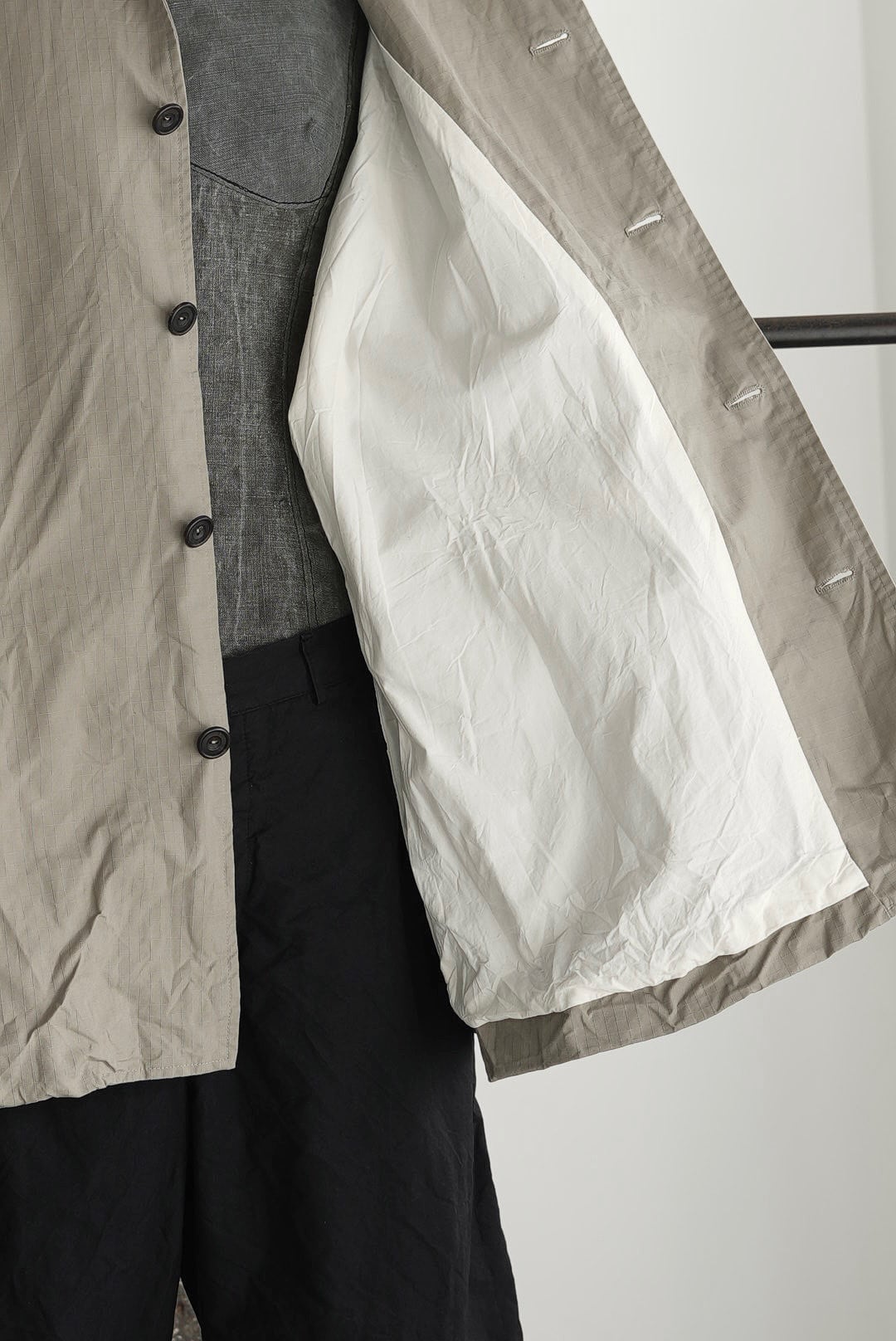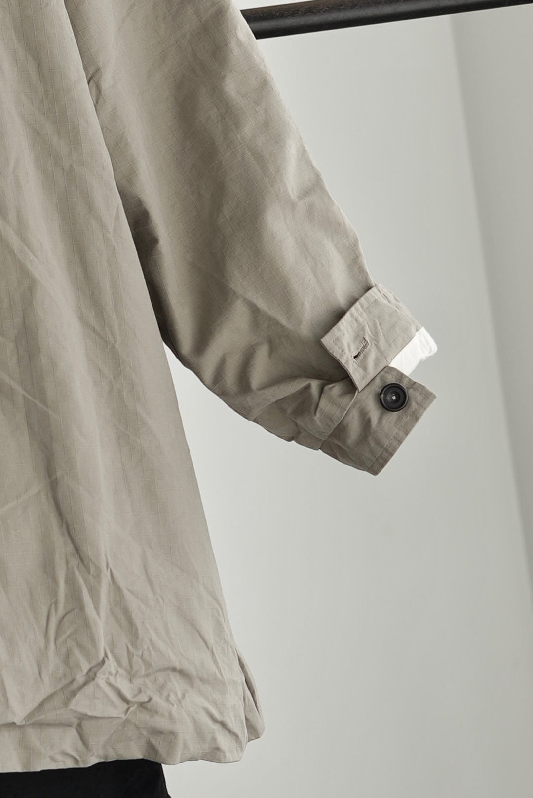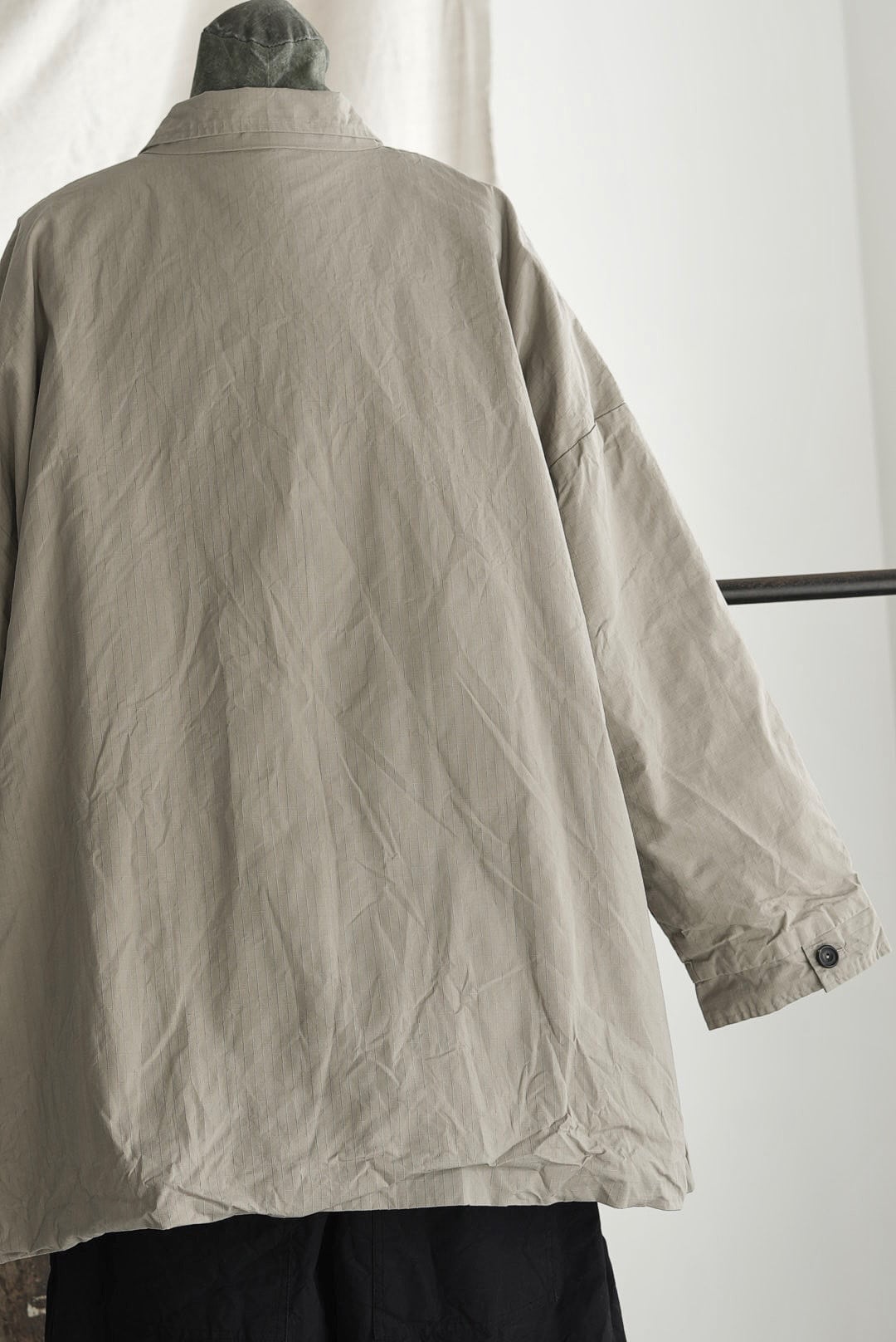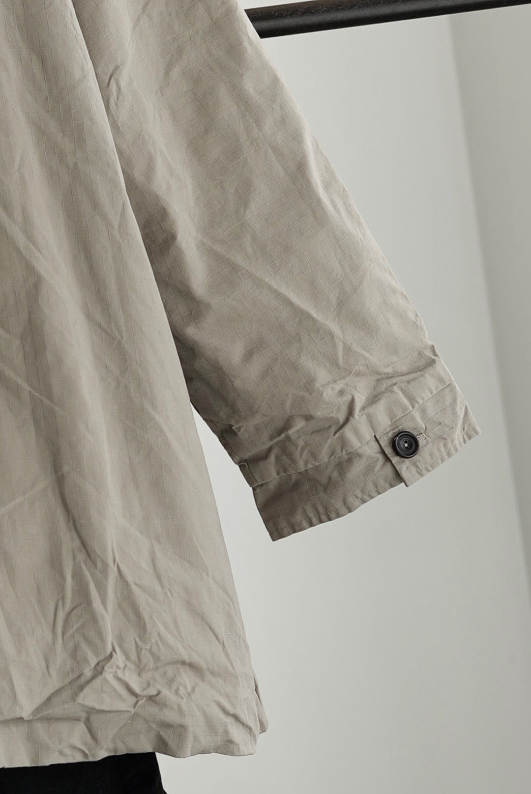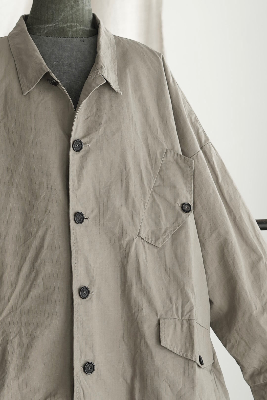 ブリティッシュミリタリーテイストのカバーオールジャケット。耐水性や防風性がありながらも、ベタついた感触のすくない仕上がりの「リップストップワックスドコットン」を使用。高強度の生地は着込むほどに身体に馴染み、柔らかく、そして味のある風合いへと変化する長く愛用が可能なファブリックです。経年変化へのエントリーとして、製品として仕上げたのちにハードに洗いがかけられており、程よくワックスが抜けることで、光沢と掠れがシワ感と共にないまぜに。袖通しや保温性を考慮した打ち込みの良いコットンファブリックをフルライニング。長い時期を通して着用ができるデイリーなアイテムです。馴染みの良い肉厚なナチュラルホーンボタン、手間暇をかけ作り手の愛着がのった手縫いのボタンホールディテール。