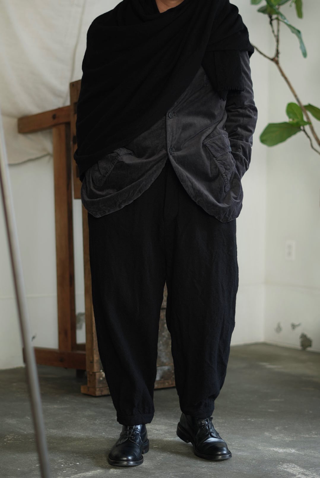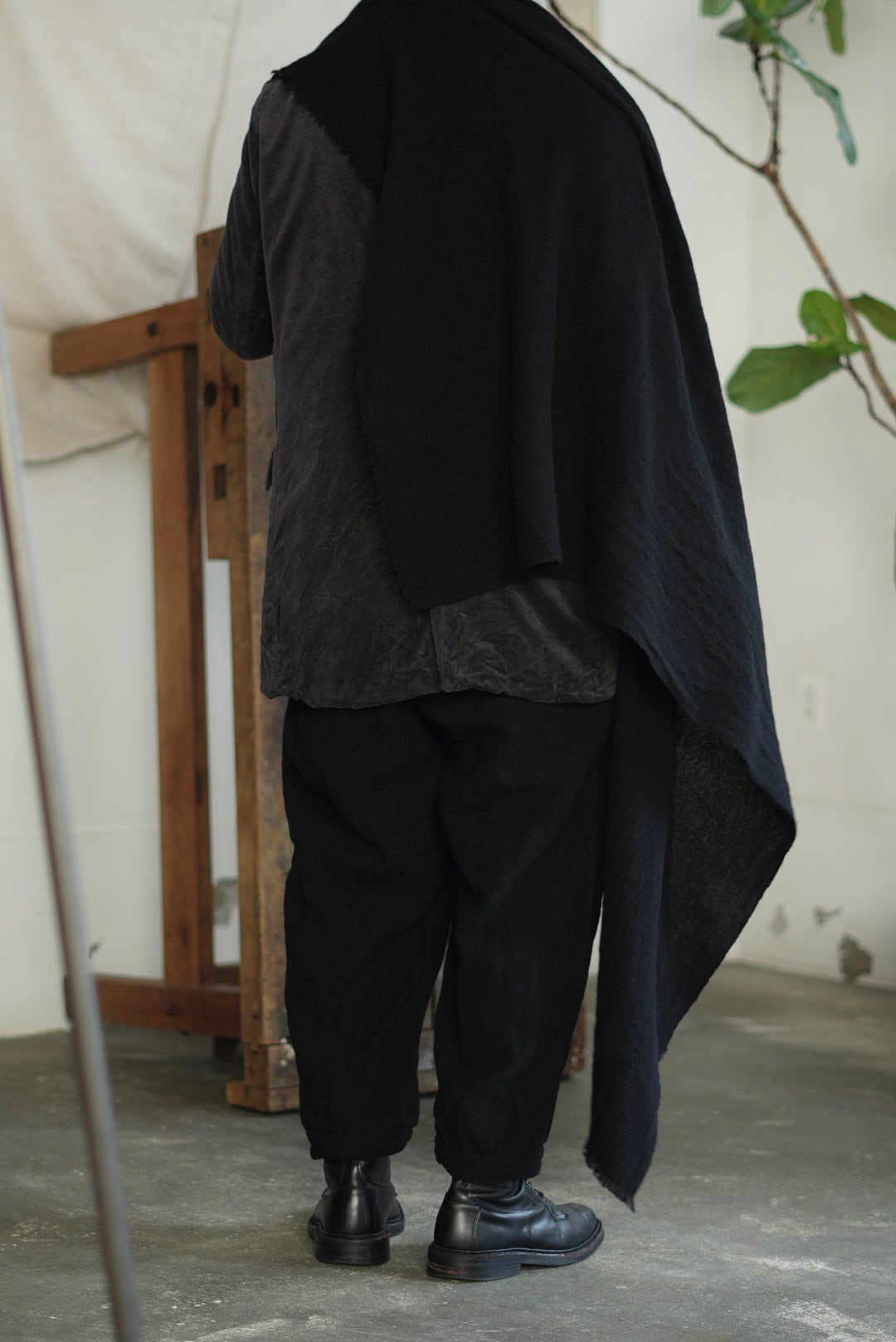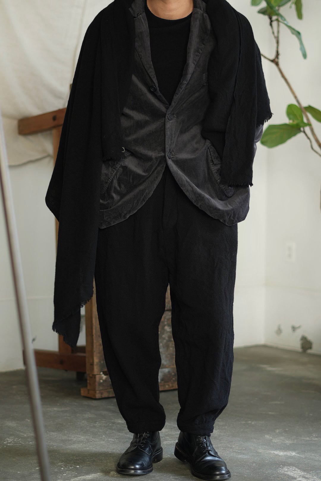 モンゴル産ウールを原料に、RICORRROBEのオリジナルパターンにてモンゴルで織り上げたファブリックを使用した大判のスクエアスカーフ。元はチェック柄を擁する生地を、贅沢にも製品染めにてダークトーンカラーに染色。織チェック生地ならでは、凹凸を持つ特有のテクスチャーが、モノトーンの製品に表情を与えています。巻いても垂らしても覆うことも。