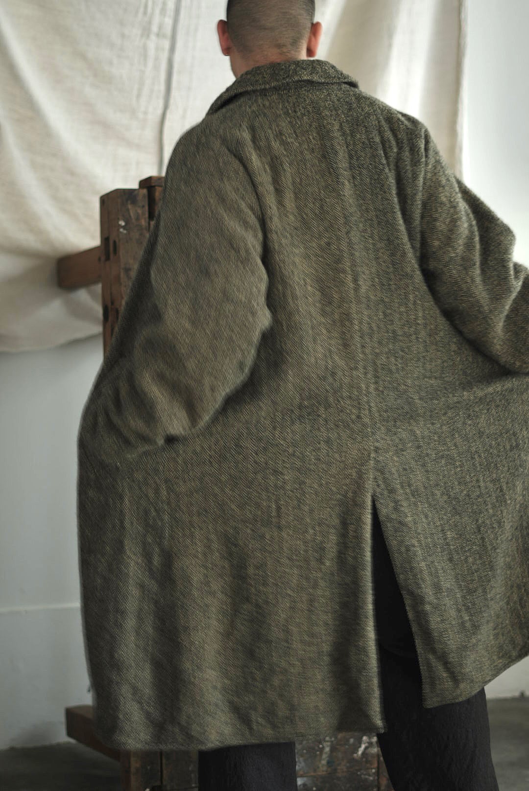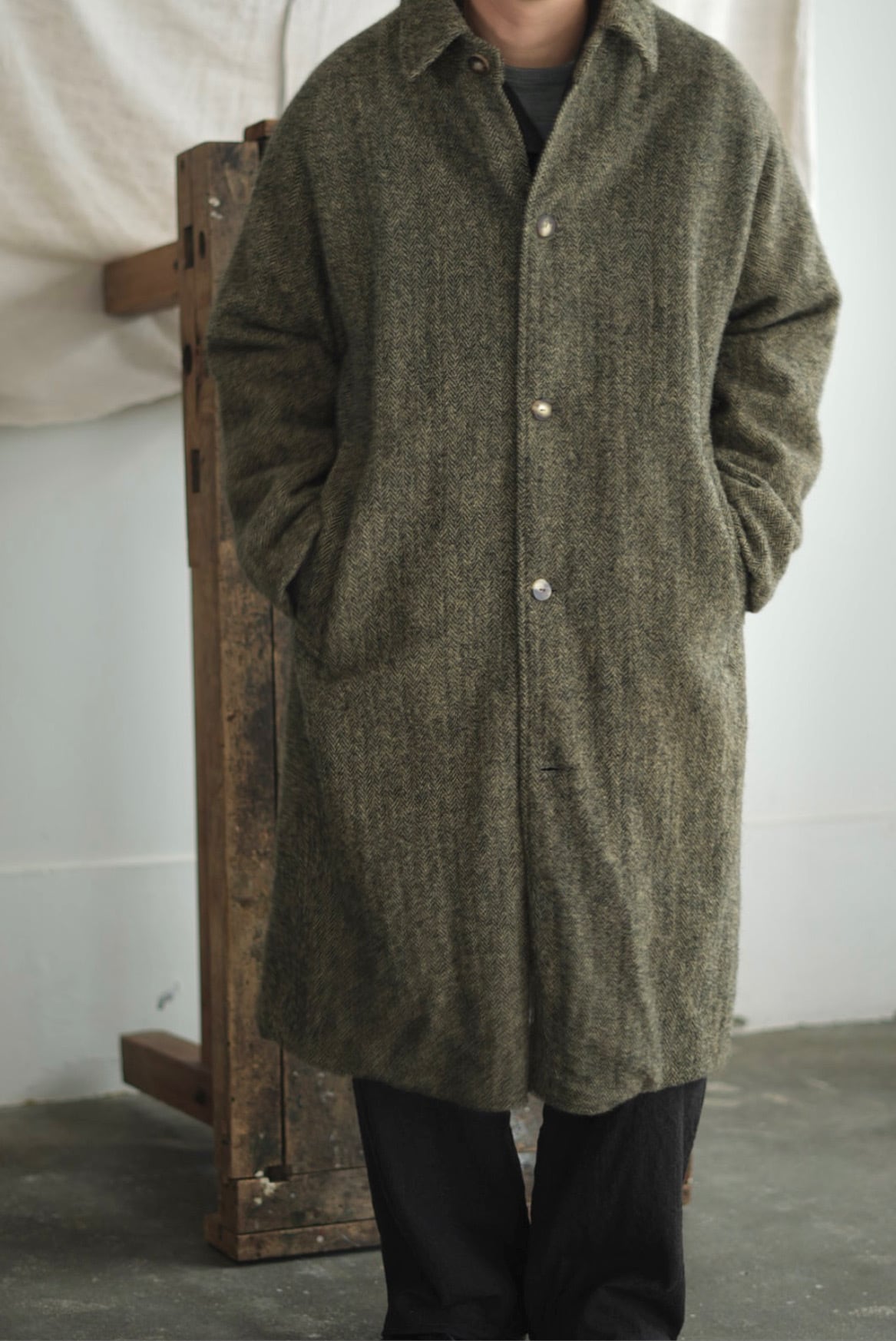 1840年よりスコットランドのヘブリディーズ諸島にて継承される技法を用い、およそ3カ月をかけて手織りで仕上げる、100% PURE NEW WOOLマテリアルの「HARRIS TWEED」を使用した、「Chez VIDALENC」のシグネチャーアイテム、ラグランスリーブの「ボビコート」。グレー&ブラックベースのヘリンボーンファブリックを、イエロー&ブルーをミックスしたデザイナー独自の調合によって、製品染めを施した柔らかで深みのあるトーン。カラーネームは「フライデー」。名前の由来は、『この色を名付けた日が金曜日だったから』。。。デザイナーの人柄を感じます。高温度による染色に加え、その後の低温度でのハードウォッシュ加工によって、ふっくらとした起毛感に柔軟性と豊かな表情が宿ります。要所にさり気なく同色でおとす/\/\/ステッチはワークテイストを感じるアクセント。深くとったセンターベントの仕様により着用時に動きの中で軽やかさが演出されます。フロントはシンプルなデザイン性の品良いホーンボタン留め。襟に付属したボタンを留めスタンドカラーとしてもスタイリングが可能です。袖通りの良いコットンサテンがフルライニングされており、快適な着用感と保温力を高めています。内側に2箇所パッチポケットが備わっています。