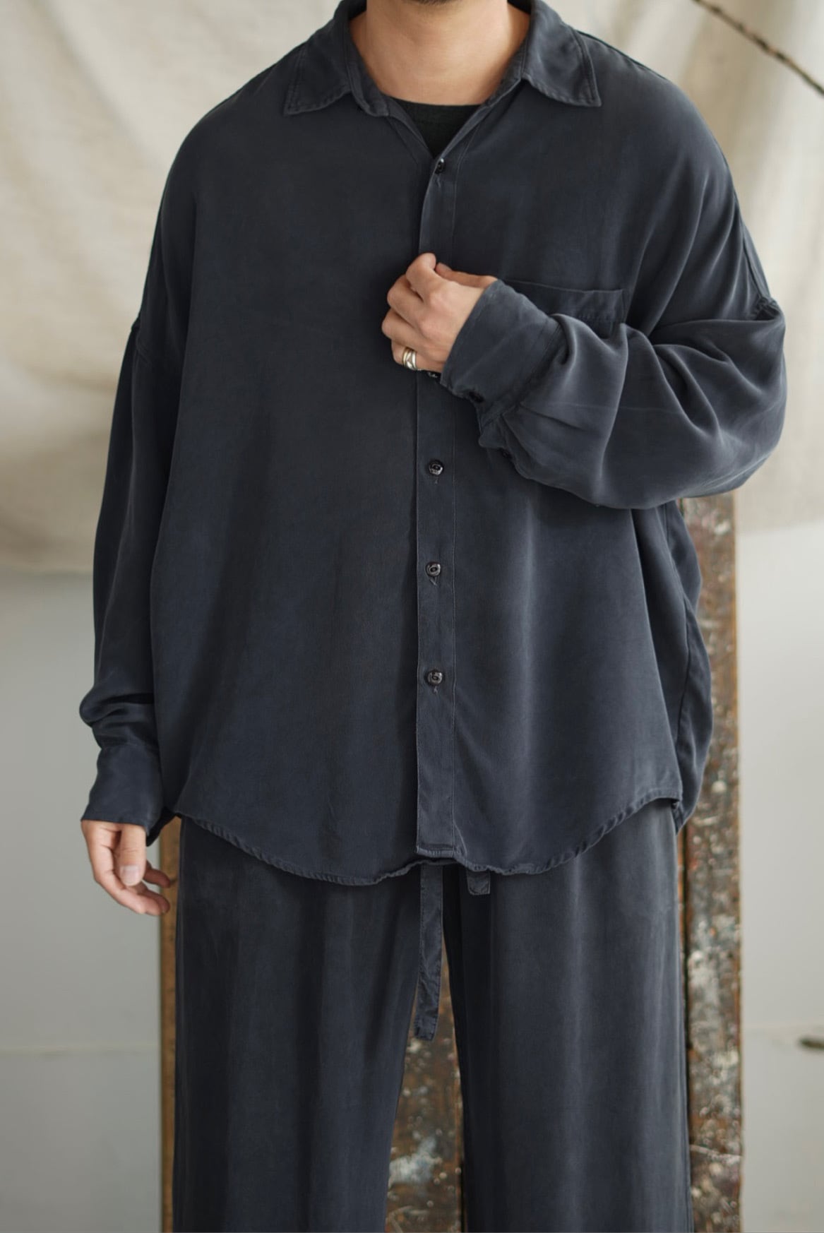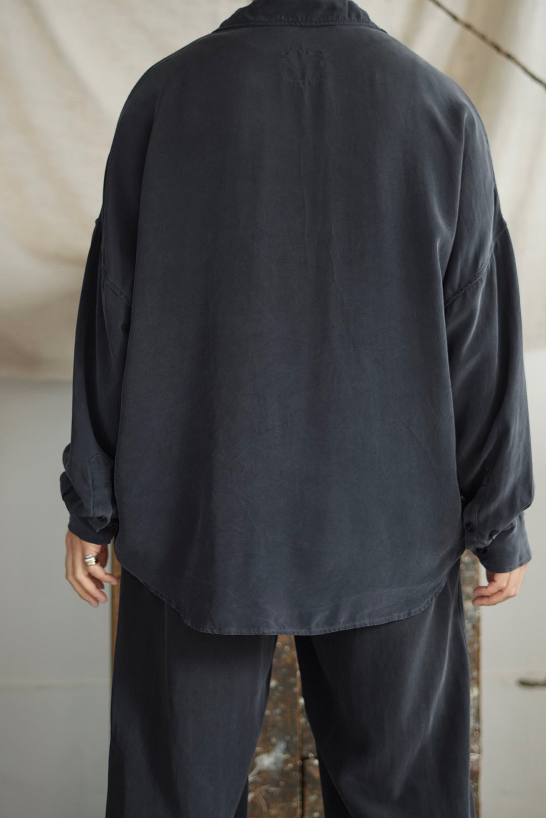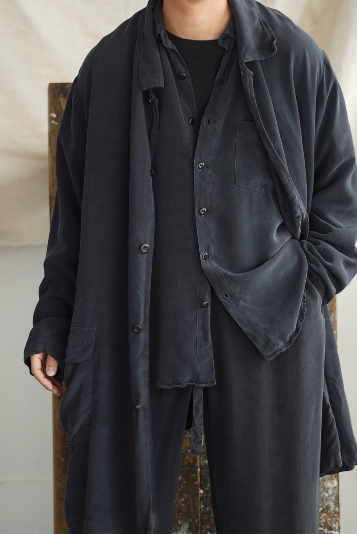 「Chez VIDALENC」のシグネチャーアイテムのひとつ。ドレープを生み出すワイドシルエットの「SHIRT AXL」。シャツに落ち感を経た上での靡きを求めて「SILK CDC」を採用。程よく厚手でシワになりにくく、滑らかな極上の肌当たりとシボのある表情豊かなシルクファブリックは「クレープデシン」と呼ばれ、60年程前からクチュールデザイナーやレッドカーペットのセレブリティに愛用される歴史のある生地です。魅力に富むテクスチャーをダイレクトに感じてもらえるアンライニング仕様。男臭くも色気のある雰囲気を醸し出す、フェード気味のブラックカラー。ガーメントダイ(製品染)の工程において、ステッチが締まり縮絨しパッカリングが細部にあらわれることで、気取りのない印象が加わります。アンティークガラスボタンのディティールがリュクスな印象を際立てています。