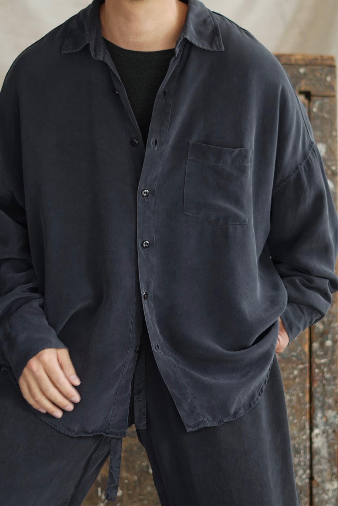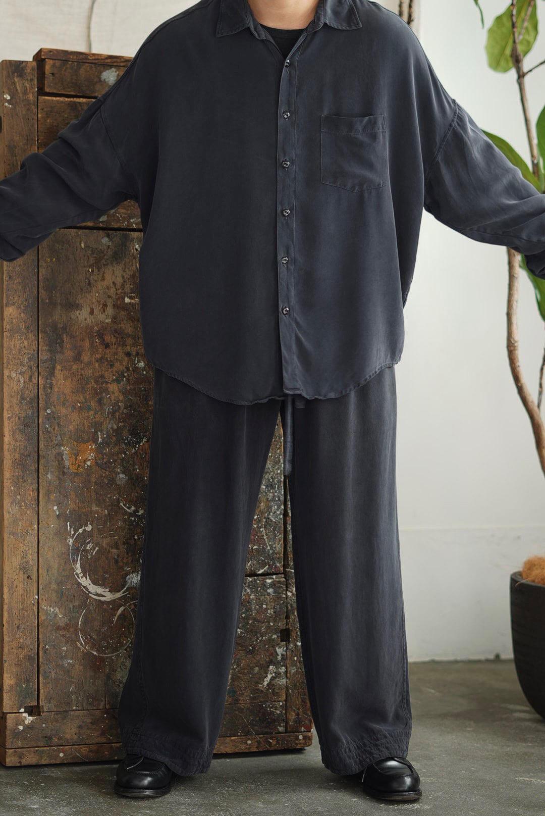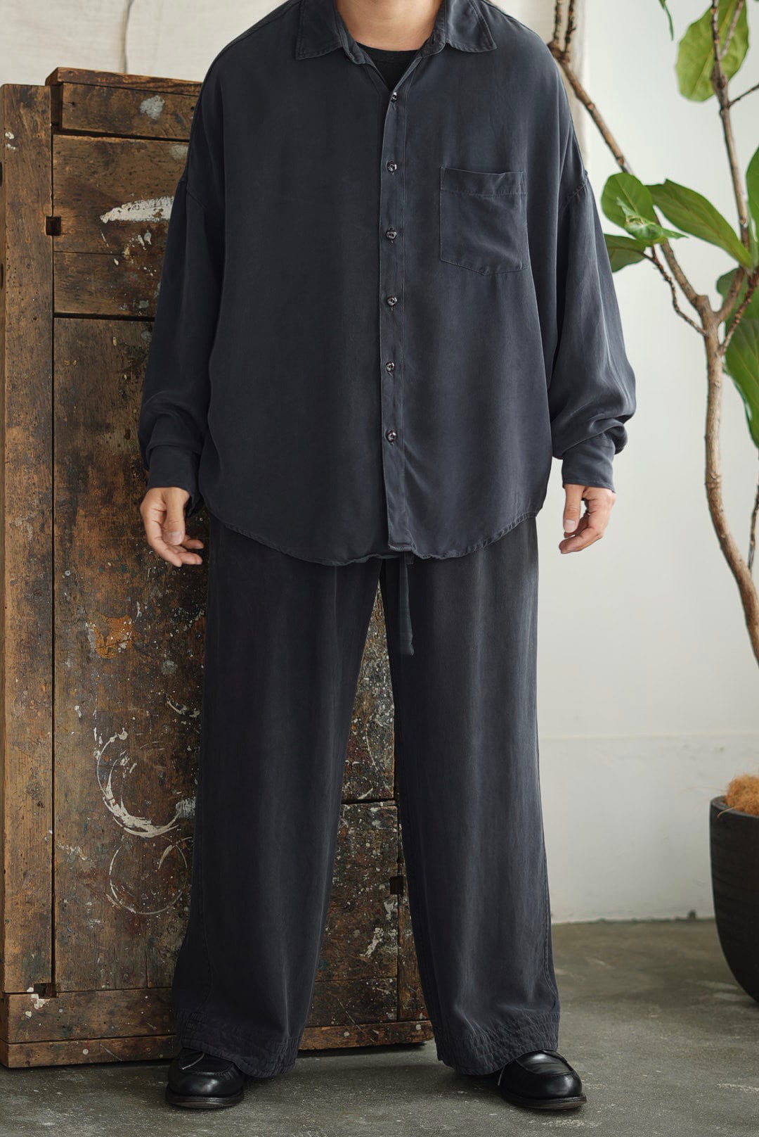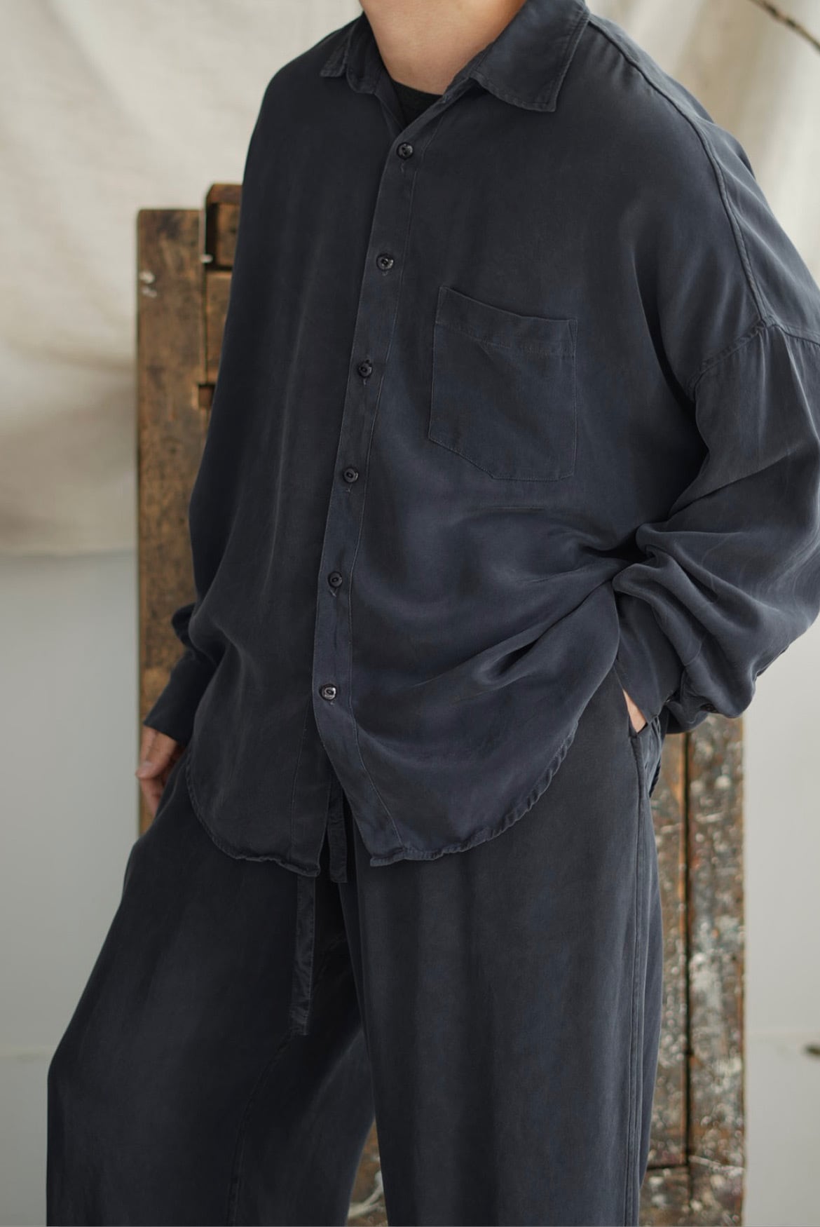 「Chez VIDALENC」のシグネチャーアイテムのひとつ。ドレープを生み出すワイドシルエットの「SHIRT AXL」。シャツに落ち感を経た上での靡きを求めて「SILK CDC」を採用。程よく厚手でシワになりにくく、滑らかな極上の肌当たりとシボのある表情豊かなシルクファブリックは「クレープデシン」と呼ばれ、60年程前からクチュールデザイナーやレッドカーペットのセレブリティに愛用される歴史のある生地です。魅力に富むテクスチャーをダイレクトに感じてもらえるアンライニング仕様。男臭くも色気のある雰囲気を醸し出す、フェード気味のブラックカラー。ガーメントダイ(製品染)の工程において、ステッチが締まり縮絨しパッカリングが細部にあらわれることで、気取りのない印象が加わります。アンティークガラスボタンのディティールがリュクスな印象を際立てています。