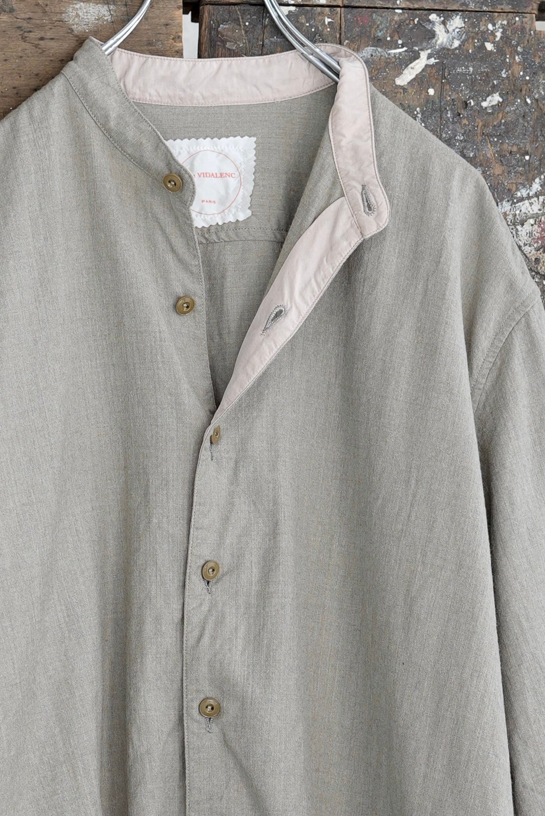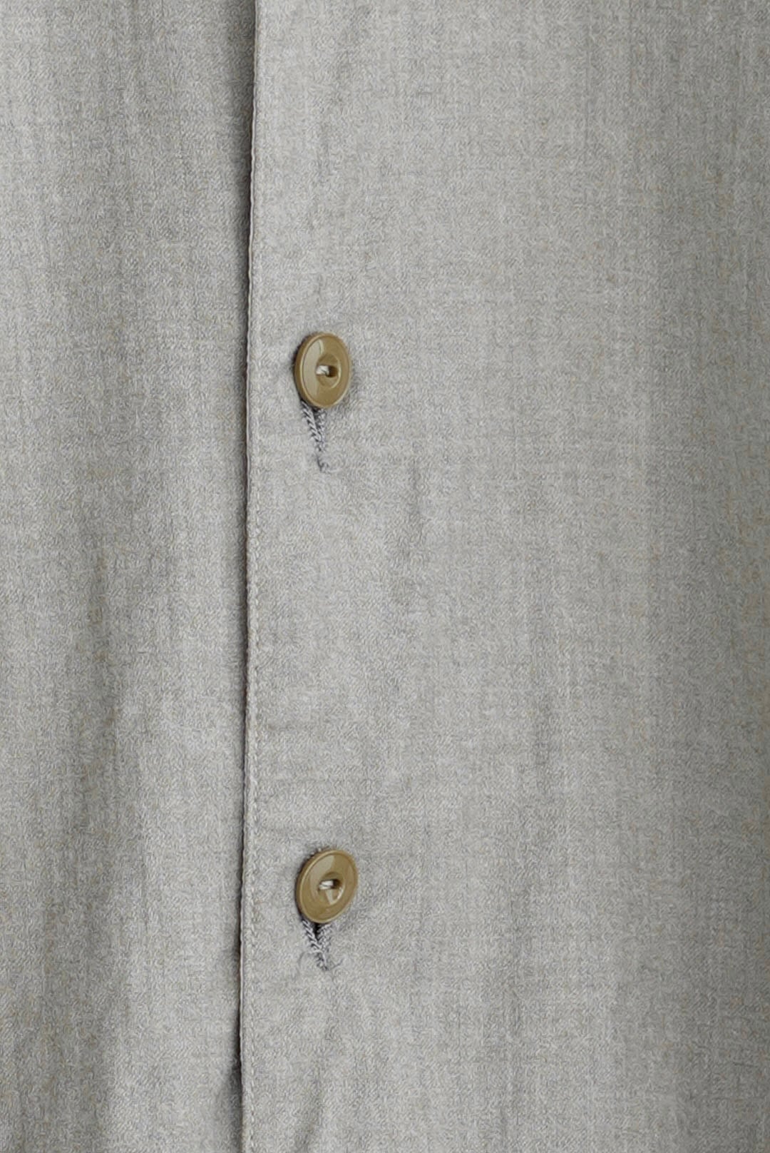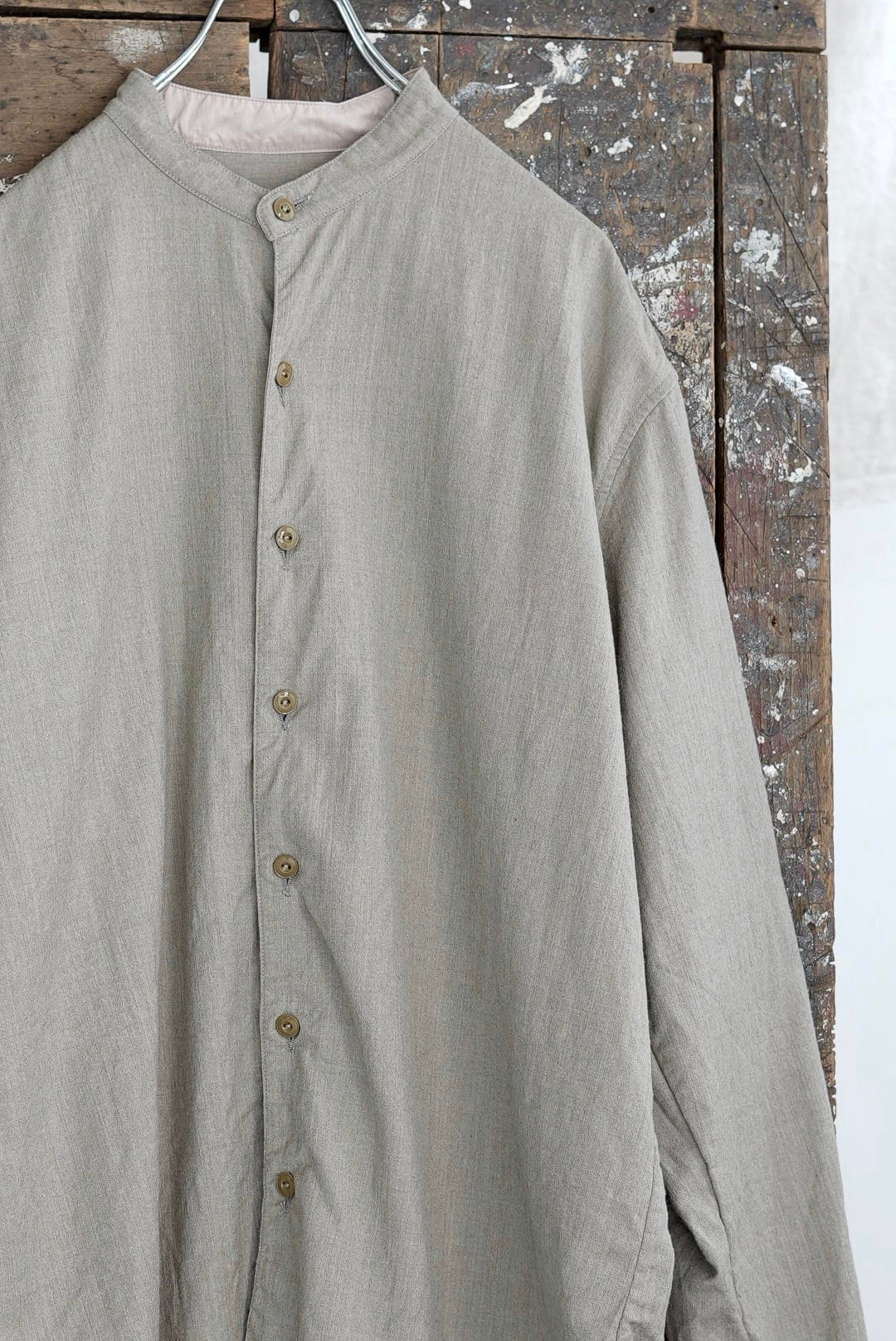 ワークスタイルをベースにしながらも、ファブリック使いでエレガントにデザインされたカラーレスシャツ。イタリア製の柔らかくしなやかなウール生地をボイル(茹で)加工。高温の圧力により縮絨をすることで、わずかな凹凸とコシを生み出した表情深いウールファブリック。生地がドレープする程よいリラックスシルエットに背面のサイドプリーツは肩周りの可動域を広げる心地良い着用感です。オリーブカラー、色気のあるアンティークガラスボタン。裏前立て・ネック・カフスの裏張りには、シャンパンカラーにて染められた、シルクファブリックのサプライズアクセントがつきます。袖口はロールアップ可能な2ボタン仕様。