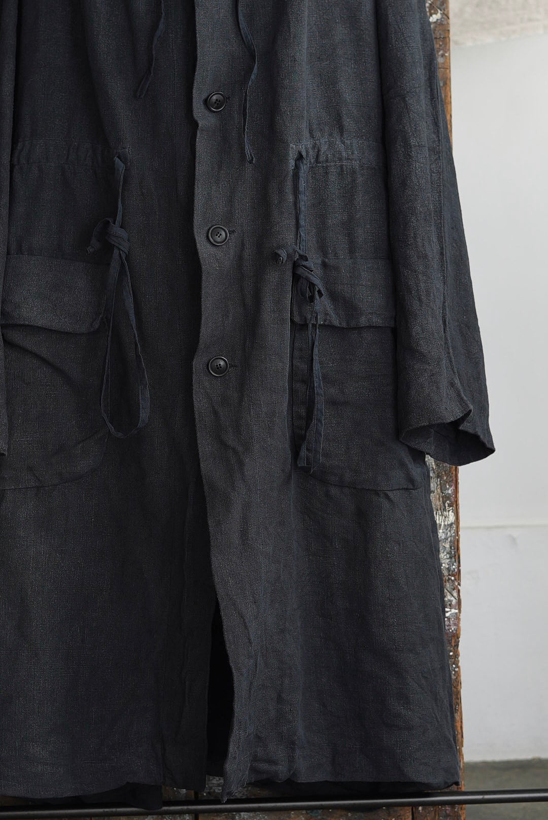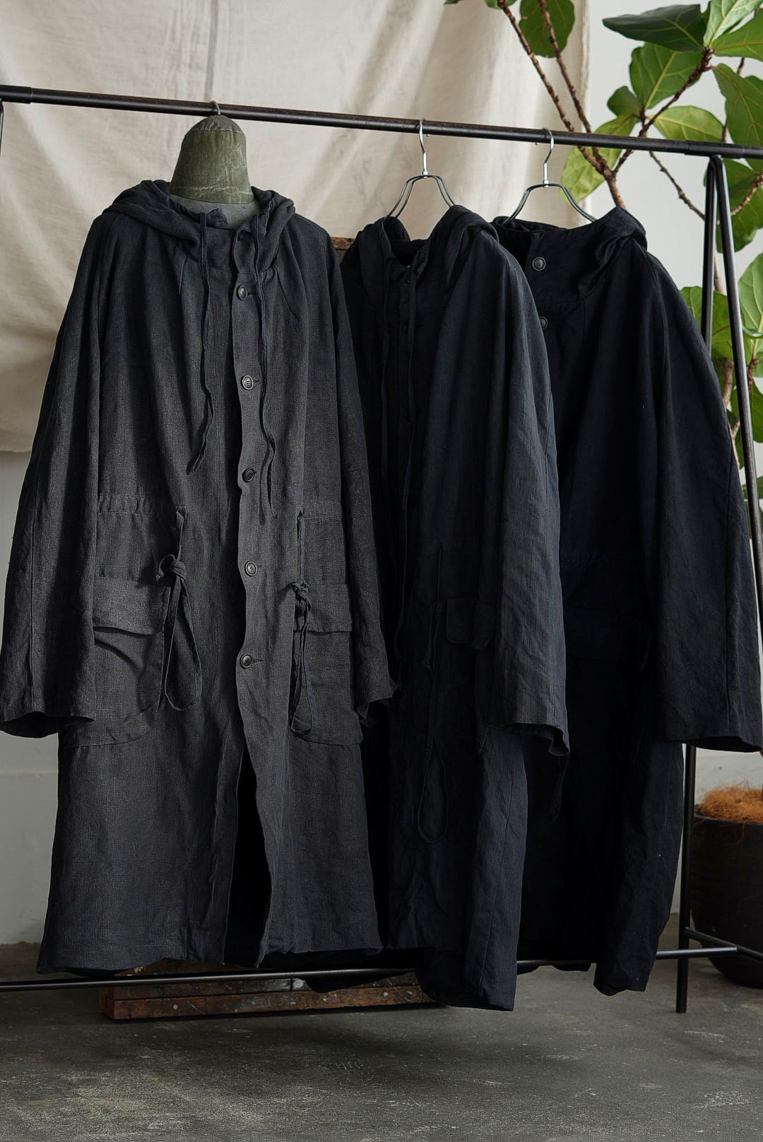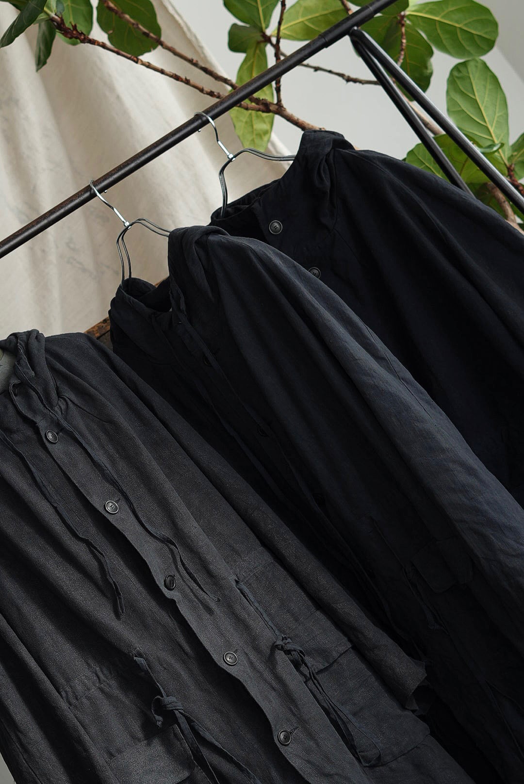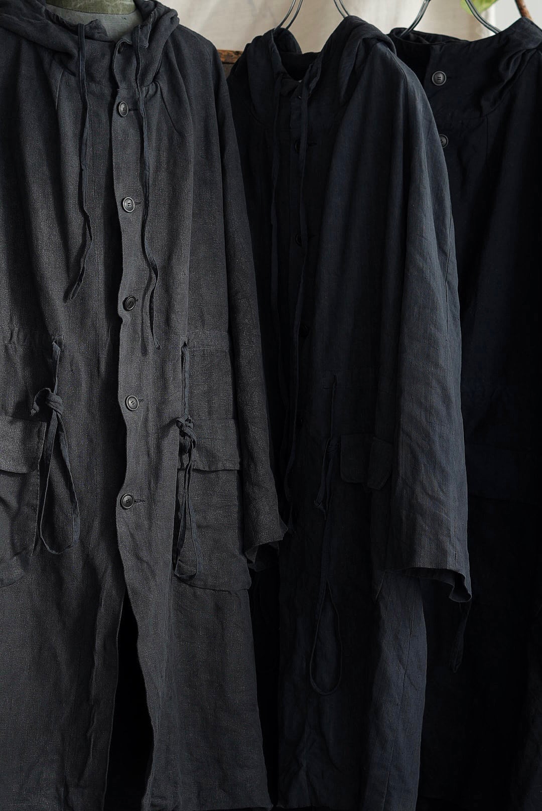 「VINCENT JALBERT」のシグネットファブリック、ヴィンテージフレンチリネン(1900年代初頭)を使用した、フレンチミリタリーをデザインソースとするオーバーパーカ。「Brownie」のエクスクルーシブモデルです。着馴染みの良いラグランスリーブ。立体的に構築されたビックフーディー。風の侵入を防ぐハイネックのフロントデザイン。ウエストとフーディーにドローコードが付属、シルエットのアレンジが可能です。アウトファブリックには迫力のあるヘビーリネンを使用。現行の統制された工業生地には見受けられない、当時のホームスパンならではのネップやスラブ、粗野な雰囲気が自然な表情として製品に存在感をもたらしています。それぞれに個性があり、ひとつとして同じ物はありません。着用を重ねることで、ソフトな風合いを増してゆき、身体に馴染み寄り添い、時を経て各々のヴィンテージとなっていく存在です。ガーメントダイ(製品染)による染色工程を経たカラーは、使用されるファブリックの特性に応じ、繊維への浸透具合が異なることで生まれたワンアンドオンリーブラック。ライニングには肌あたりを考慮し、ファインなヴィンテージフレンチリネンを用いています。ヴィンテージボタンを使った抜かりのない細部のディティール。内側にワンポケット付き。