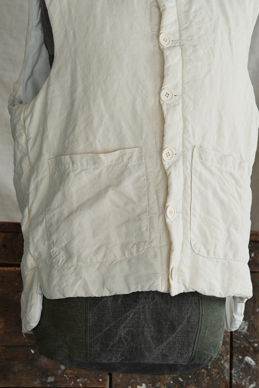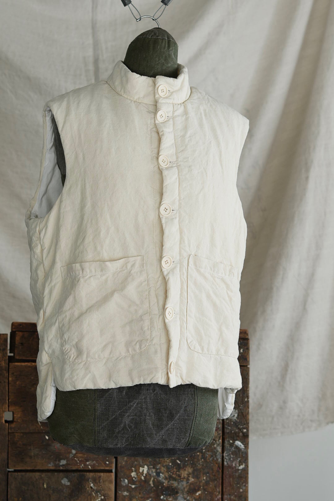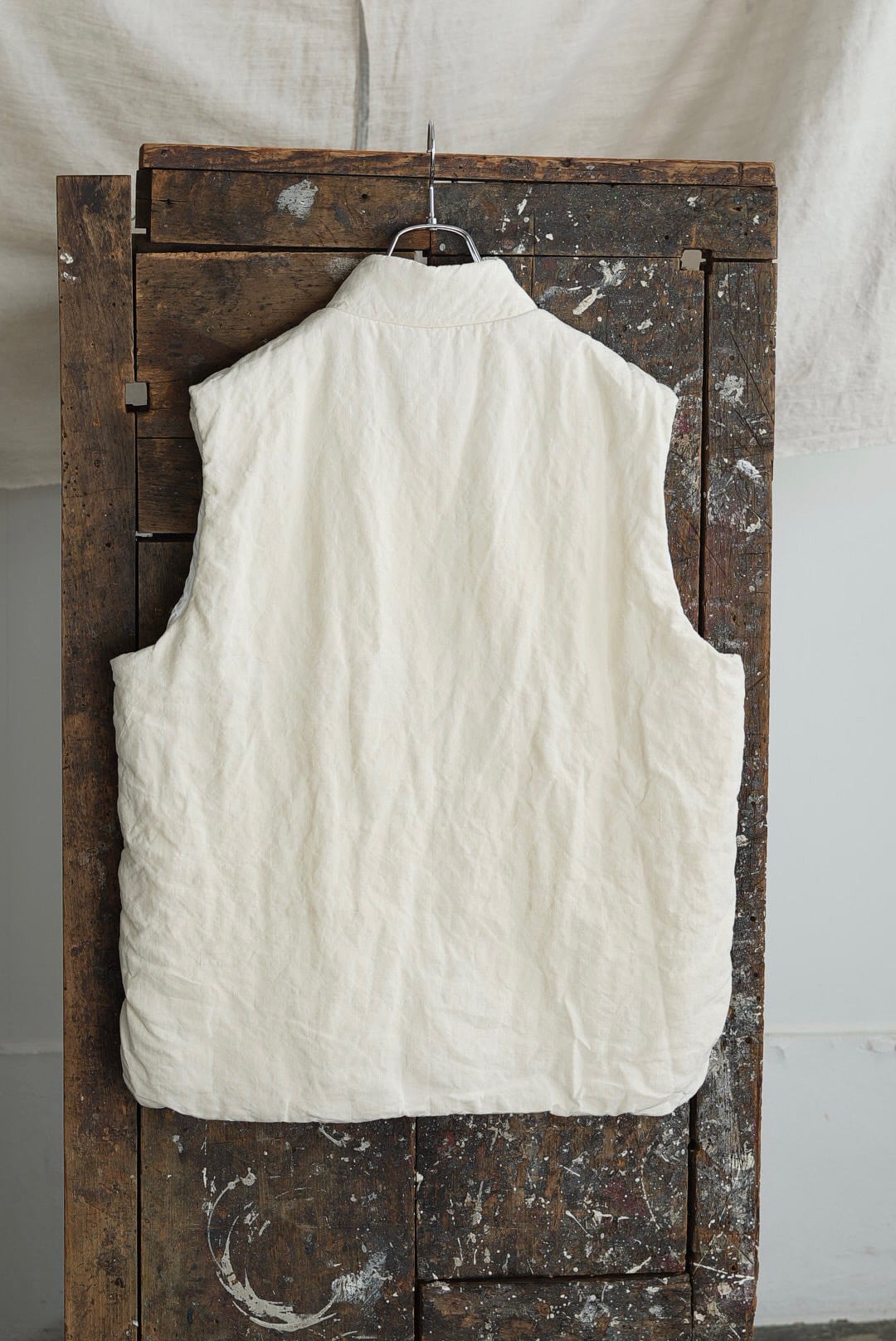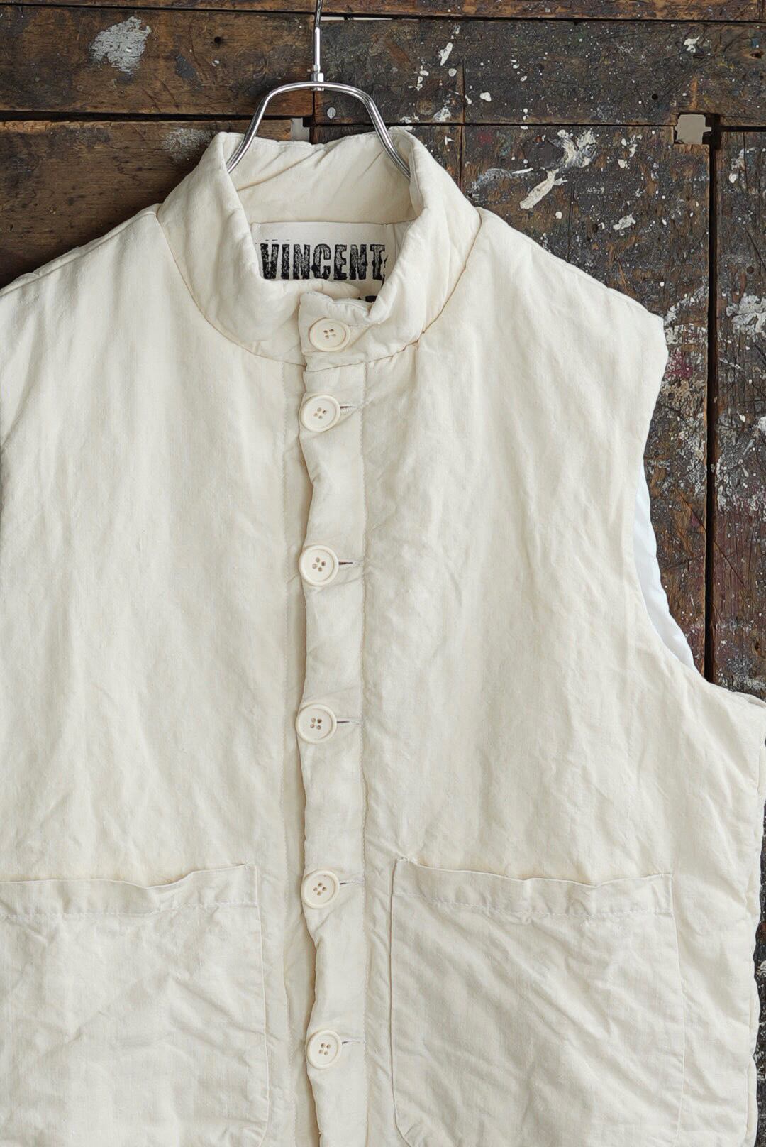 コンパクトなスタンドネックのアーマーベスト。ボタン留めのシックなデザイン。前後段違いのレングスはシャツ・スウェット・ニットはもちろん、ジャケットやアウターともグッドバランスのレイヤードに。ブランドのシグネットファブリック、ヴィンテージフレンチリネン(20世紀初頭)を表地に使用。古布ならではのネップやスラブが浮かび、現代の統制された生地にはない、魅力的な表情を纏います。未染色、ヴィンテージの表情をダイレクトに楽しめるナチュラルカラー。肌当たりを考慮し、きめ細やかなイタリアンコットンポプリンをライニング。ポリエステルの中綿を全体にパデットさせた、膨らみのあるパフィーシルエット。ソフトでライトな着心地に加え、空気を溜め込む性質を持つリネン繊維と相まって高い保温力も備わります。