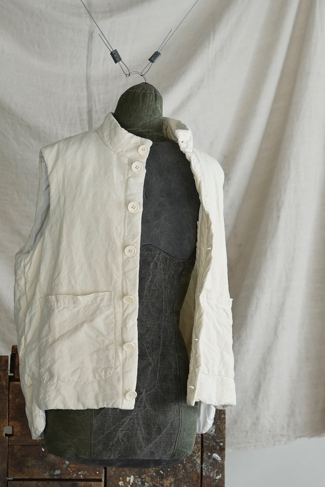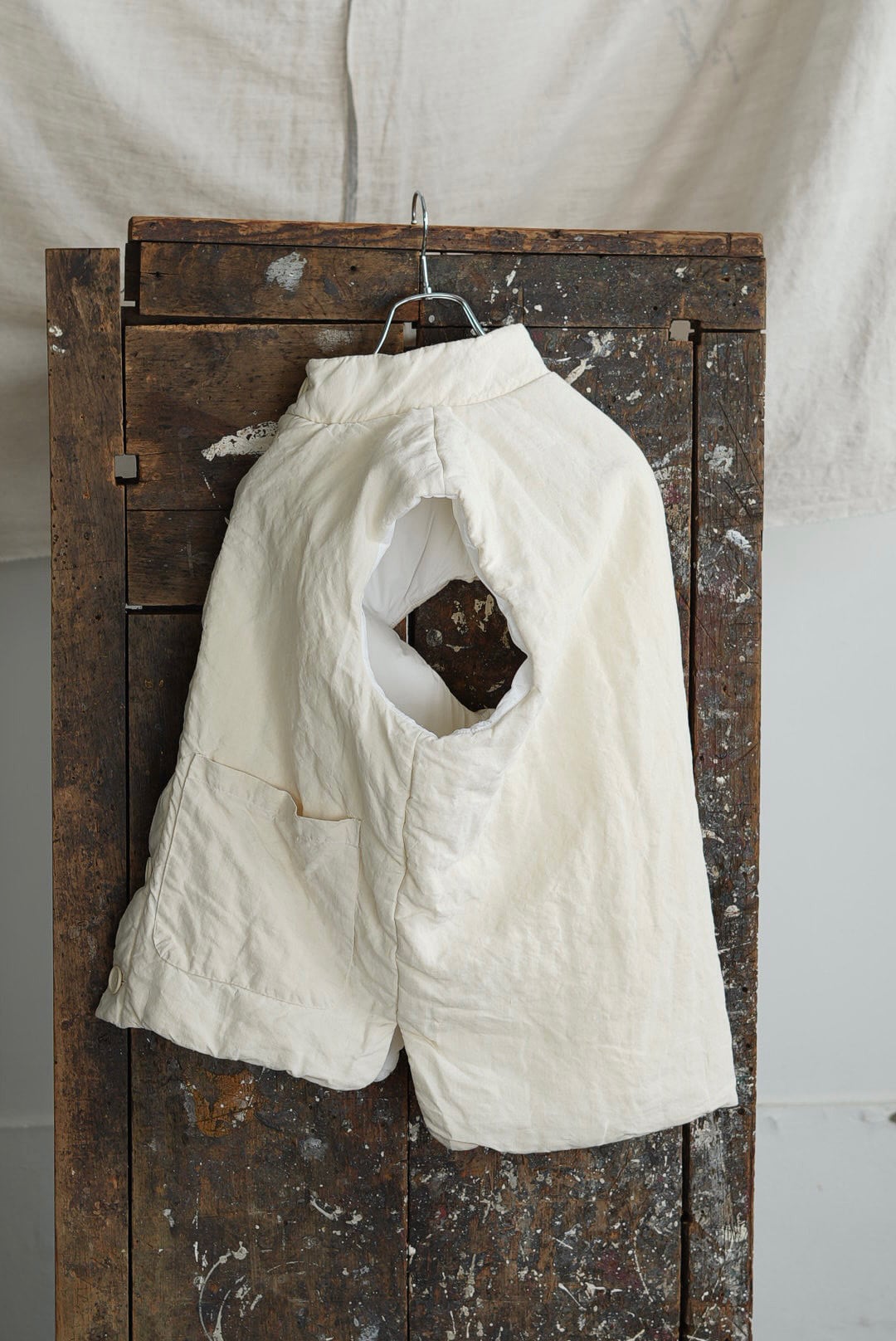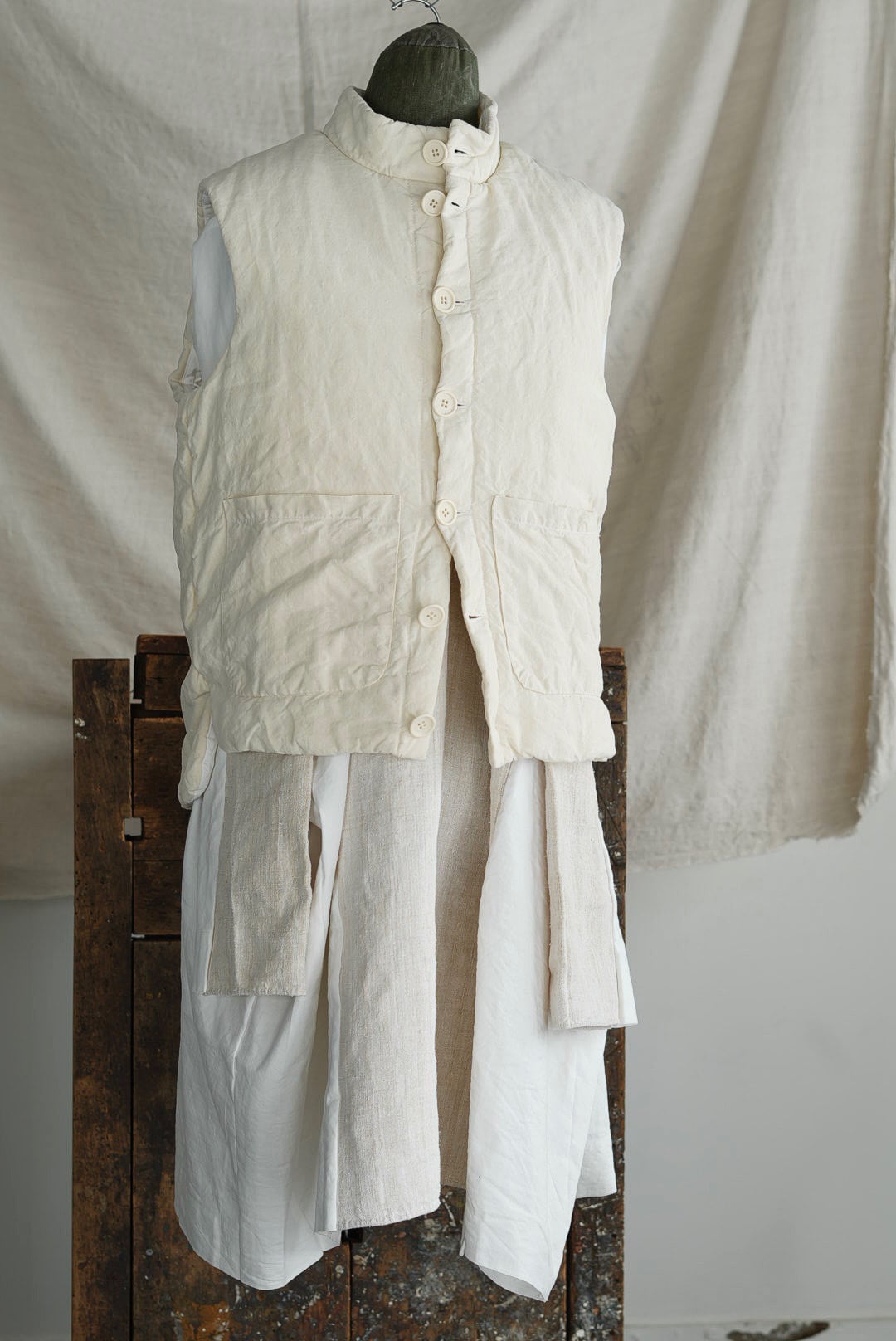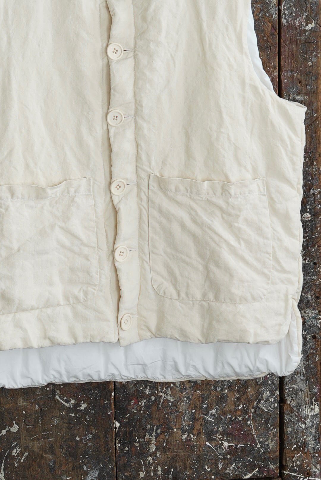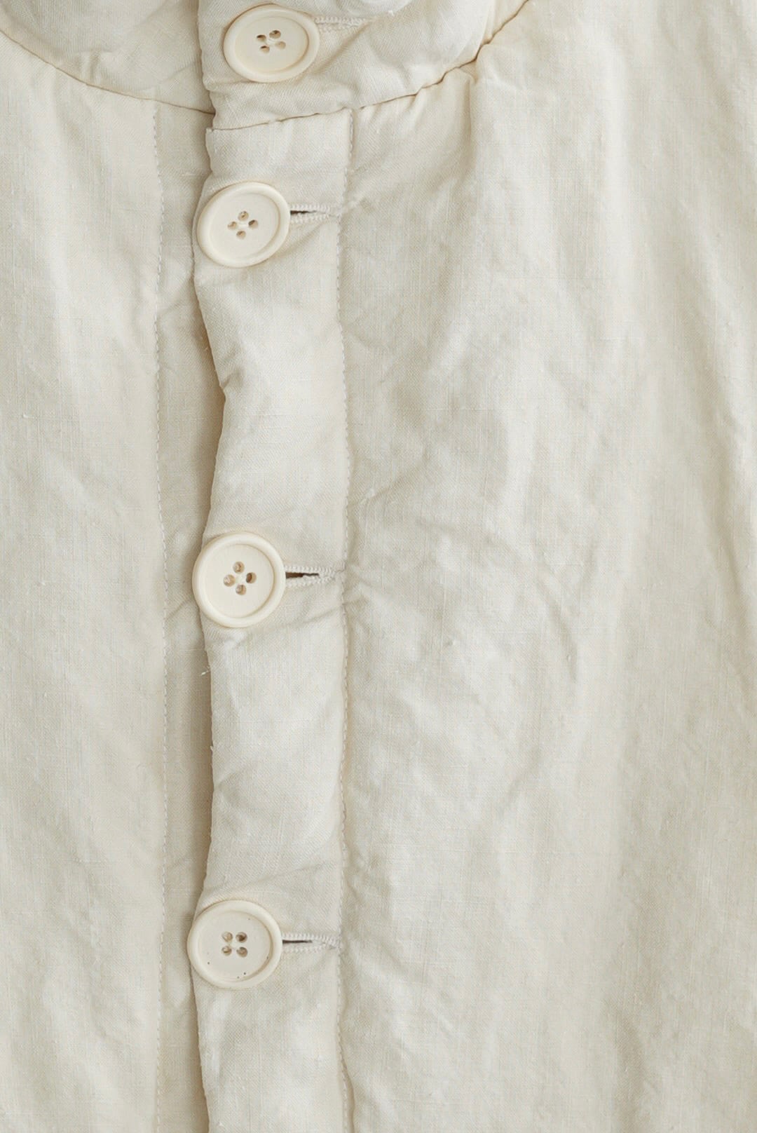 コンパクトなスタンドネックのアーマーベスト。ボタン留めのシックなデザイン。前後段違いのレングスはシャツ・スウェット・ニットはもちろん、ジャケットやアウターともグッドバランスのレイヤードに。ブランドのシグネットファブリック、ヴィンテージフレンチリネン(20世紀初頭)を表地に使用。古布ならではのネップやスラブが浮かび、現代の統制された生地にはない、魅力的な表情を纏います。未染色、ヴィンテージの表情をダイレクトに楽しめるナチュラルカラー。肌当たりを考慮し、きめ細やかなイタリアンコットンポプリンをライニング。ポリエステルの中綿を全体にパデットさせた、膨らみのあるパフィーシルエット。ソフトでライトな着心地に加え、空気を溜め込む性質を持つリネン繊維と相まって高い保温力も備わります。