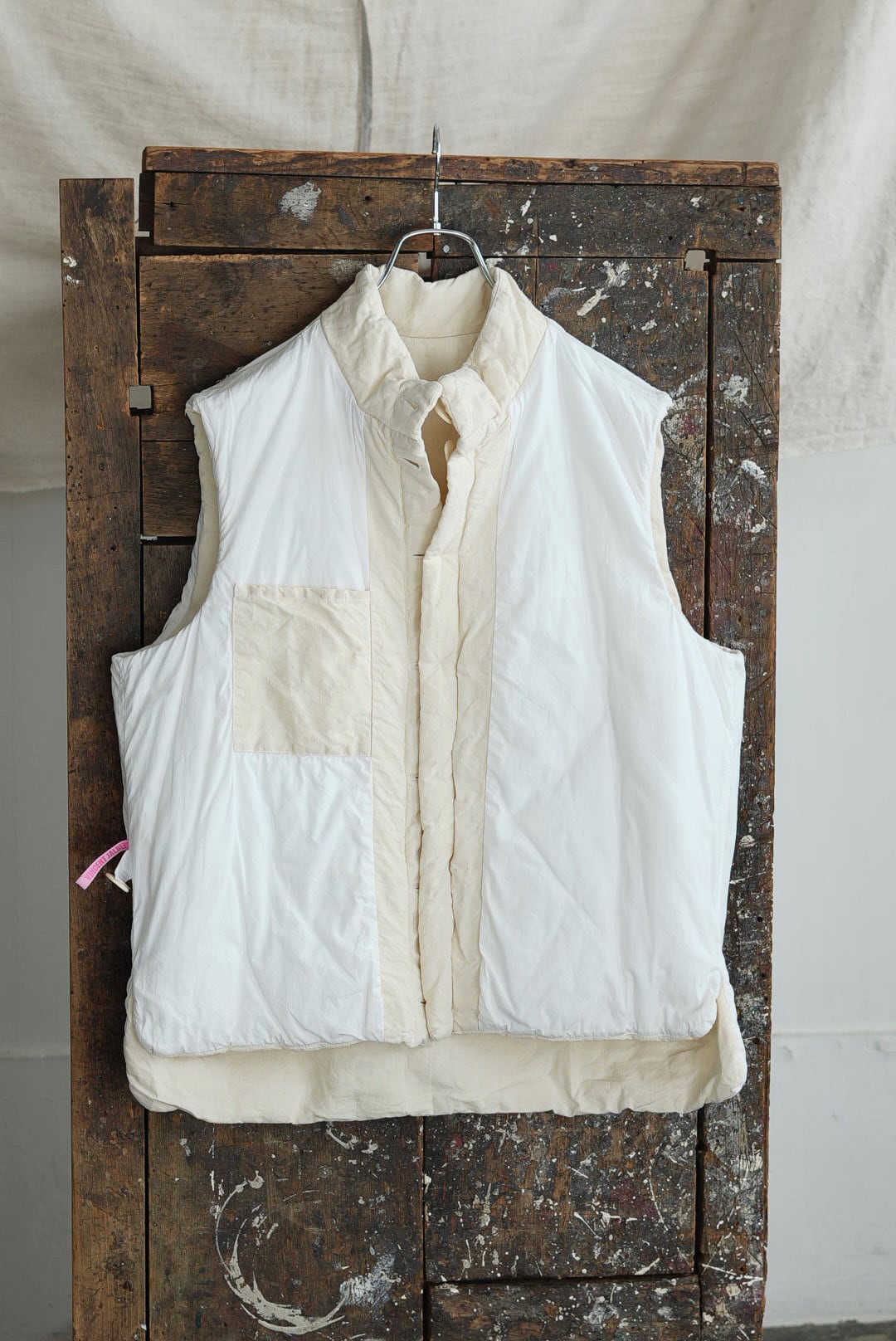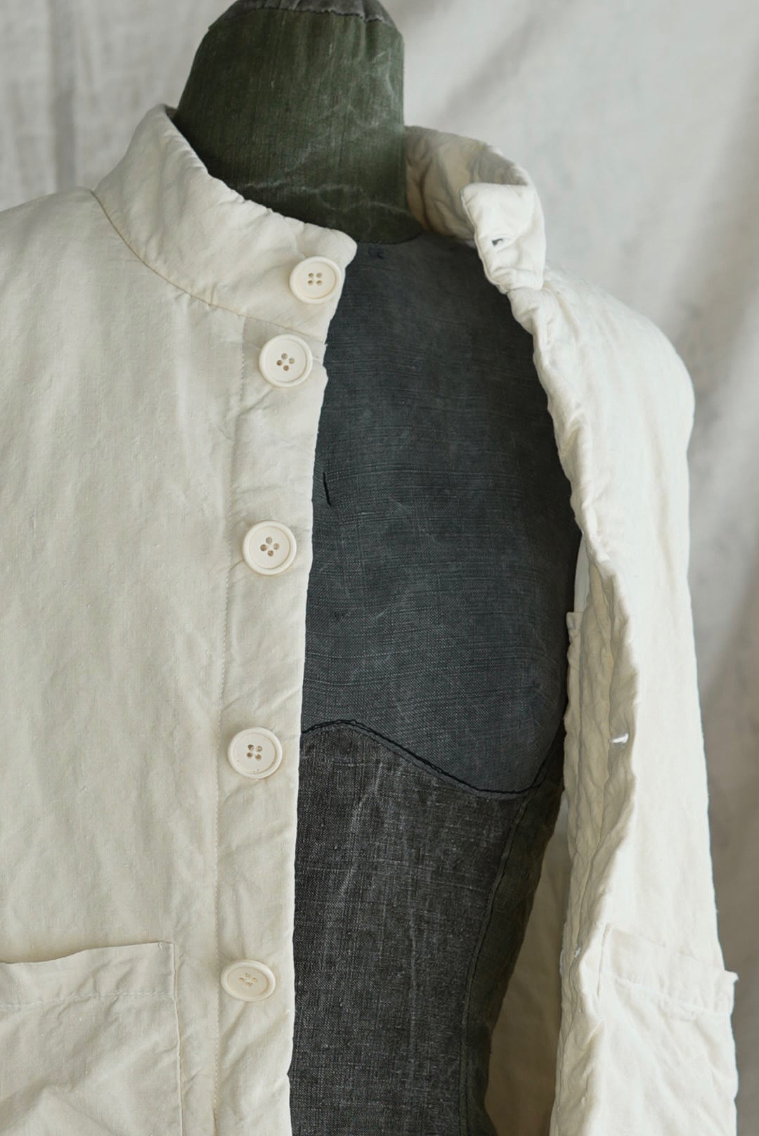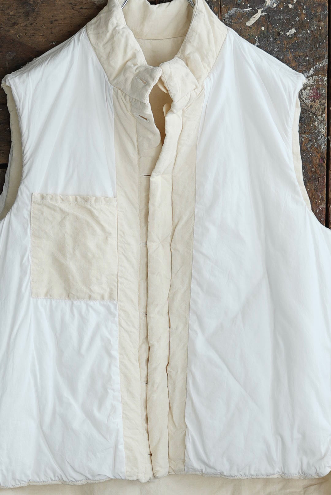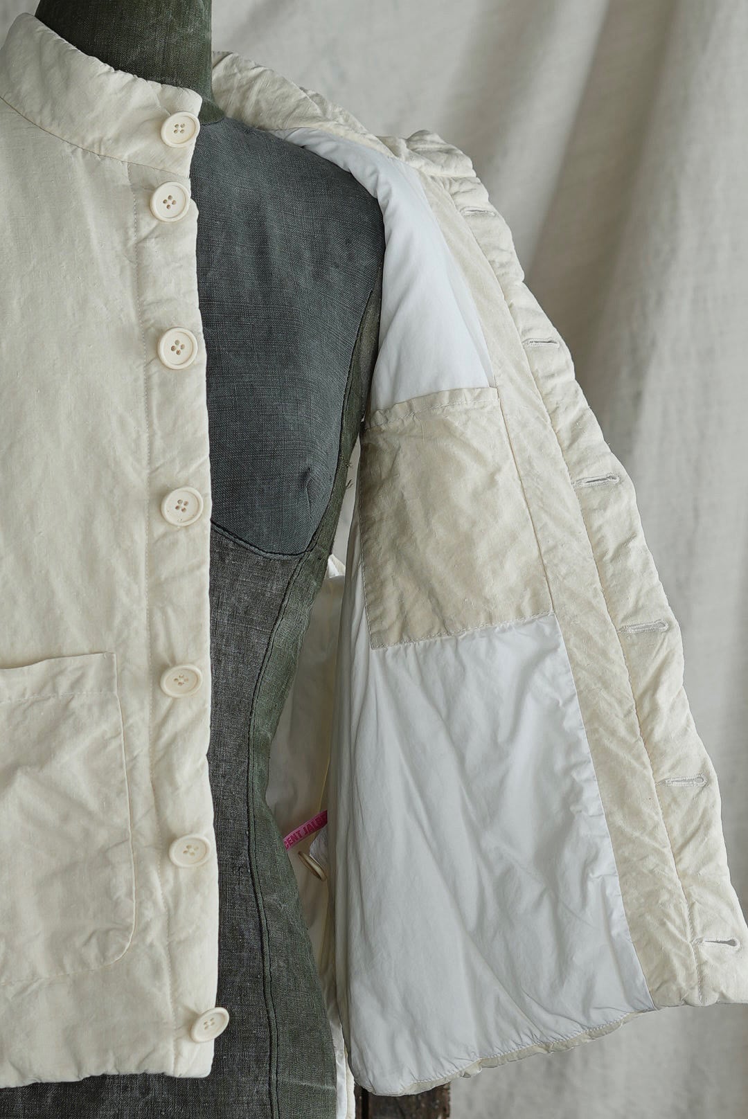 コンパクトなスタンドネックのアーマーベスト。ボタン留めのシックなデザイン。前後段違いのレングスはシャツ・スウェット・ニットはもちろん、ジャケットやアウターともグッドバランスのレイヤードに。ブランドのシグネットファブリック、ヴィンテージフレンチリネン(20世紀初頭)を表地に使用。古布ならではのネップやスラブが浮かび、現代の統制された生地にはない、魅力的な表情を纏います。未染色、ヴィンテージの表情をダイレクトに楽しめるナチュラルカラー。肌当たりを考慮し、きめ細やかなイタリアンコットンポプリンをライニング。ポリエステルの中綿を全体にパデットさせた、膨らみのあるパフィーシルエット。ソフトでライトな着心地に加え、空気を溜め込む性質を持つリネン繊維と相まって高い保温力も備わります。