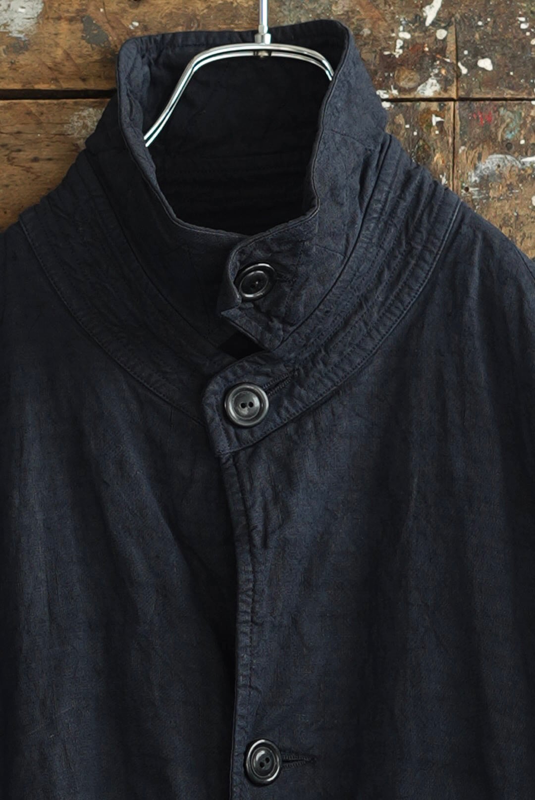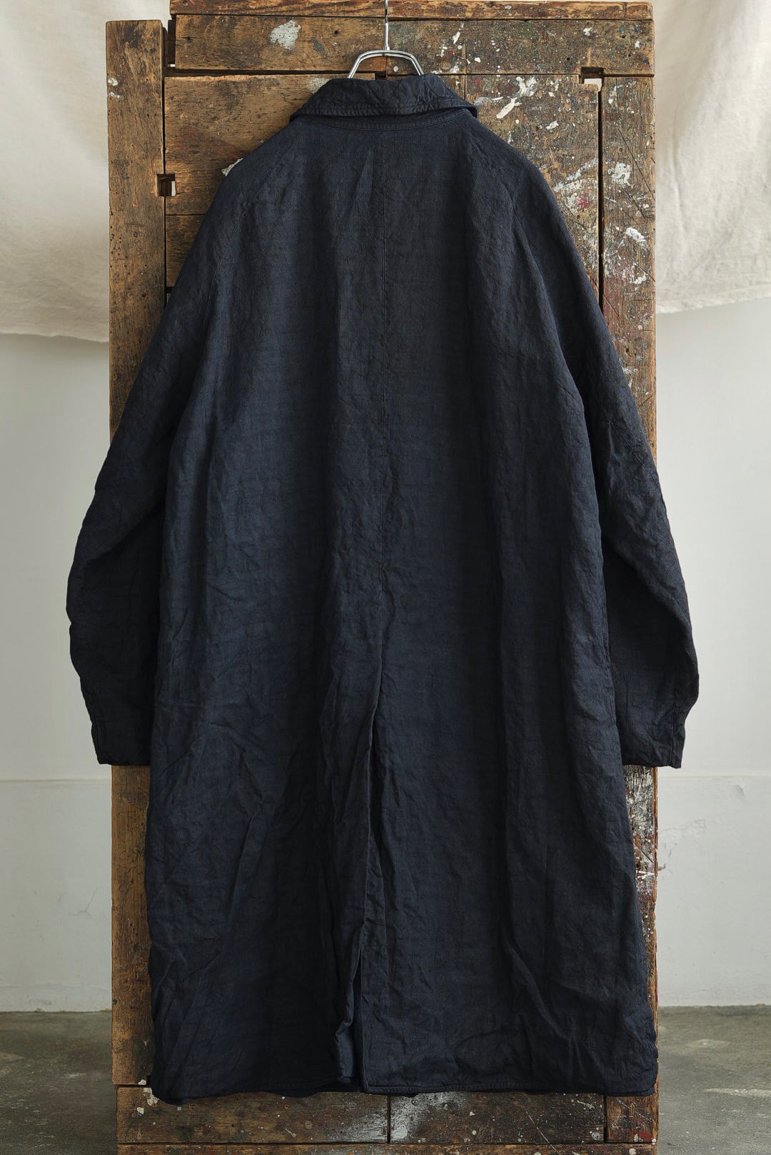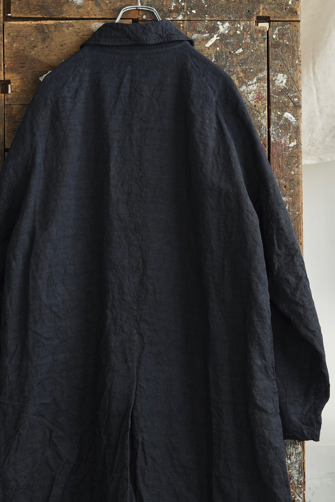 「Chez VIDALENC」のシグネチャーアイテム、ラグランスリーブの「ボビコート」。それぞれに個性があり、ひとつとして同じ物が存在しないアンティックフレンチリネン。現行の統制された物では表現できない、ホームスパンならではのネップやスラブが自然な表情として製品に存在感をもたらします。着用を重ねることで風合いを増してゆき、着用者の身体に馴染み、時を経て各々のヴィンテージとなっていく存在のファブリックです。カラーはアプローチが面白い「BLACK & BLUE」。「50% BLACK & 50% BLUE」の比率で調合した染料を用い製品染めの工程へ。仕上がりはアンティックリネンが持つ各々のキャラクターに委ねられます。マテリアル自体の特性や織りの打ち込み具合によって、黒と青への傾倒(浸透)具合は様々です。要所にさり気なく同色でおとすステッチのアクセント。センターベント仕様、深いベントは動きの中で軽やかさを演出します。襟のボタンを留めスタンドカラーとしてもスタイリング可能です。袖通りの良いコットンファブリックをフルライニング。防風性にも一役買い、年間を通して長期間の着用にも◎。内側に2箇所パッチポケット。