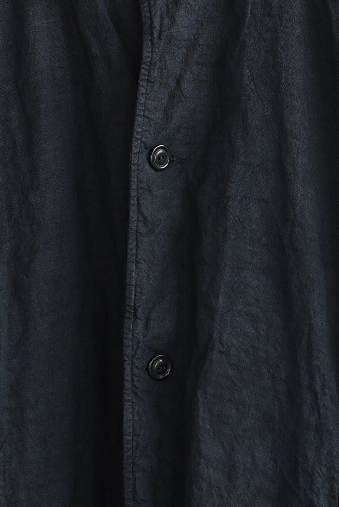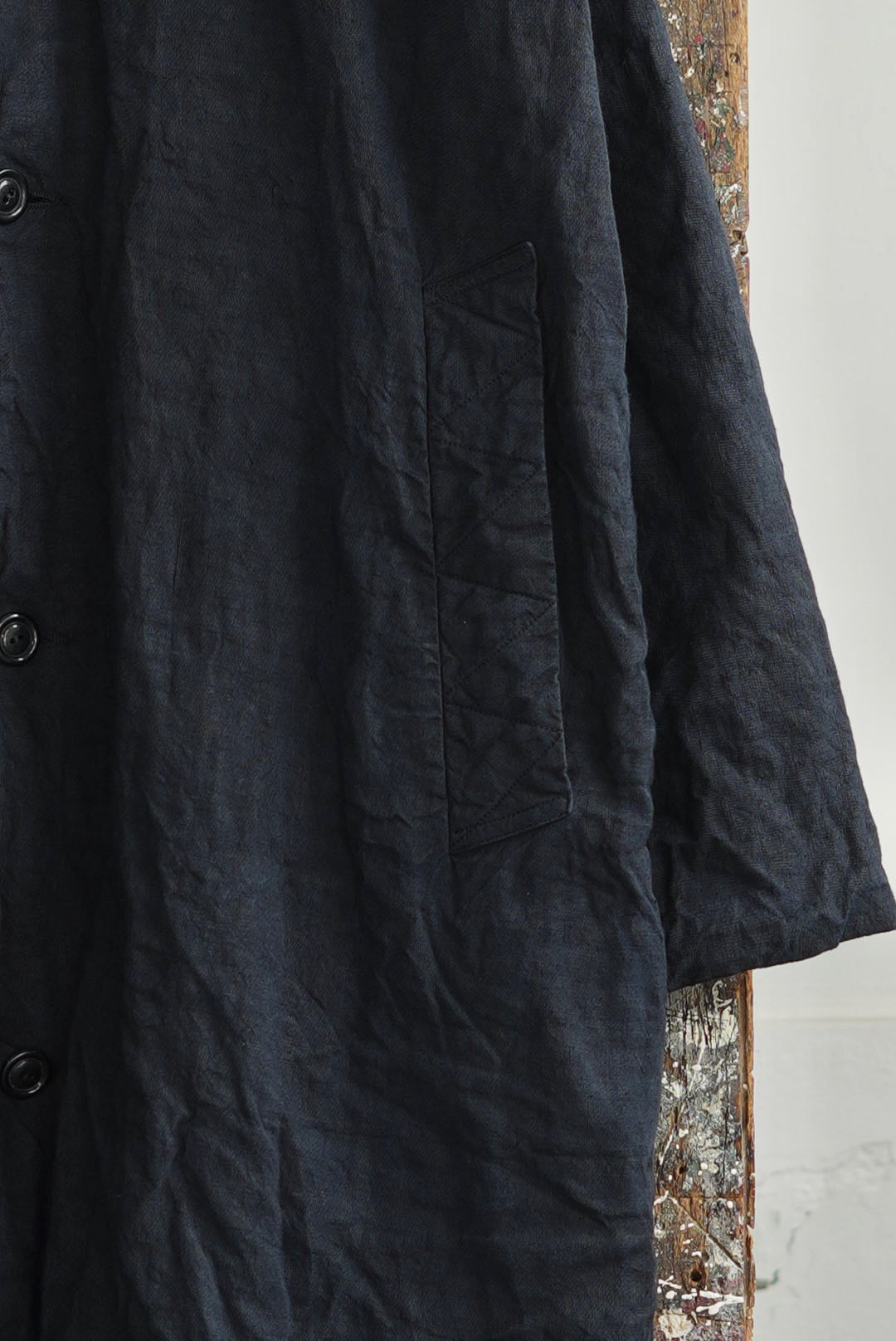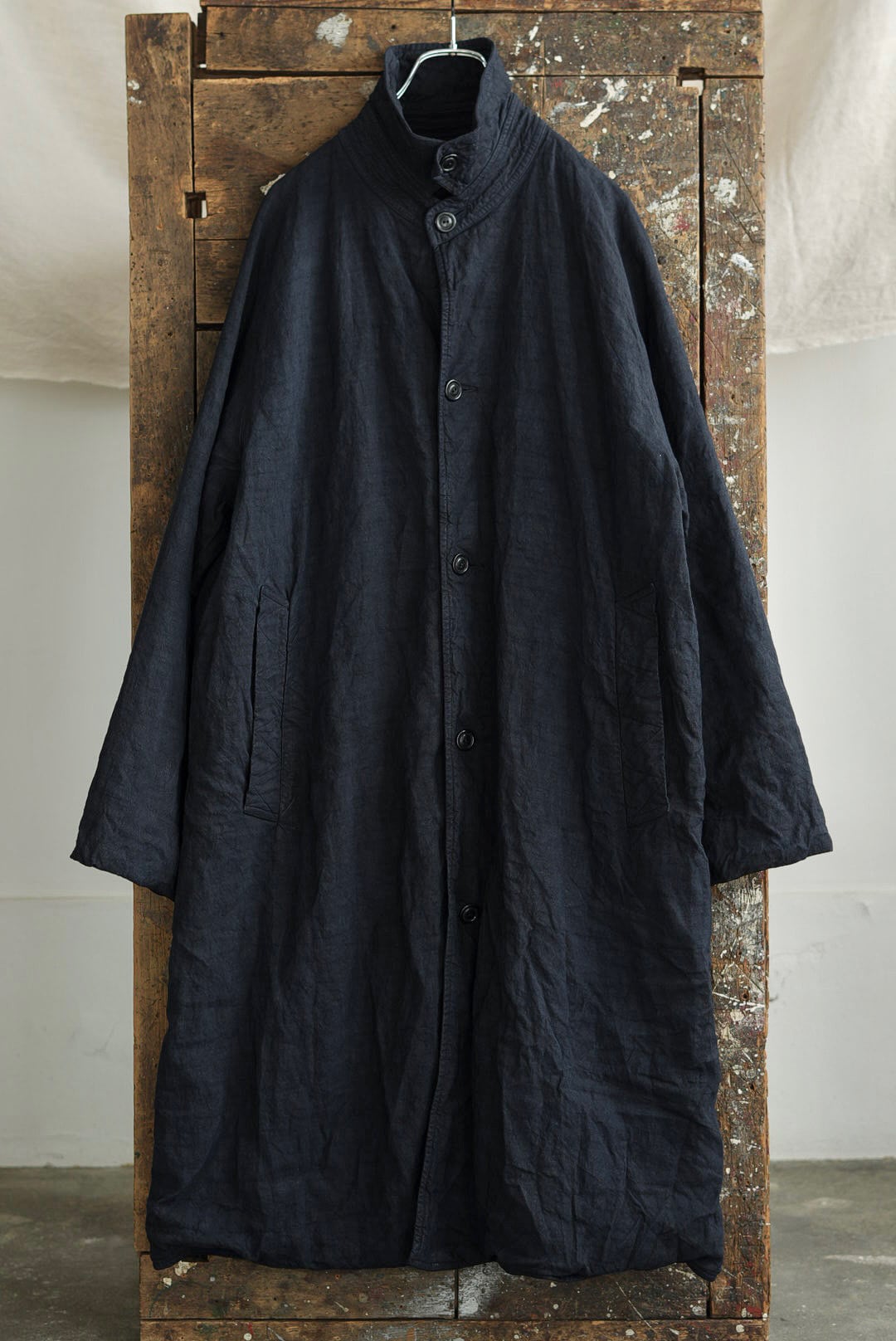 「Chez VIDALENC」のシグネチャーアイテム、ラグランスリーブの「ボビコート」。それぞれに個性があり、ひとつとして同じ物が存在しないアンティックフレンチリネン。現行の統制された物では表現できない、ホームスパンならではのネップやスラブが自然な表情として製品に存在感をもたらします。着用を重ねることで風合いを増してゆき、着用者の身体に馴染み、時を経て各々のヴィンテージとなっていく存在のファブリックです。カラーはアプローチが面白い「BLACK & BLUE」。「50% BLACK & 50% BLUE」の比率で調合した染料を用い製品染めの工程へ。仕上がりはアンティックリネンが持つ各々のキャラクターに委ねられます。マテリアル自体の特性や織りの打ち込み具合によって、黒と青への傾倒(浸透)具合は様々です。要所にさり気なく同色でおとすステッチのアクセント。センターベント仕様、深いベントは動きの中で軽やかさを演出します。襟のボタンを留めスタンドカラーとしてもスタイリング可能です。袖通りの良いコットンファブリックをフルライニング。防風性にも一役買い、年間を通して長期間の着用にも◎。内側に2箇所パッチポケット。